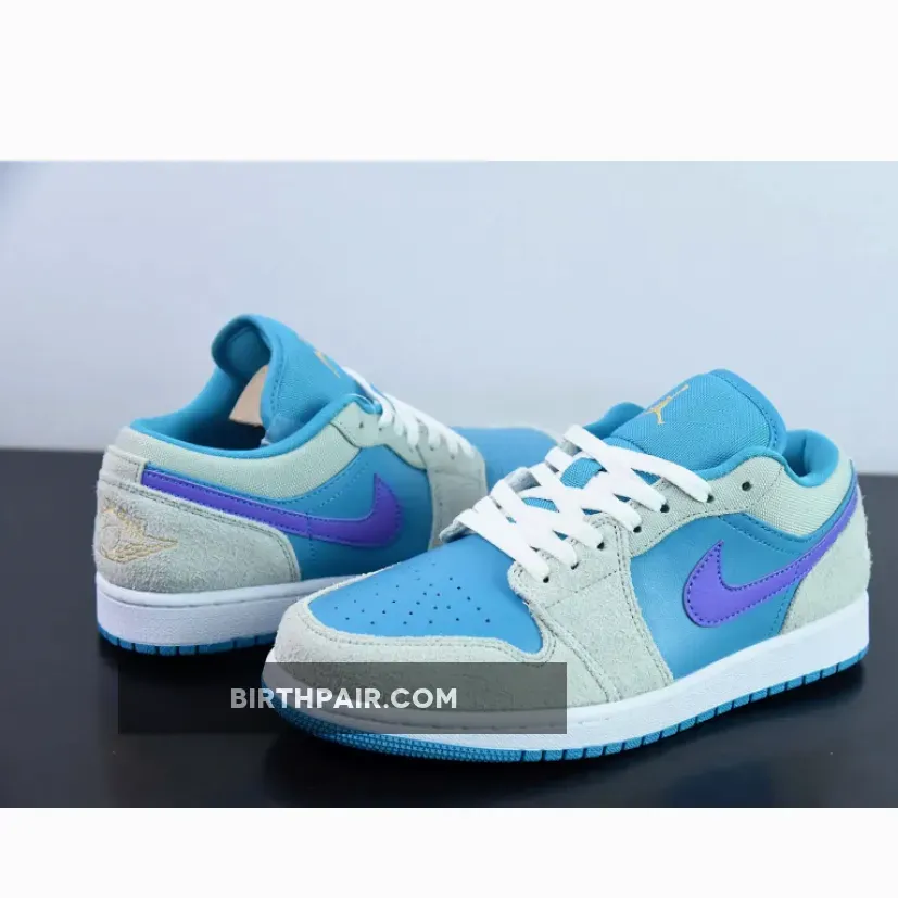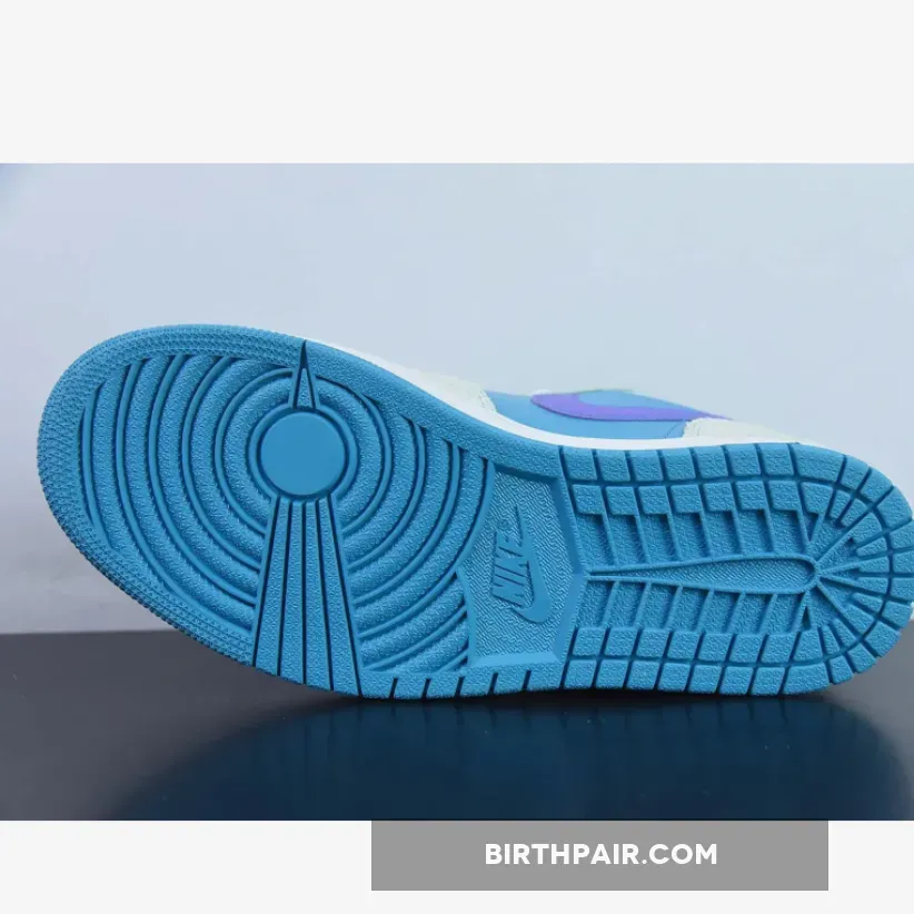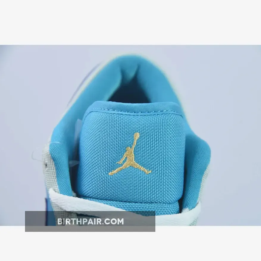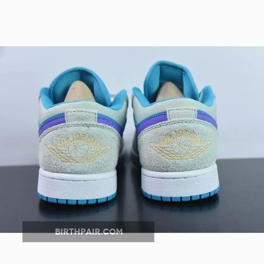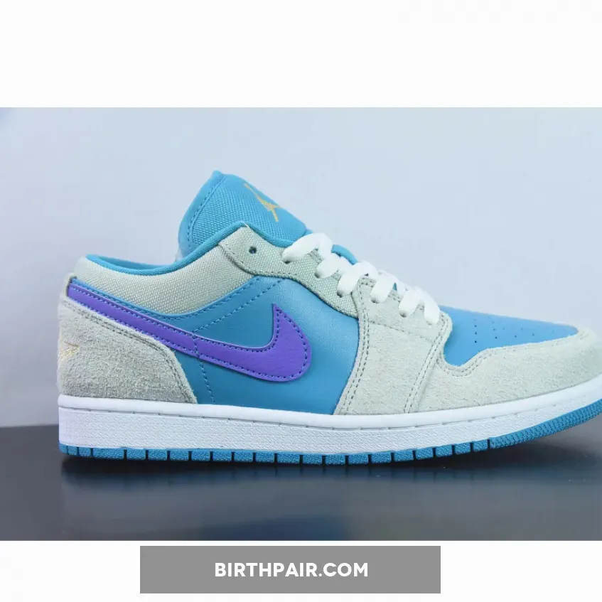 The Jordan Brand’s iconic basketball sneaker to first feature the legendary Jumpman logo, the Air Jordan 1, has a new variation that features multiple materials and a delightful mix of sky blue, indigo and grey. Take a closer look at the Air Jordan 1 Low Blue Grey Purple. This low-cut AJ1 has a vibrant sky blue on the smooth leather base showing on the toe box and the mid-panels. The mesh tongue and sock liner are also in the same shade. Hairy grey suede overlays, on the other hand, can be found on the toe cap, mudguard and heel counter. The mesh eye stay panel and collar also follow suit. Indigo-looking purple signature profile Swooshes sweep across both the medial and lateral mid-panels. An embroidered Celestial Gold Jumpman adorns the tongue while an embroidered Celestial Gold Wings logo sits on the heel spine.