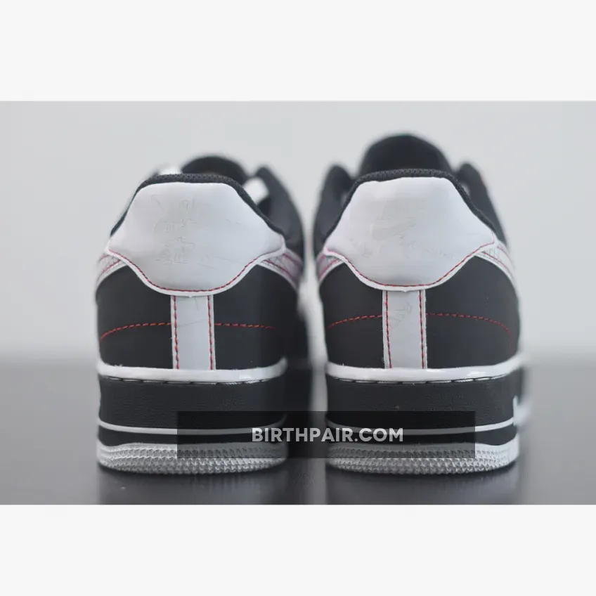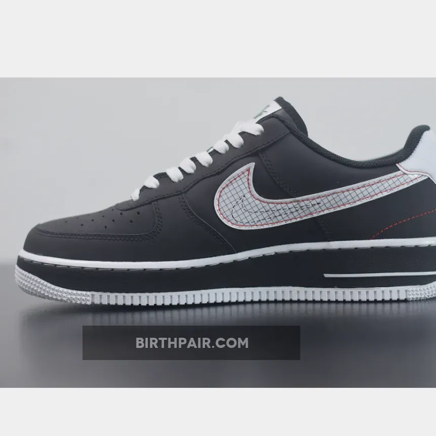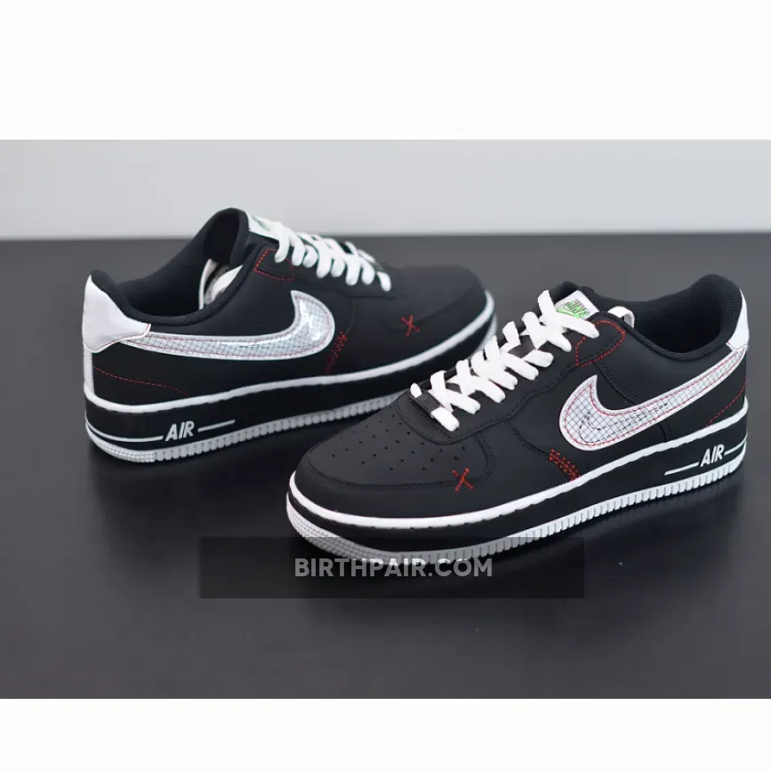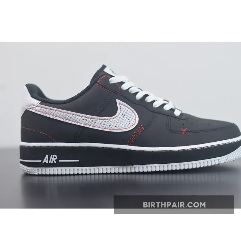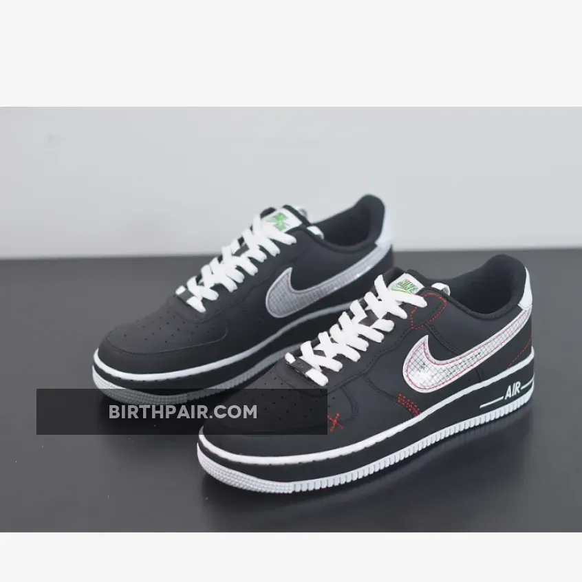 Starting at the top of the shoes, a woven “Nike Air” tab in “Green Strike” has been placed at the tongue, followed by clean white laces that cover the forefoot. Contrasting the shoe’s black leather base, bright red top-stitching outlines the gridded white Swoosh on the sidewalls, riding up towards the rear and tracing the edges of the heel counter and backstay. While these stitches follow the edges of certain panels, the shoe is detailed in other places as well, like the trapezoid at the upper eyelet, zig-zags at the mid-section and “X” mark at the toe box.