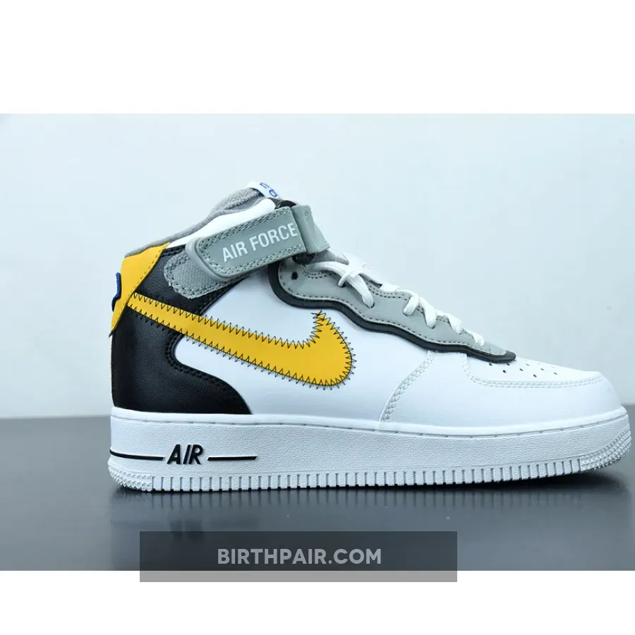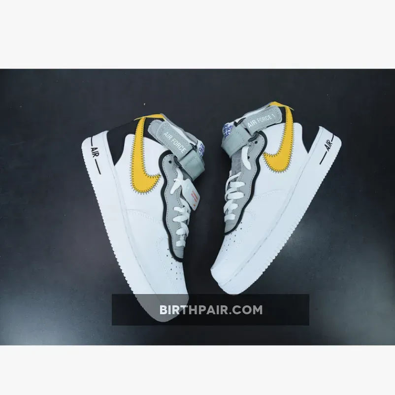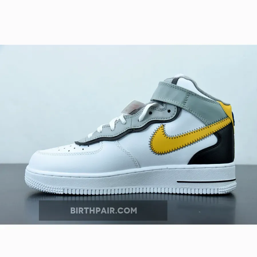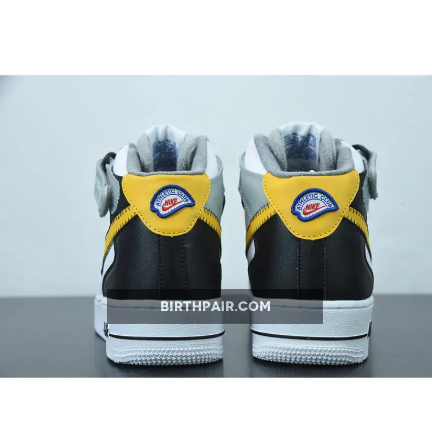 This Nike Air Force 1 Mid has a White leather base while Black lands on the overlays on the heel. Next, Yellow appears on the Swoosh logos and heel, and the eyestay is layered. You can also see exposed stitching on the Swoosh and ankle strap while the retro Nike Athletic Club logo hits the tongue, insole, and patch on the heel. Lastly, a White midsole and rubber outsole finishes the look.