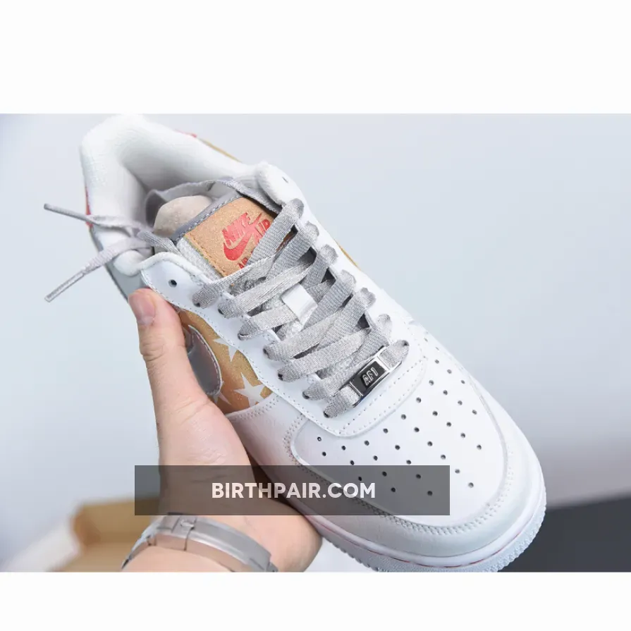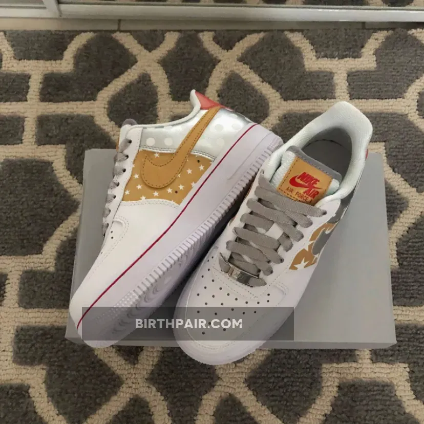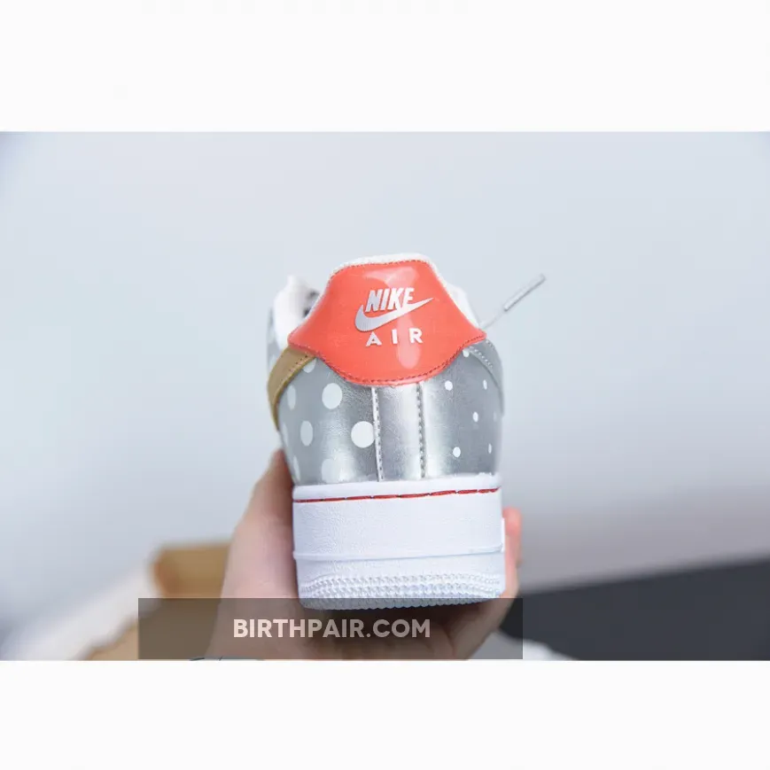 the pair shows off a mostly reserved palette with unassuming tans and oranges sitting at both edges of the more standout silver metallic plastered along the heel wrap and swoosh. These, which bear an almost foil-like texture, are emblazoned with polka dots throughout, lying adjacent to a similarly fashioned graphic with stars in replacement. Stitching along the foxing match the aforementioned warm tone while not taking on the same holographic finish that houses the inner Nike Air logo.