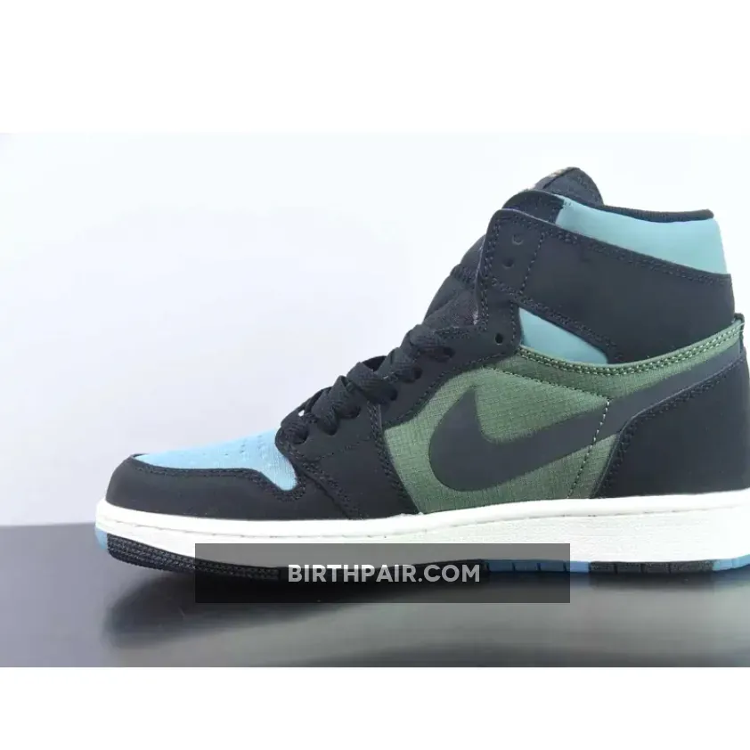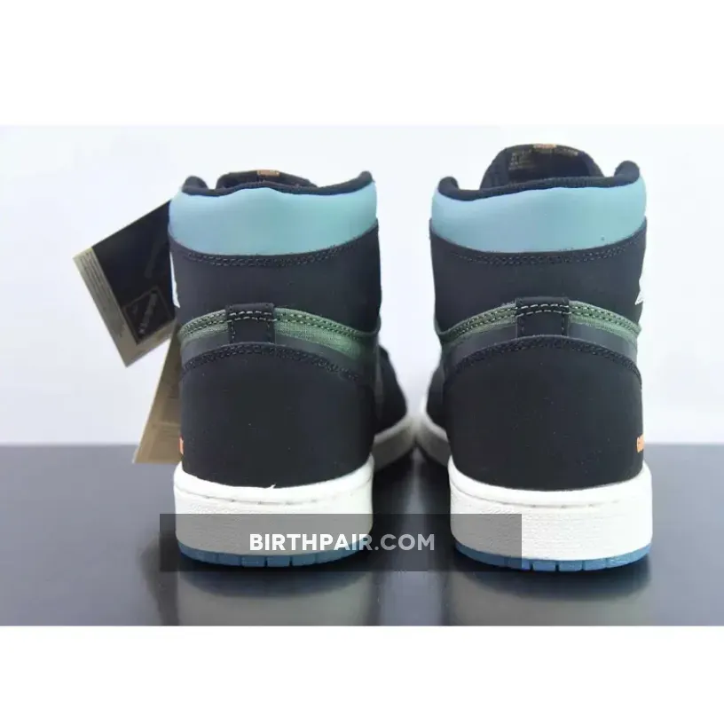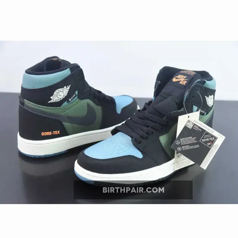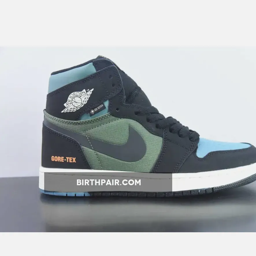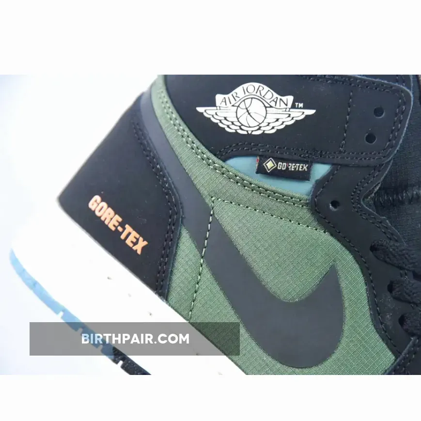The winterised Jordan 1 starts with a blue ripstop mesh vamp with olive green ripstop fabrics encompassing the quarter panels. Nubuck and nylon materials come together across Peter Moore’s design in a familiar, but updated way. Meanwhile, black nubuck leather overlays wrap most of the upper, juxtaposed with a blue nubuck collar and a white Jordan Wings symbol on the lateral. “GORE-TEX” text are stamped onto the lateral heel, marking the sneaker’s protection against the elements. Bright orange accents illuminate the Nike Air labels on the tongue, while co-branding on the sockliners arranges a complementing blue and orange hue. The sail white midsole adds a touch of vintage that harkens back to the silhouette’s ‘80s origins. The pair also features an experimental, “deconstructed” aesthetic that works well with the toughness of the Element GORE-TEX makeover. Underfoot, the outsole opts for a partly transparent finish that increases grip in tough conditions.