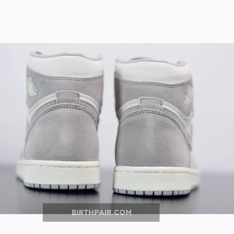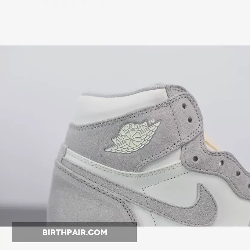 Dressed in a mix of leather and suede, grey suede wraps over a cream leather, showing off Nike Swoosh branding to the sidewall of the Jordan 1 High Premium Ivory Womens, Air Jordan logo to the side of the high top and the iconic Jumpman on the tongue of the sneaker.