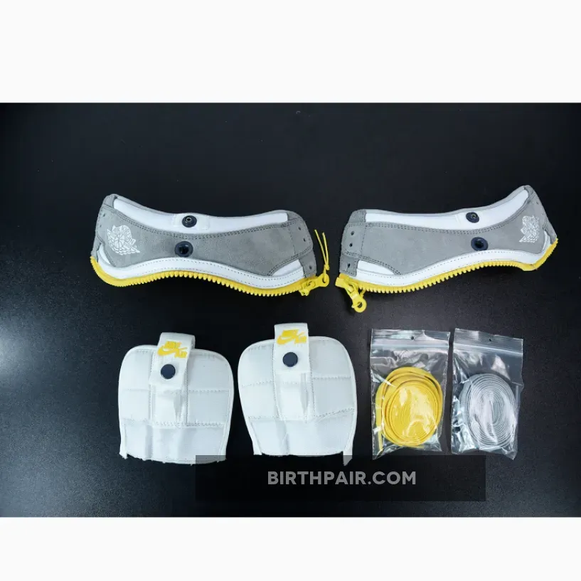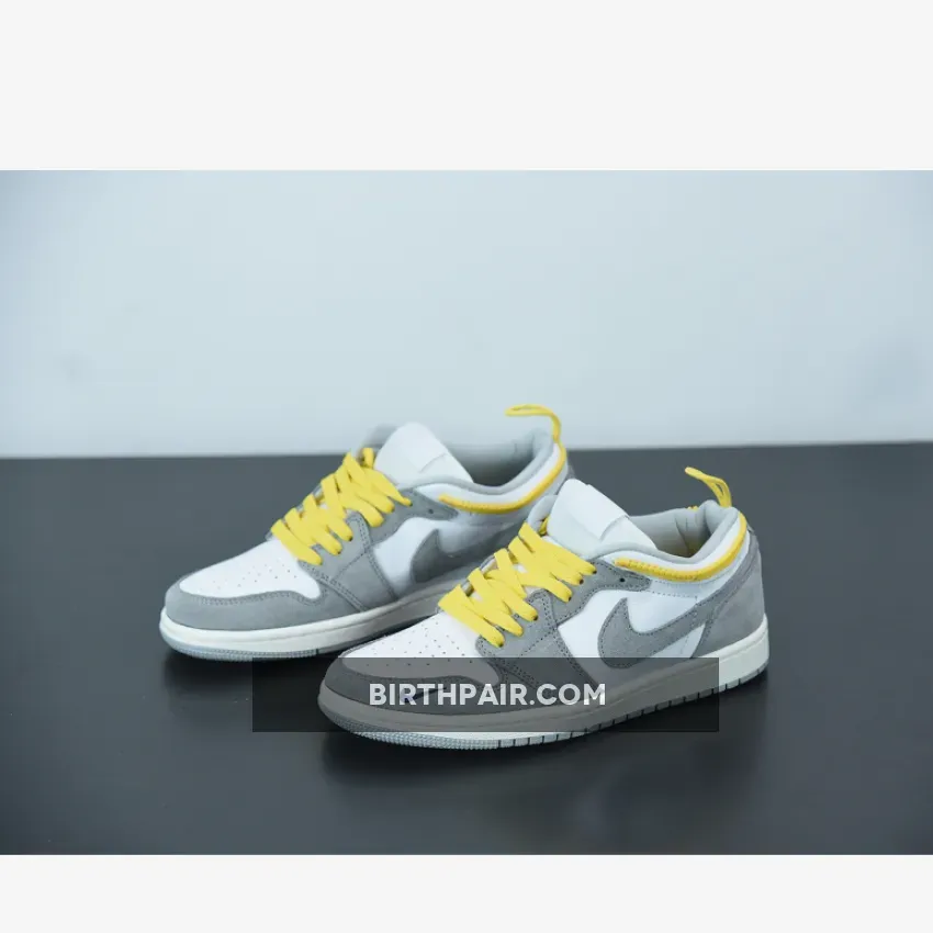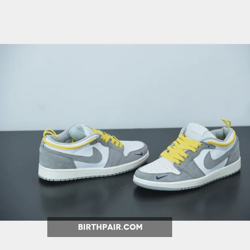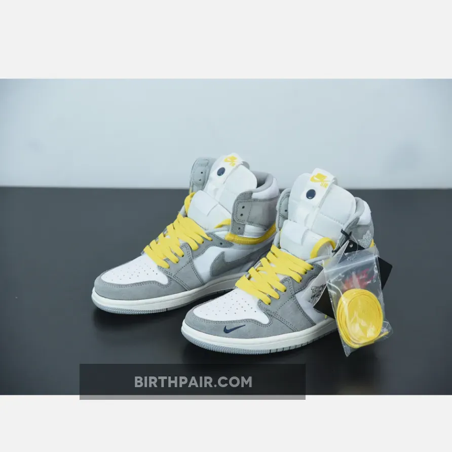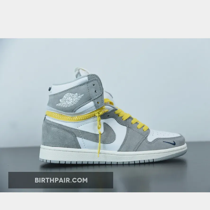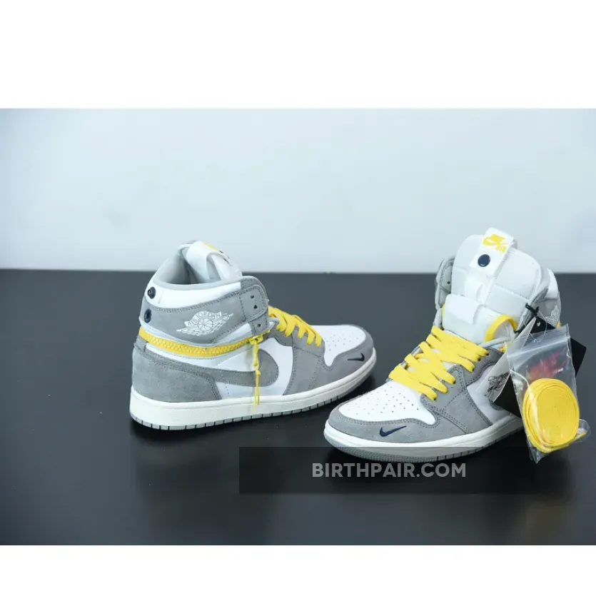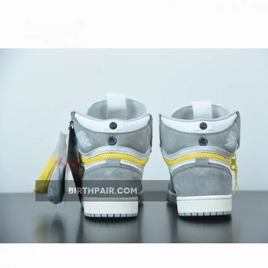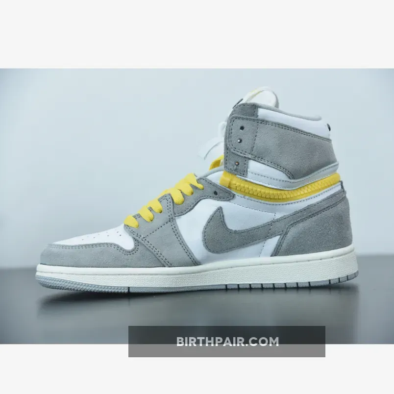 Dressed in a White, Light Smoke Grey, Sail, and Tour Yellow color scheme. The shoe features a zippered ankle collar that allows you to wear the pair as a high or low. This Air Jordan 1 Switch features a White leather base with Light Smoke Grey suede overlays. Black mini embroidered Swoosh on the toe, Yellow laces, zipper, and heel pull tab atop a Sail midsole and Grey rubber outsole completes the design.