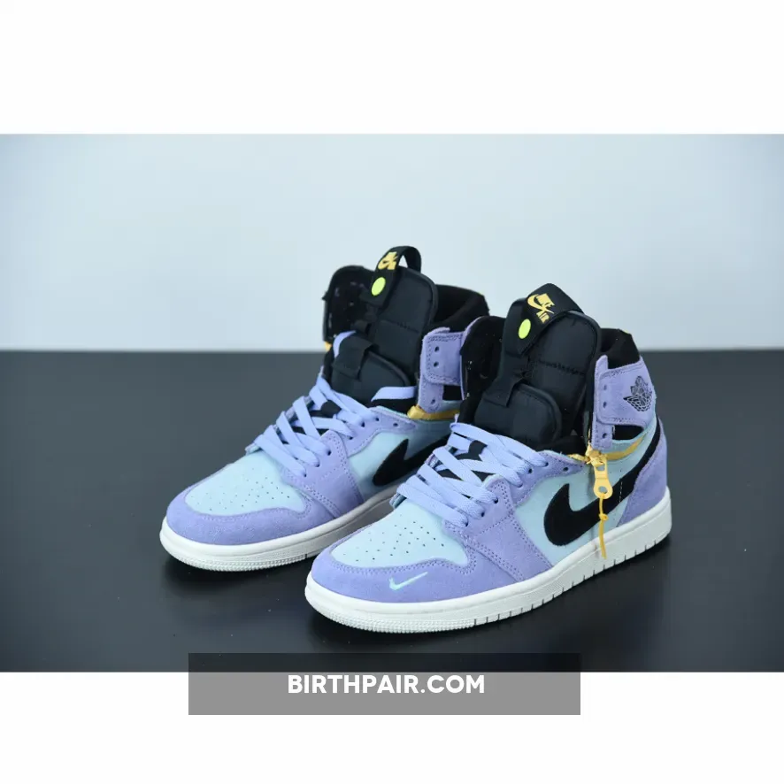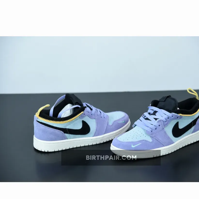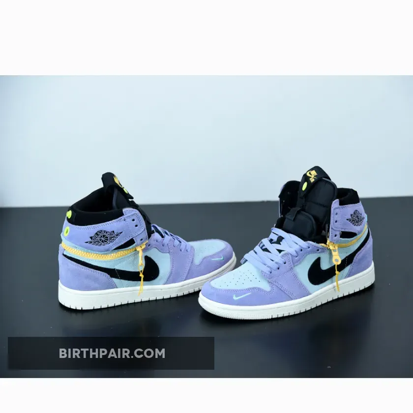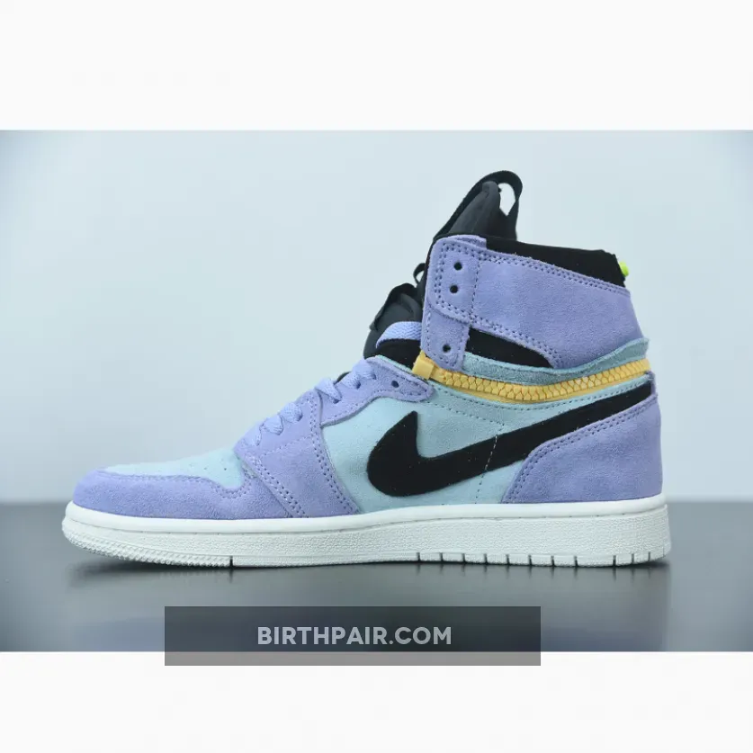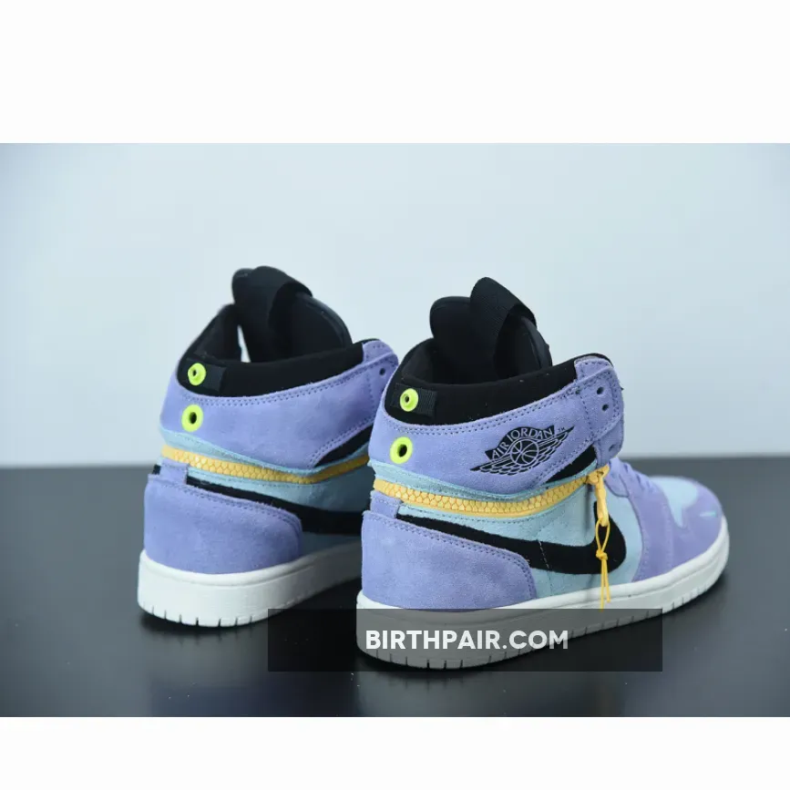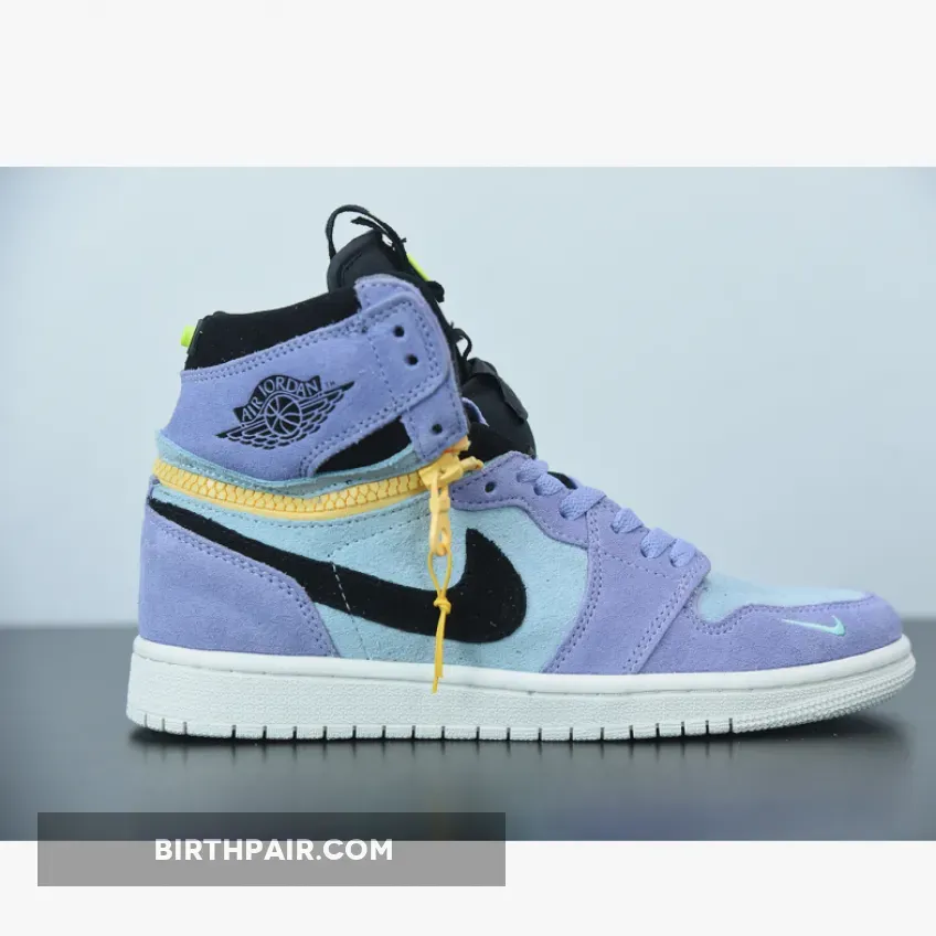 One of the pairs that will be available comes dressed in a Purple Pulse, Glacier Blue, Sail, and Black color scheme. This Air Jordan 1 features a zippered ankle collar that allows you to wear the pair as a high or low. The shoe comes in full suede featuring a Glacier Blue upper with Purple Pulse overlays. Black covers the ankle area, tongues, Wings and Swoosh logos with a Yellow zipper and heel pull tab. Blue also appears on the mini embroidered Swoosh on the toe completed with a Sail rubber outsole.