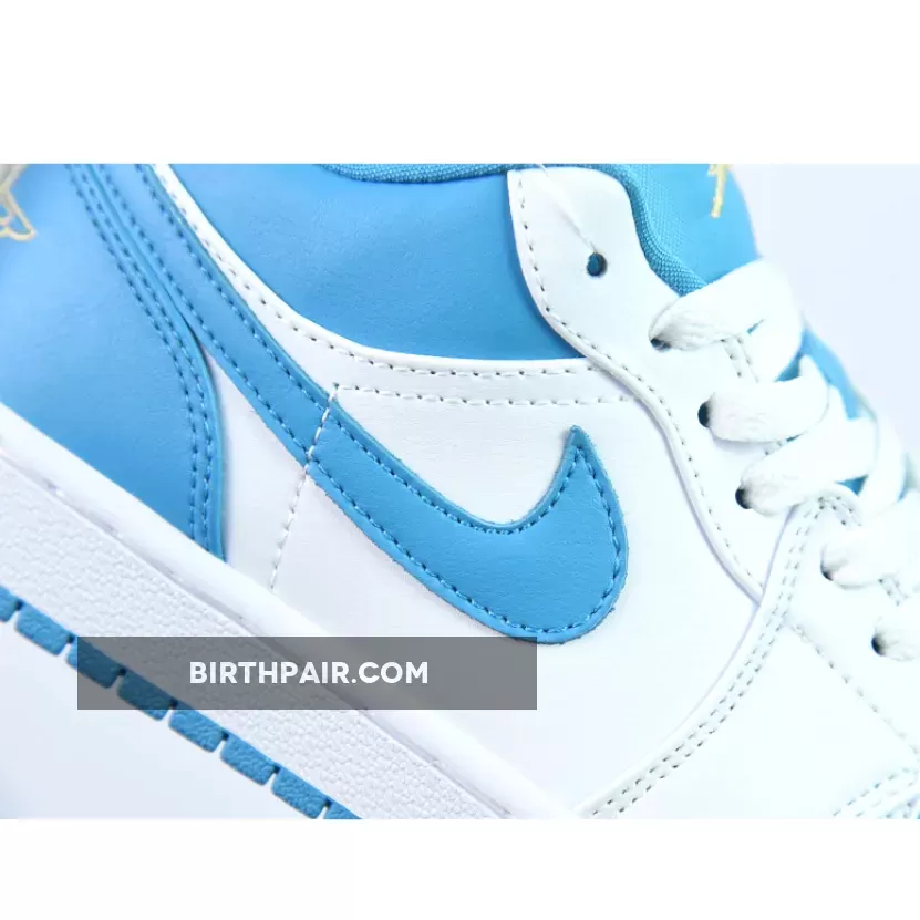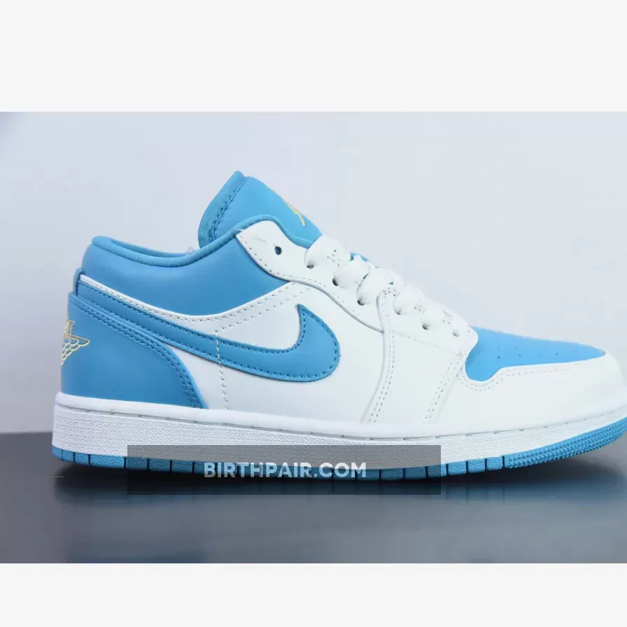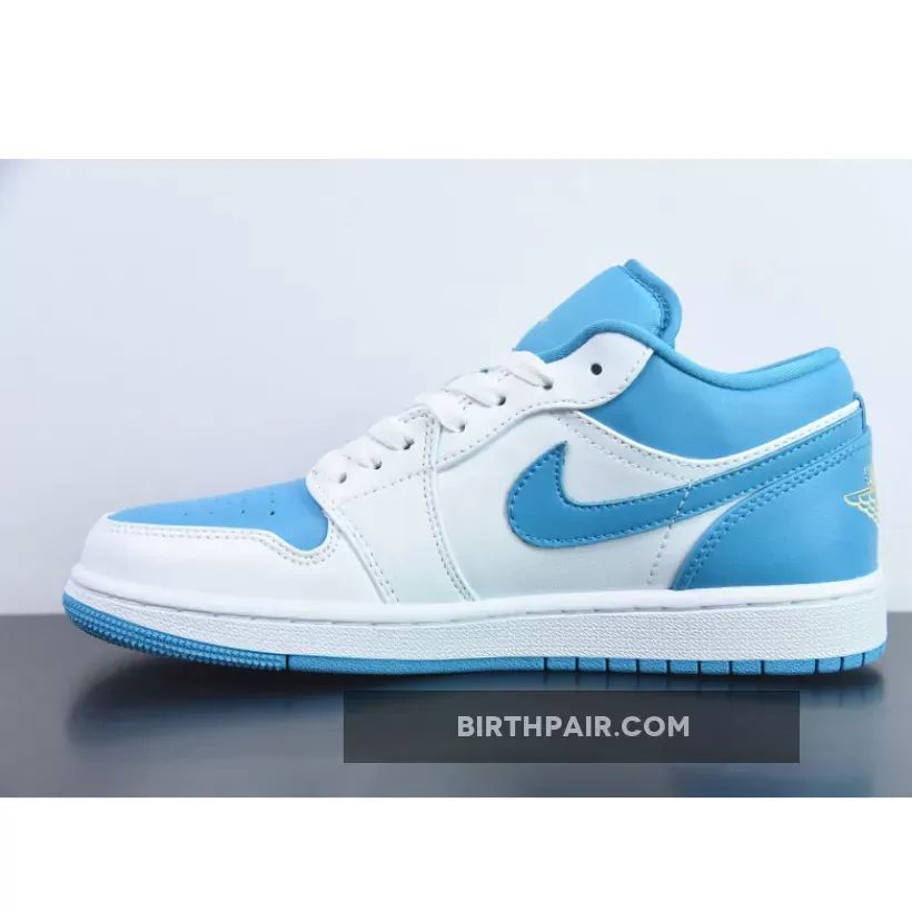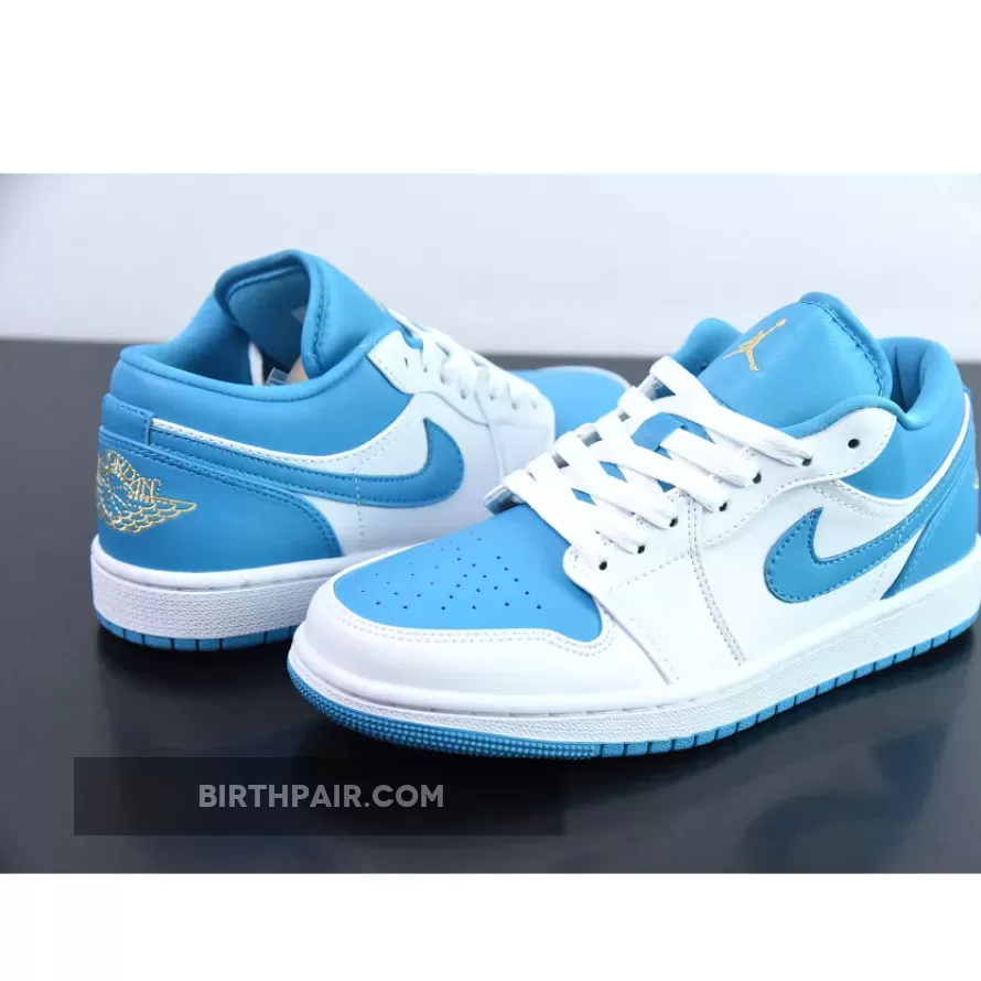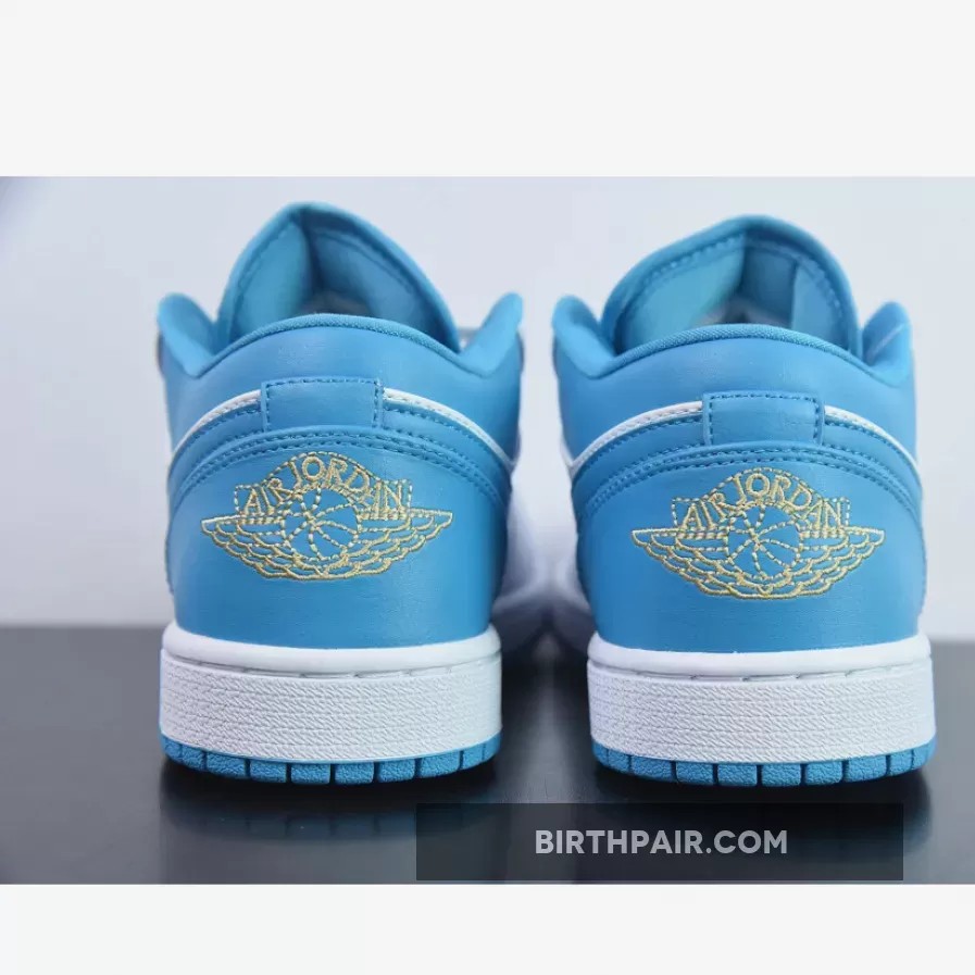 Dressed in a Aquatone, Celestial Gold, and White color scheme. This offering of the Air Jordan 1 Low comes constructed in a full leather build with mesh tongues and lining. It features a White and Aqua base with Gold branding.