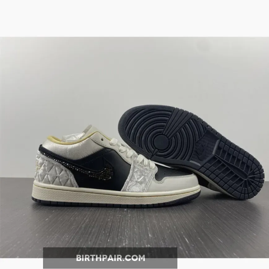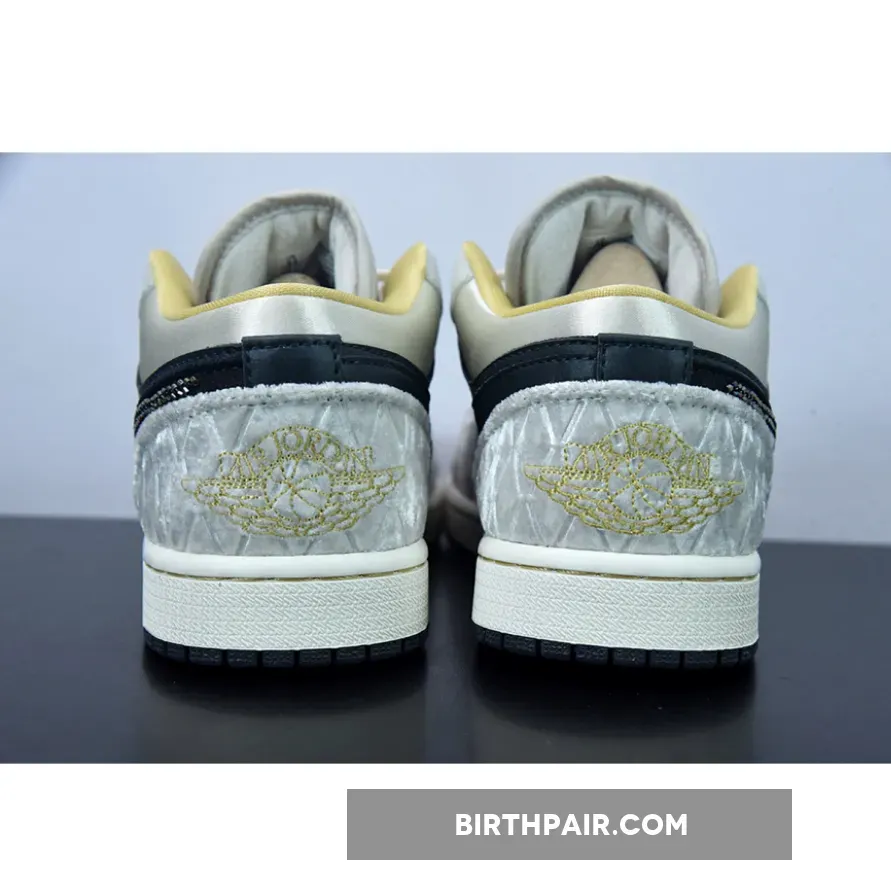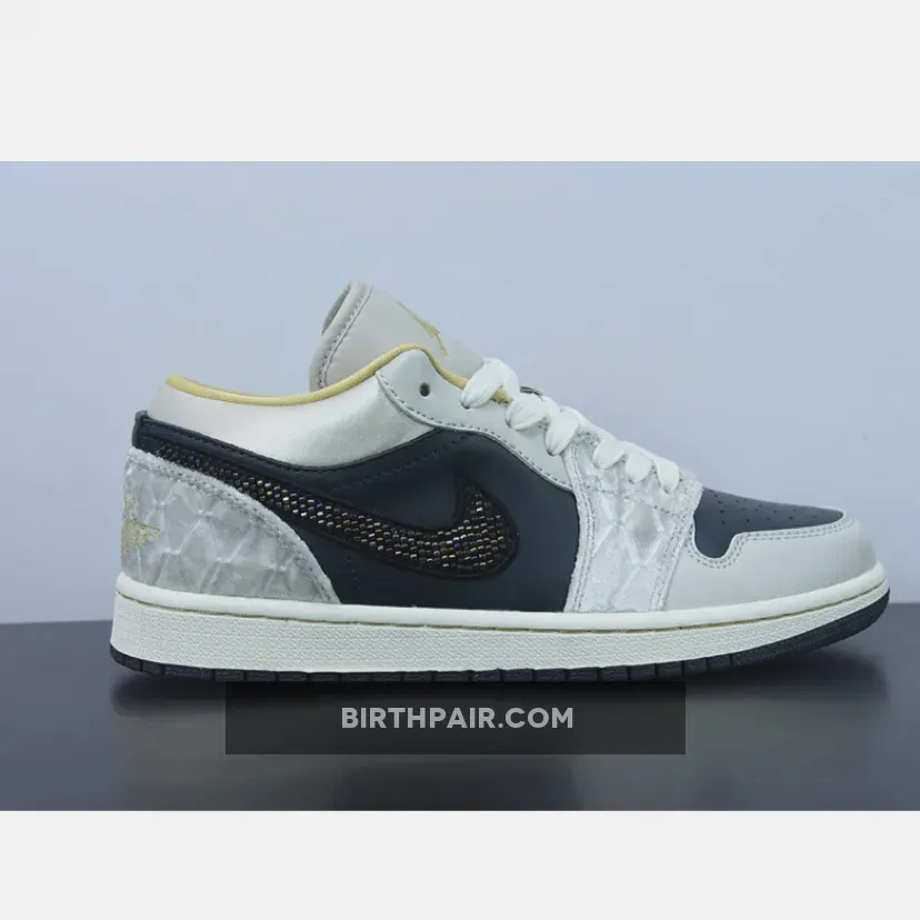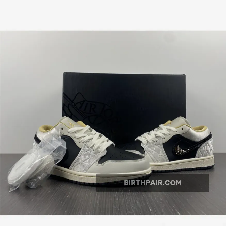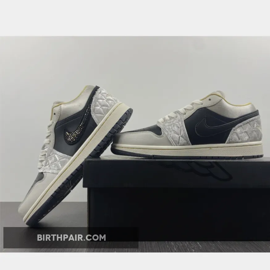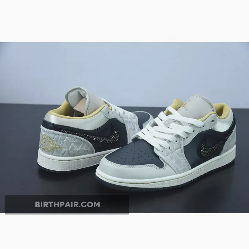 “I’m loving my new AJ1 Lows! The iridescent beaded Swoosh is so cool ?. The mix of leather, satin, and suede gives it a unique texture. Black, grey, and gold colorway is sleek and versatile. Comfortable fit and great traction on the sail midsole ?. Overall, I’m really pleased with this purchase ?.”