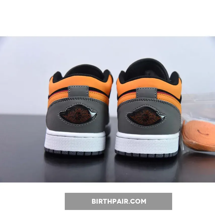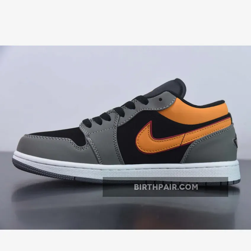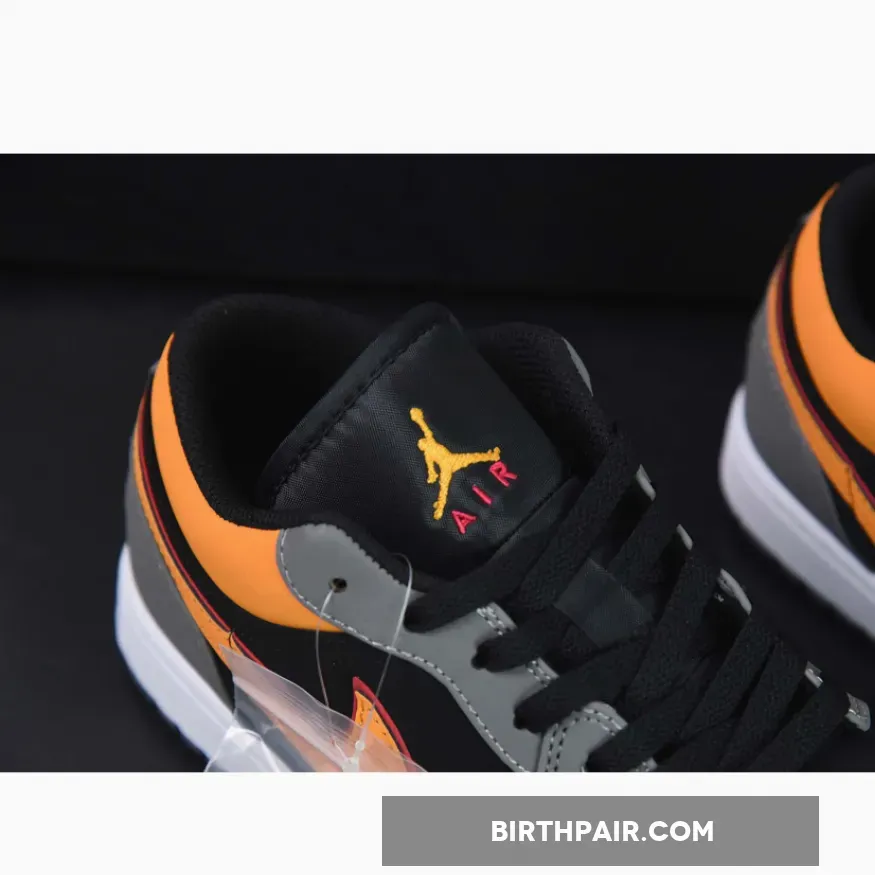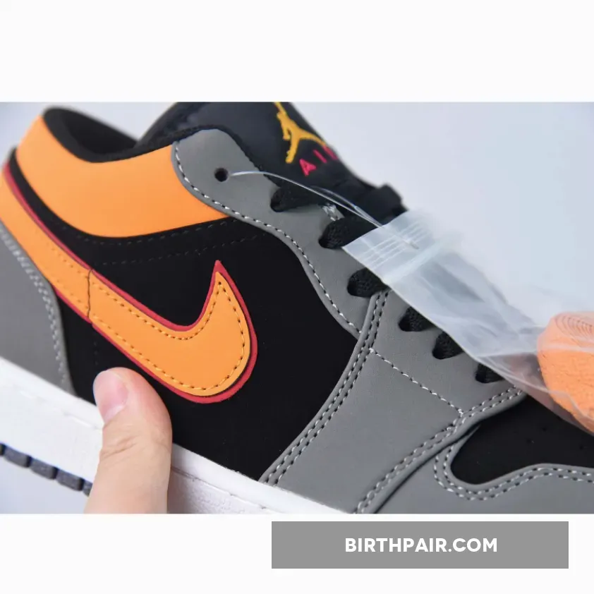 Done in an official color scheme listed as Black, Vivid Orange, Light Granite, Cardinal Red, White, this new iteration of the Air Jordan 1 Low is constructed in a mix of nubuck and leather alongside mesh used on the tongues and inner lining.