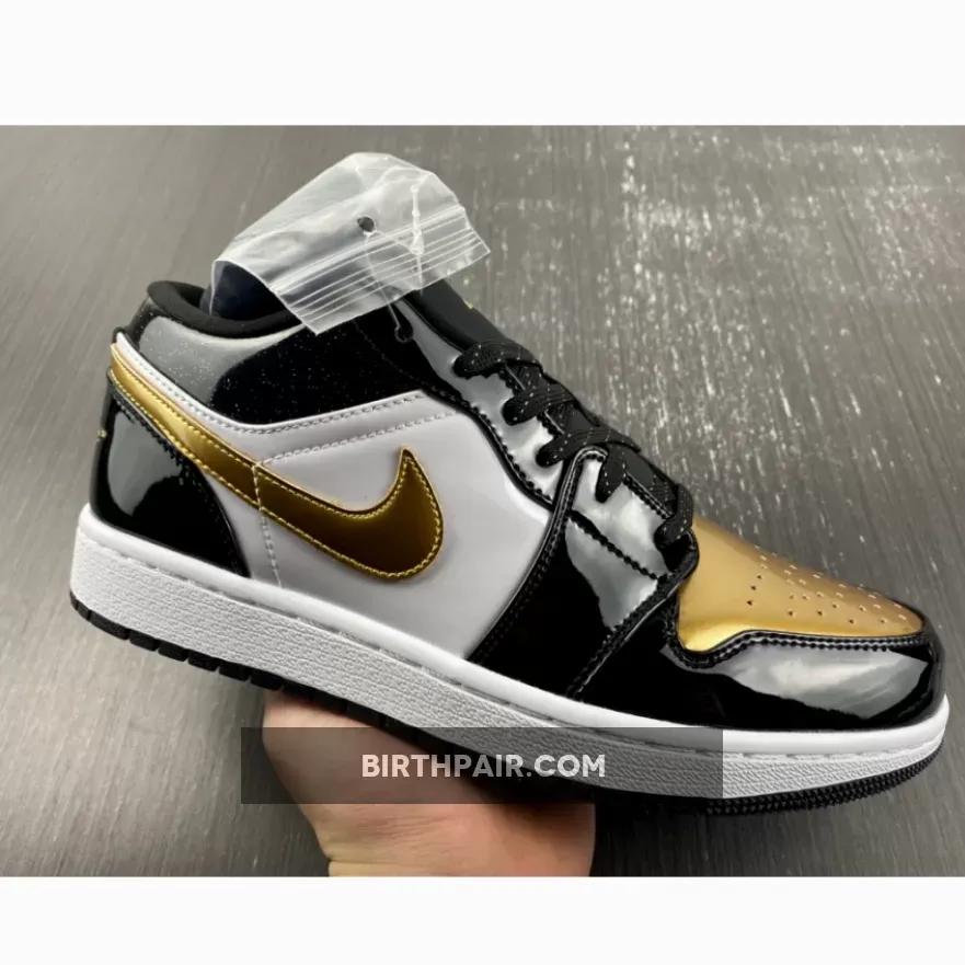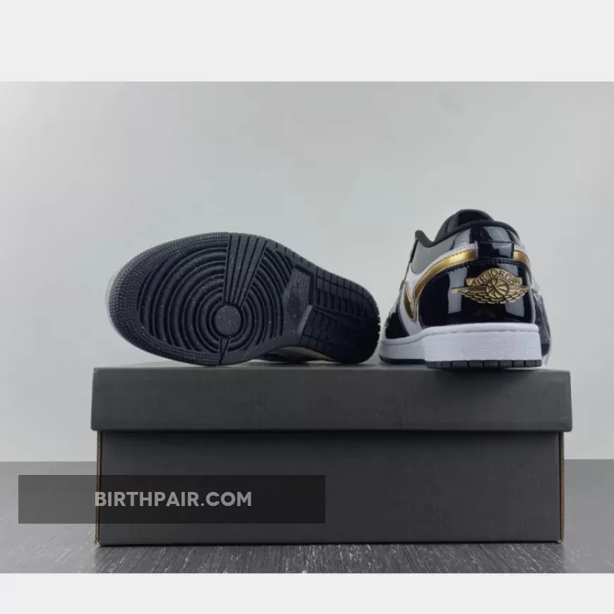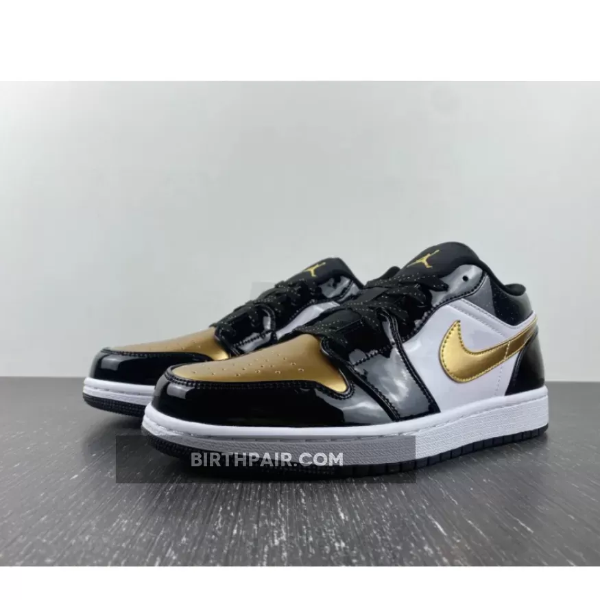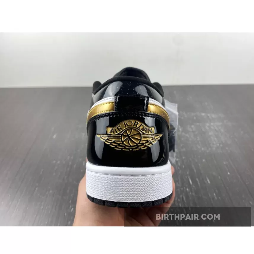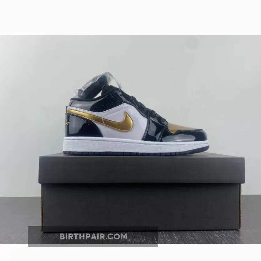 The Air Jordan 1 Low is a rotation staple and sometimes you need a little glamour in your life. This sneaker delivers both everyday wearability and a design that stands out from the crowd. Introducing the Air Jordan 1 Low GS Gold Toe. This AJ1 Low comes in smaller sizes for those with feet size 3 – 6. Patent leather dresses the overlays, with black covering the toe cap, eyelets, ankle and heel. Meanwhile, gold detailing adorns the Wings logo on the heel, Michael Jordan’s Jumpman at the top of the tongue, as well as Nike’s signature Swooshes on the medial and lateral sidewalls. Matching to this, the gold toe box comes perforated for enhanced breathability, whilst the ankle appears glittery.