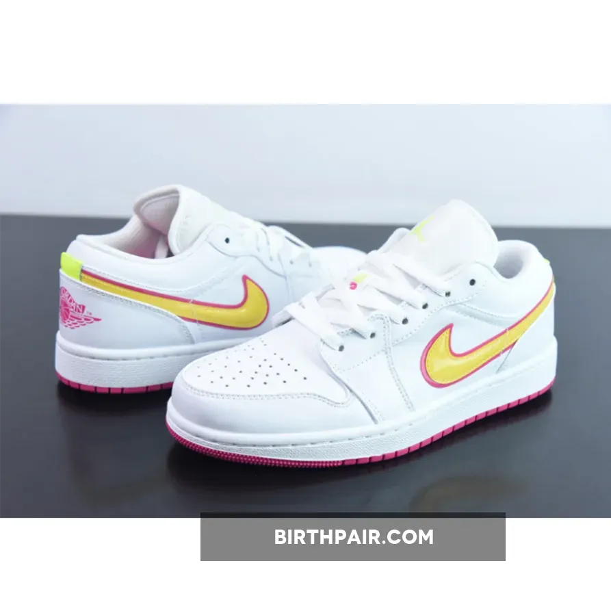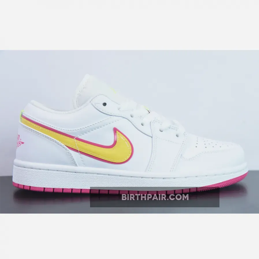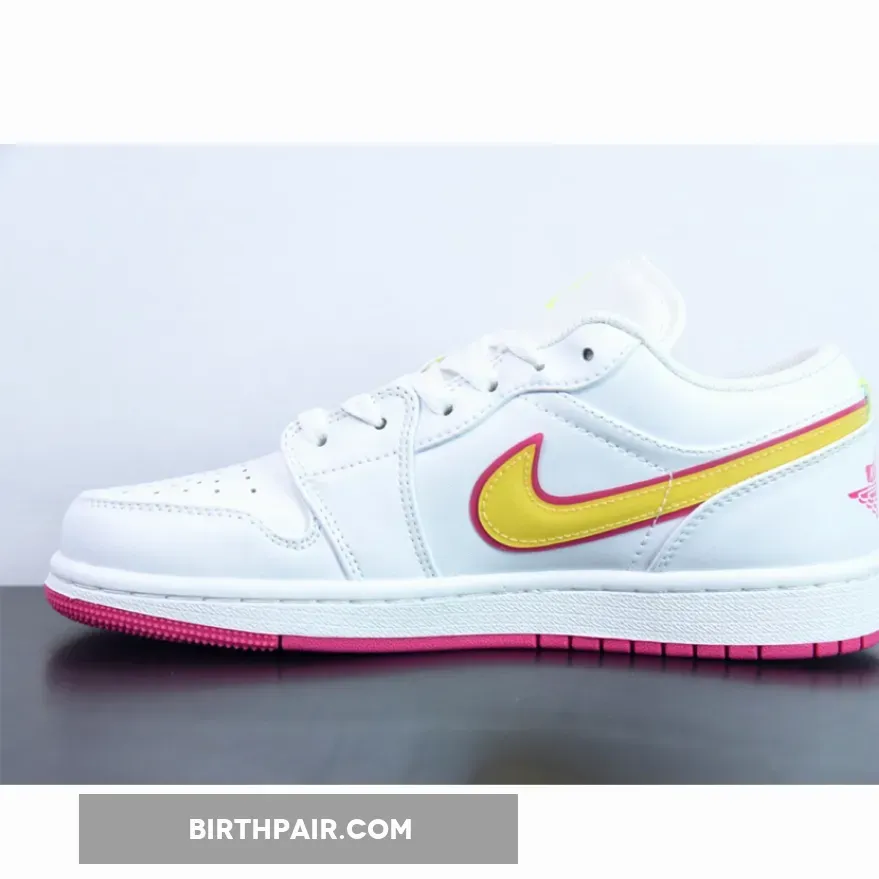 With a crazily high resale value, the Air Jordan 1 is a total investment. Not only that, it just keeps on coming up with the most punchy colourways. A case in point is the Air Jordan 1 Low GS White Yellow Pink. This smaller-sized AJ1 will remind you of rhubarb and custard on a clean white plate. The upper is clean and immaculate white smooth leather, from heel to toe. The most eye-catching details on this shoe are the uber-colourful profile Swooshes on both the medial and lateral sides of the shoe. The base layer of the Swoosh is a hot pink that creates an outline around the main Swoosh which is custard yellow. This same colour scheme can be found on the “23” eye stay accents and the Jumpman-branded insole. A vibrant yellow embroidered Jumpman stands out against the white nylon tongue.