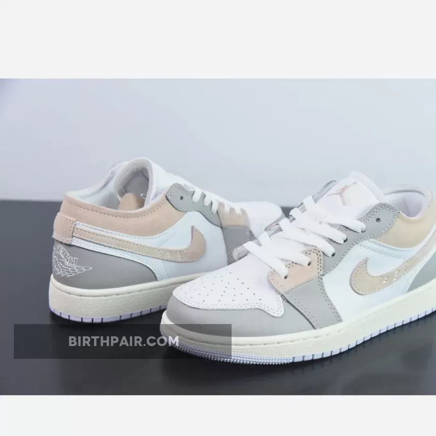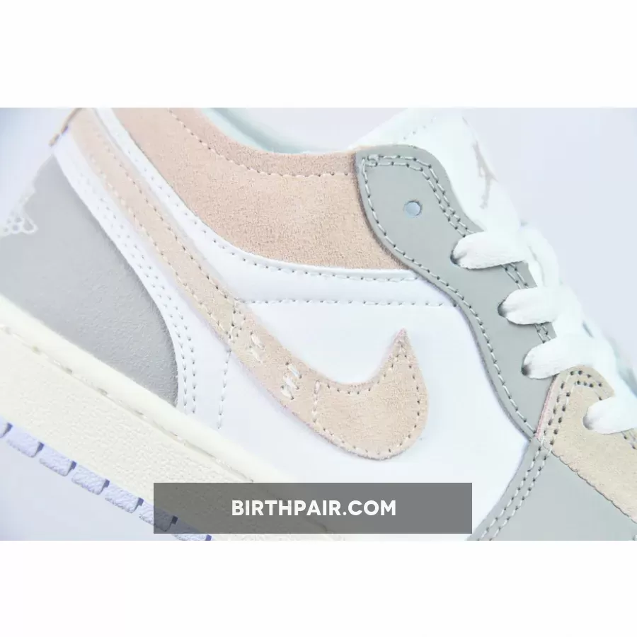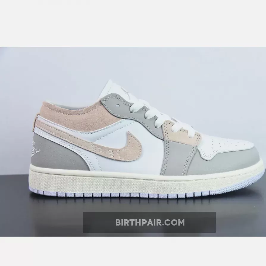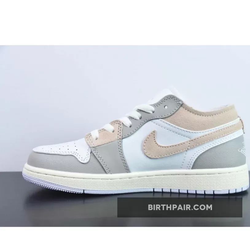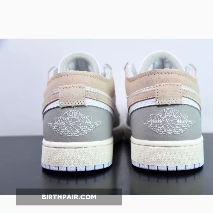 This Air Jordan 1 Low features a Tech Grey, Light Orewood Brown, White, and Sail color combination. This offering of the Air Jordan 1 Low comes constructed in a mix textile materials with exposed foam collars and tongues. #23 stitching displayed on the lateral Swoosh atop a Sail midsole and White rubber outsole completes the design.