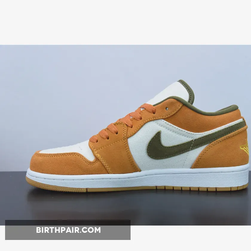 The Air Jordan 1 Low Orange Olive will convince you that pumpkin hues are seasonless. It starts with an off-white canvas base which serves as a crisp background for the burnt orange overlays at the toe cap, mudguard, eye stays, ankle and heel to stand out. Even the laces share the same muted ochre-like hue. Hints of olive green at the Nike Swoosh, tongue and counter lining complement well the other shades — making for a nice understated design that’s simple but never dull. Finally, rounding off the look of this Air Jordan 1 Low is the honey-coloured sole.