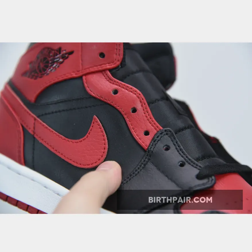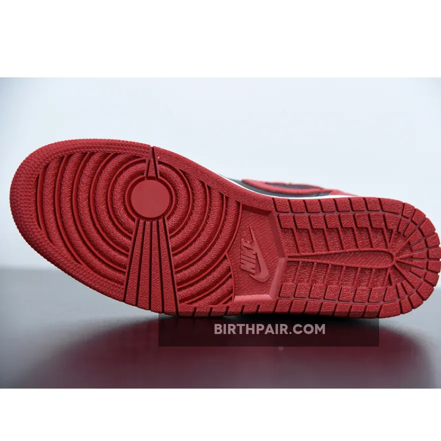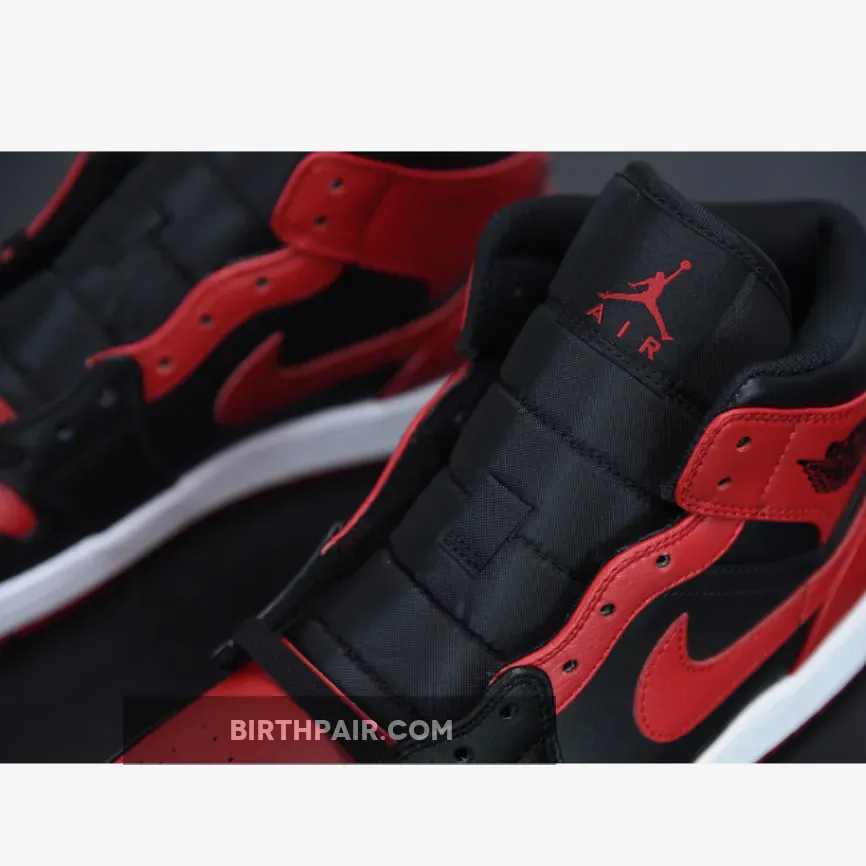 The Air Jordan 1 Mid Banned (2020) features full-grain black and red leather uppers. Similar to the original Air Jordan 1 Banned, hits of red leather on the toe, collar, heel, and Swoosh. The only difference from the original Banned colorway is the red leather around the eyelets.
