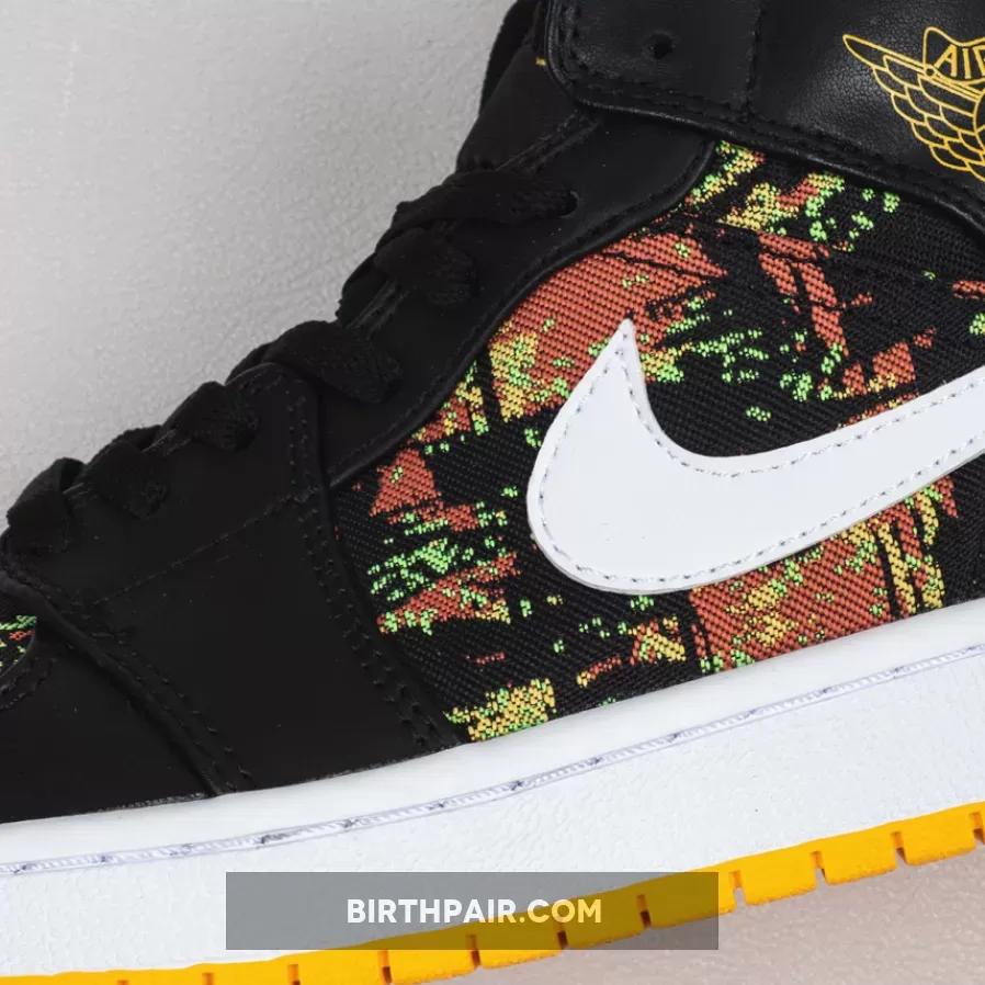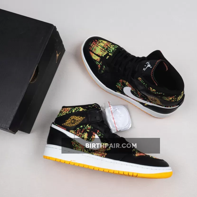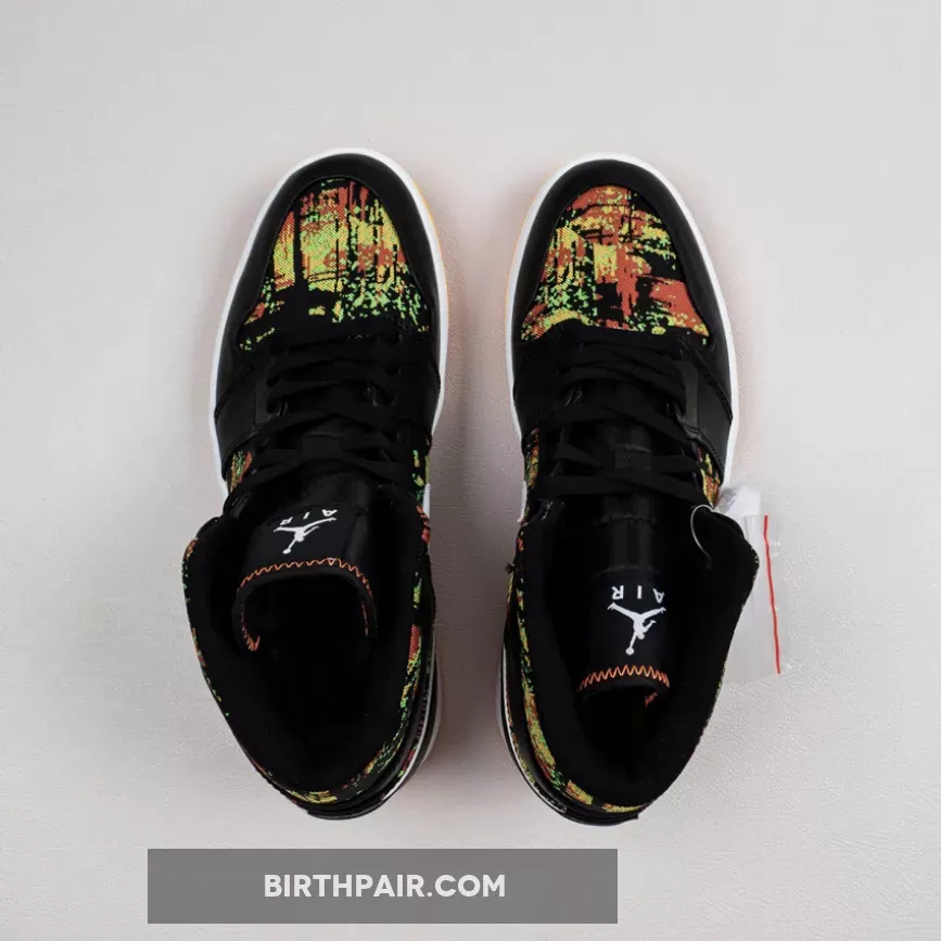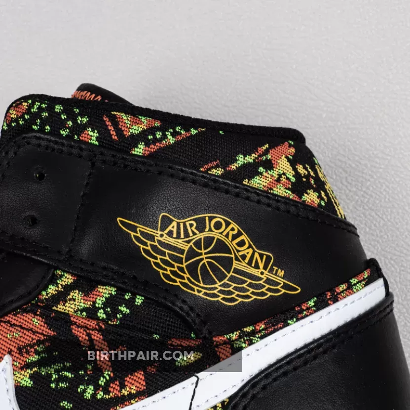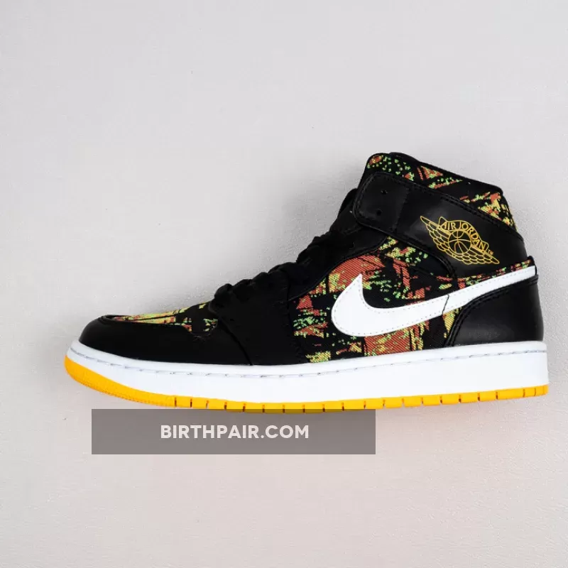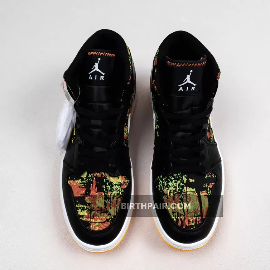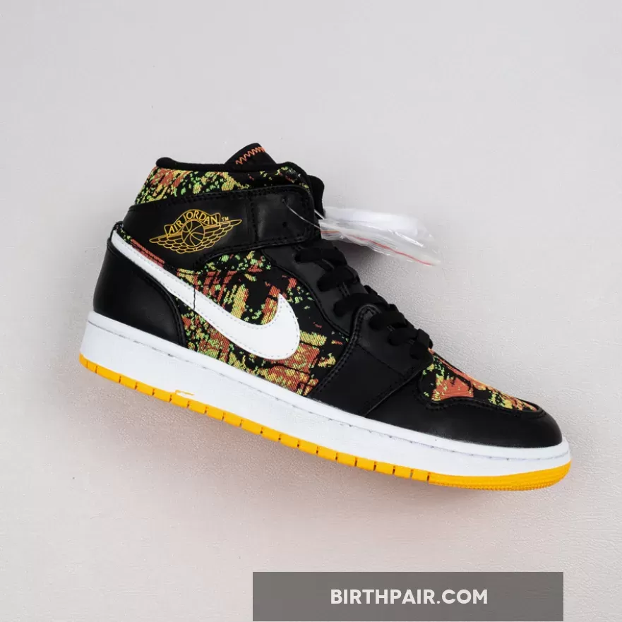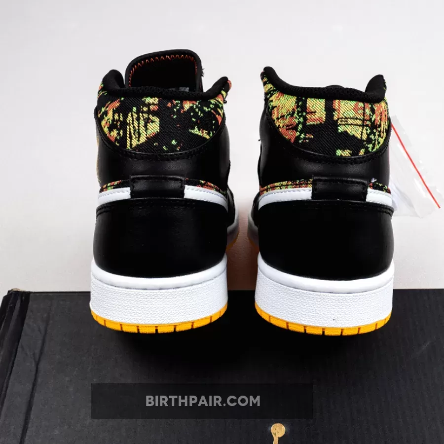 The Air Jordan 1 Mid GS “Black/Laser/Orange” is the youth sizing of Michael Jordan’s first signature shoe in a vibrant ‘90s style colorway. This retro design of the popular Jordan 1 Mid silhouette displays black leather overlays on the forefoot, eyelets, collar, and heel that contrast the white leather Swoosh detailing on either side of the shoe. An orange “Wings” logo is printed on the collar and white Jumpman branding can be found on the nylon tongue tag. A black based multicolor fabric with green, yellow, and orange highlights is located on the toe, mid-panel, tongue, and collar.