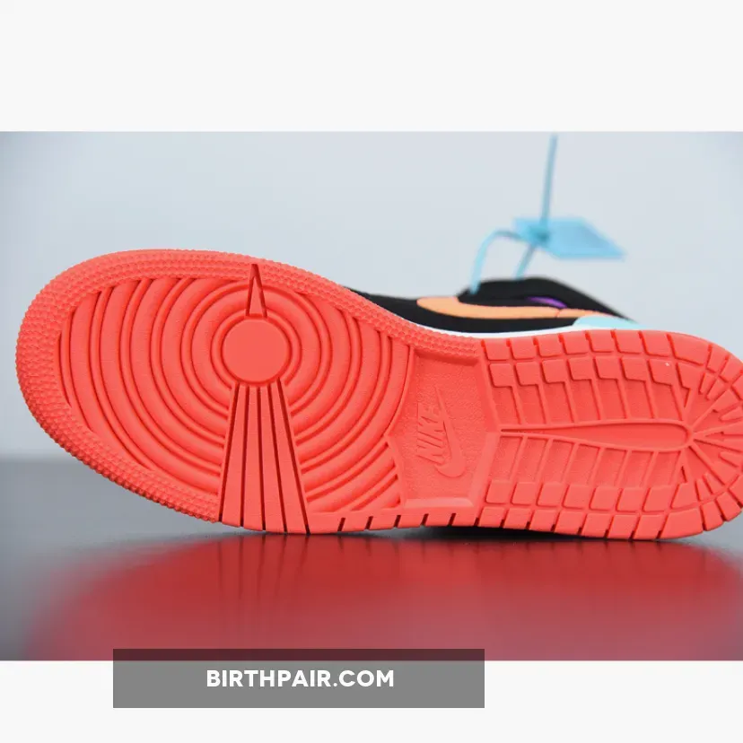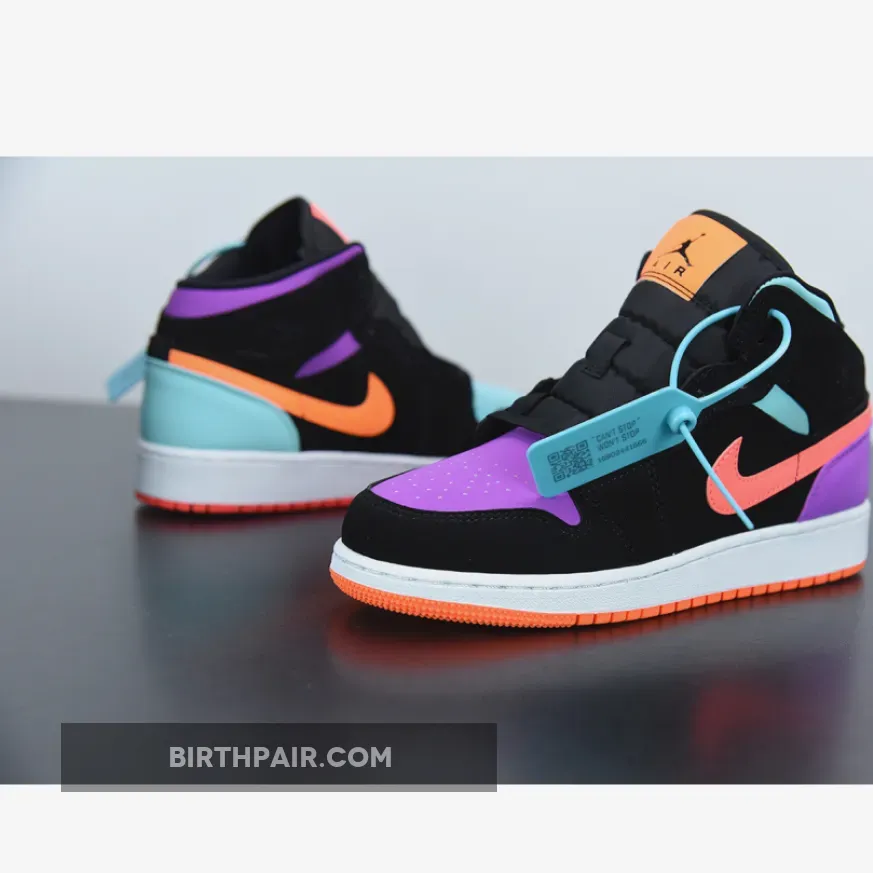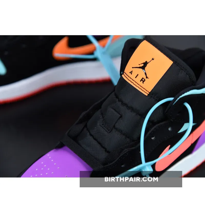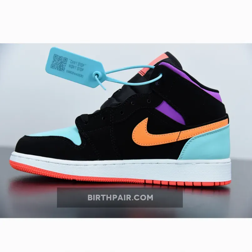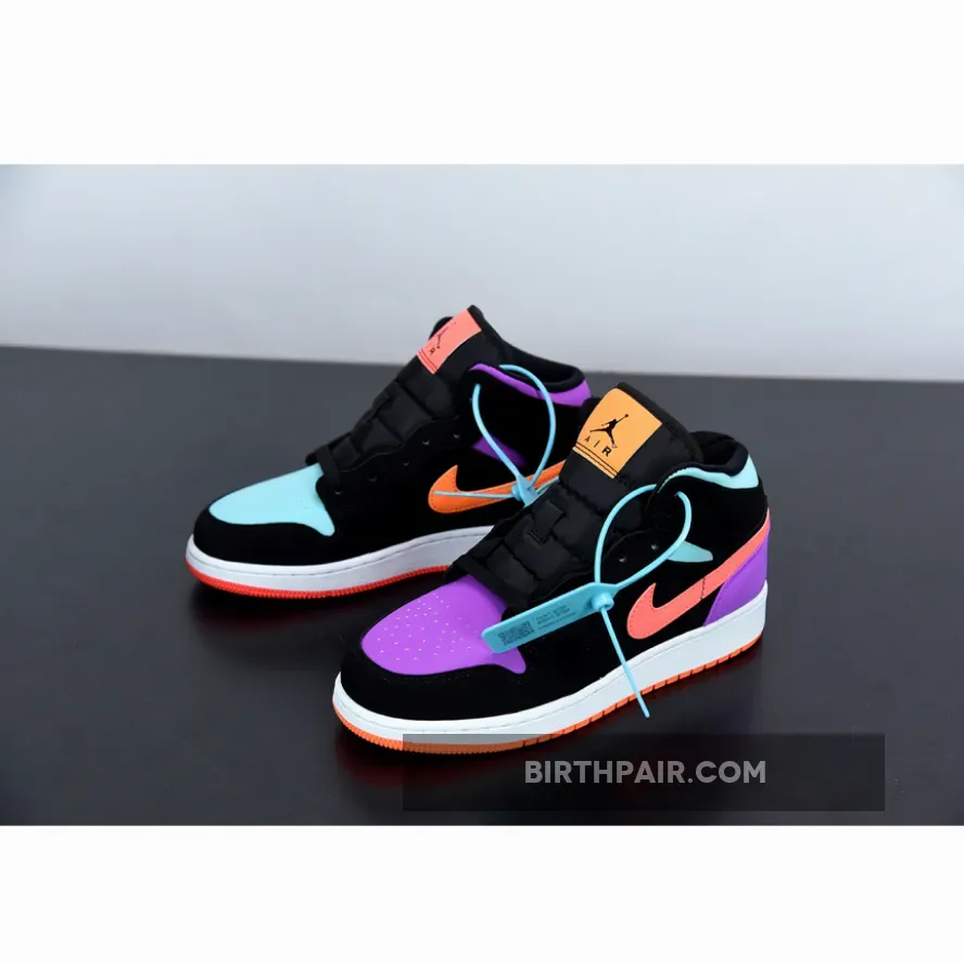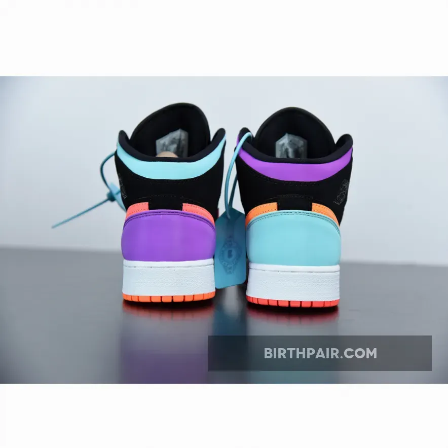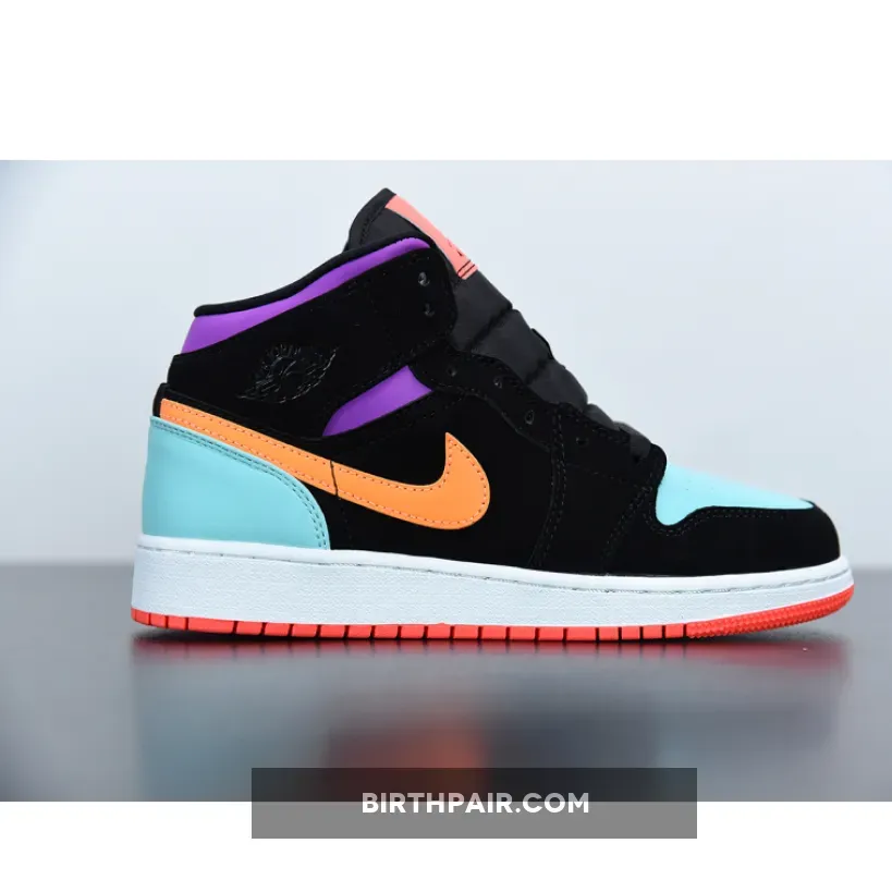 This offering the mid-top Air Jordan 1 features Black nubuck overlays highlighted with pastel tones in a mix of Purple, Teal, Orange, and Pink hues. A White midsole atop a solid-colored rubber outsoles completes the design.