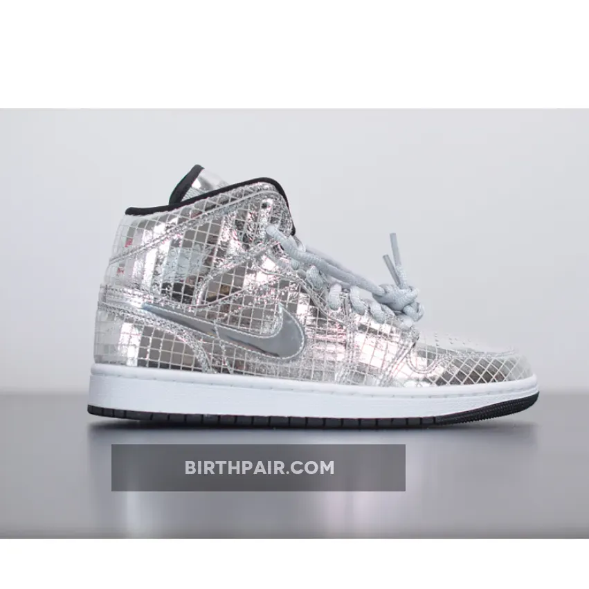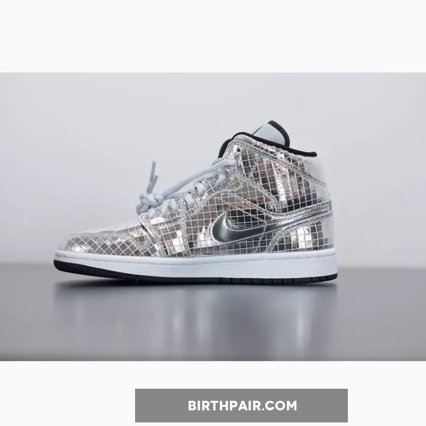 This offering of the mid-top Air Jordan 1 takes you back to the 1970s nightlife scene. It features a full mirrored squared-cut upper with Silver laces and a mesh tongue.