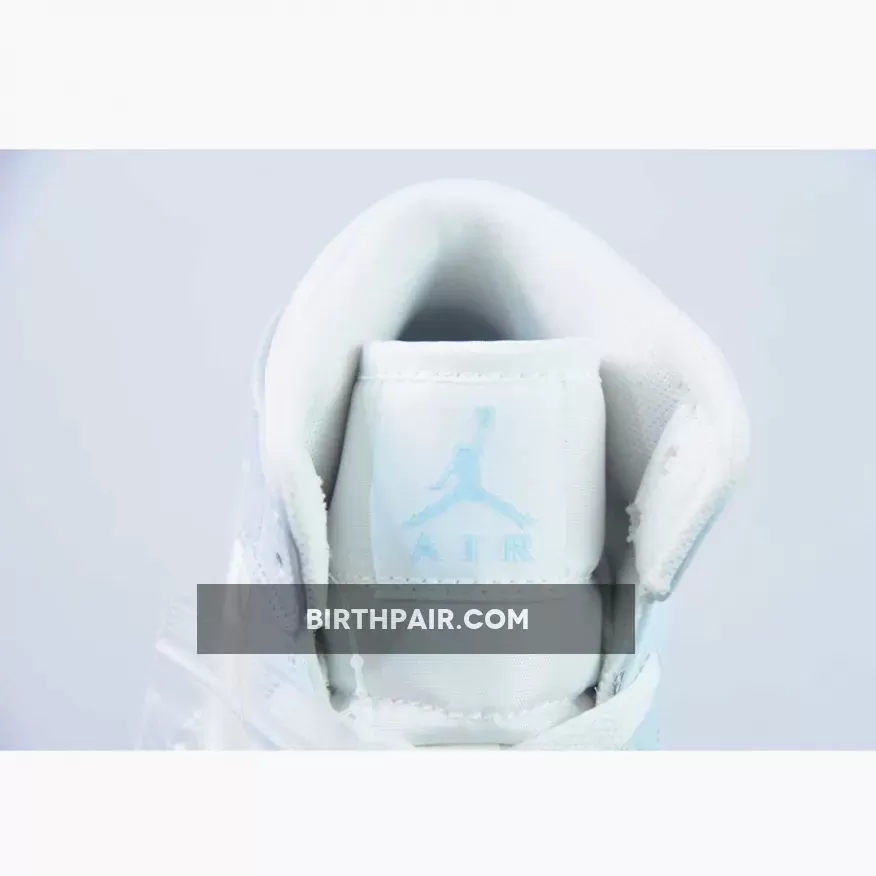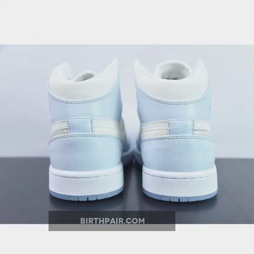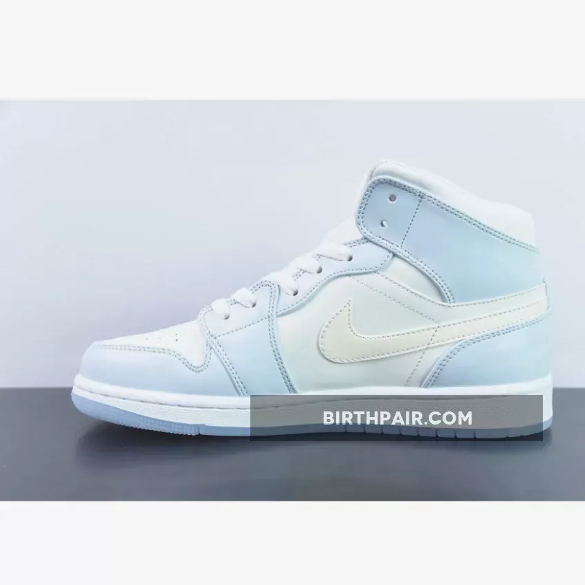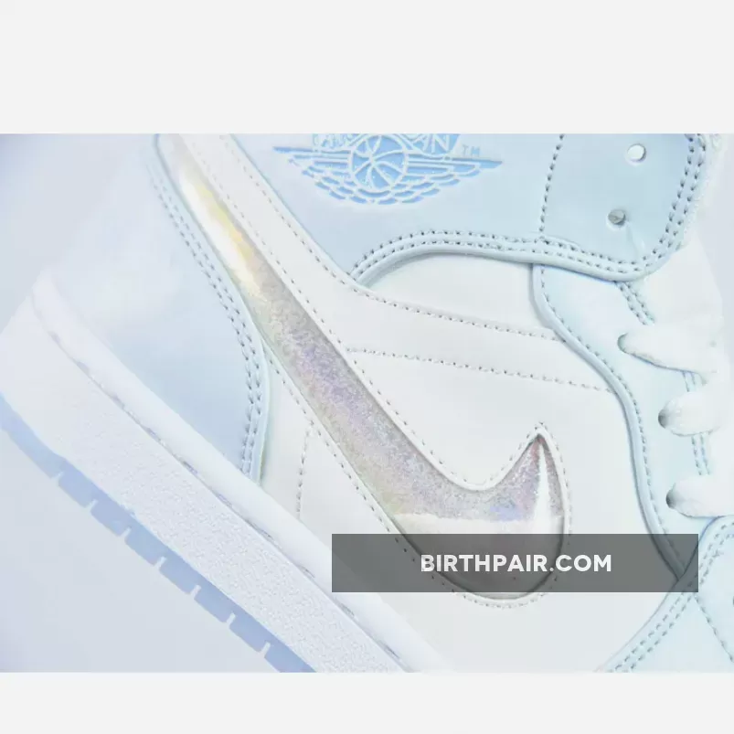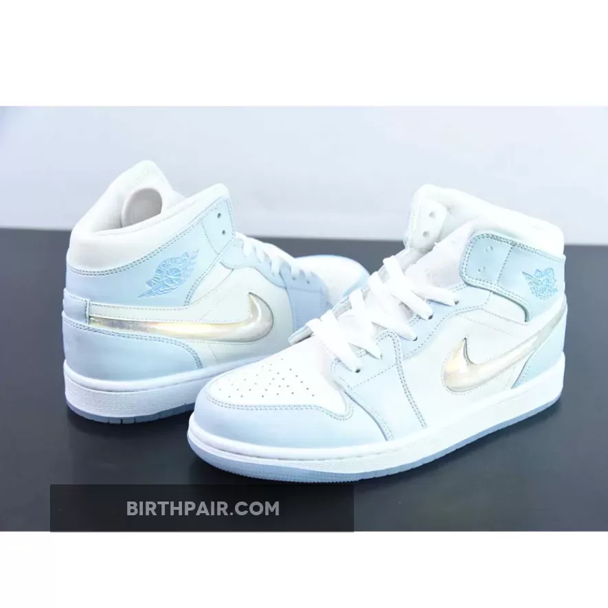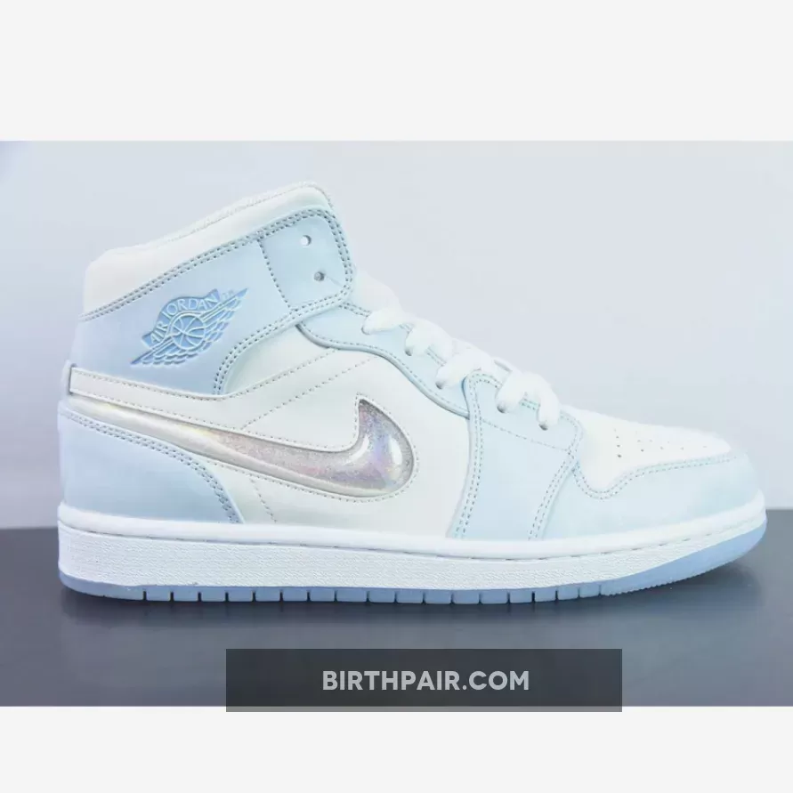 The Air Jordan 1 Mid sports a full leather construction that enhances comfort and durability. It incorporates toe box perforations for increased ventilation, mesh tongues, and a soft inner lining. Its foundation is a crisp White hue, while Light Blue accents adorn the overlays and branding on the ankle flaps and tongues. However, the true standout feature lies on the lateral side—a dazzling, shimmery iridescent glitter Swoosh steals the spotlight. The design culminates with a clean White midsole that rests atop a translucent, icy outsole.