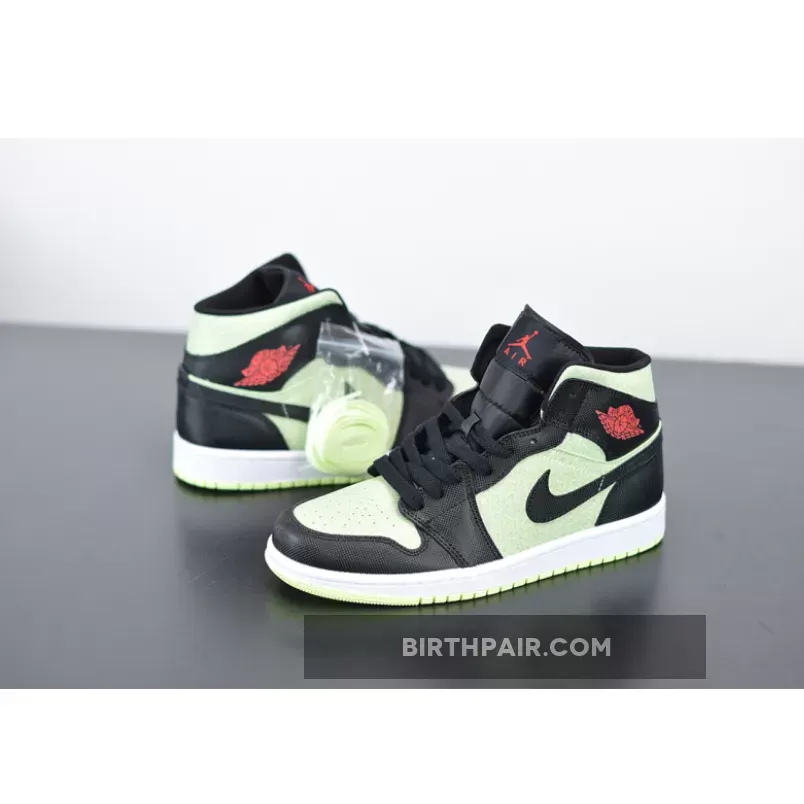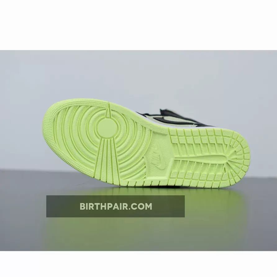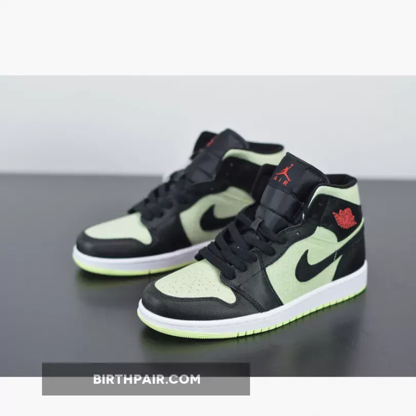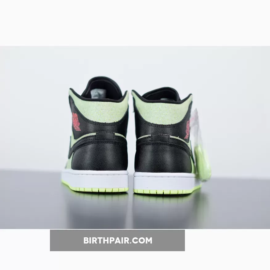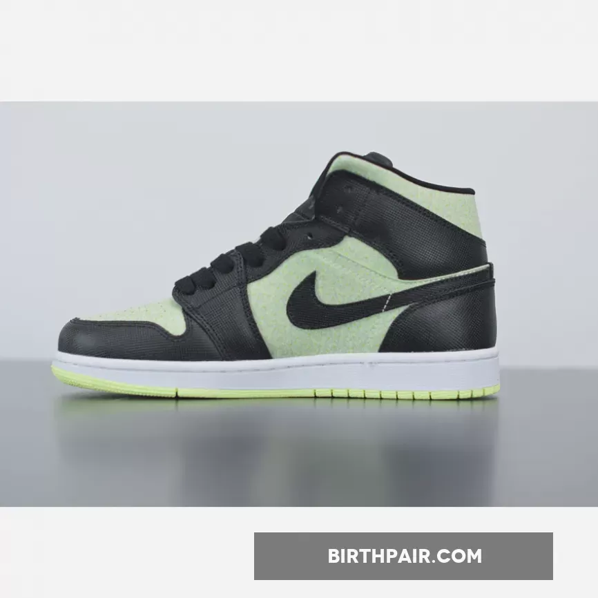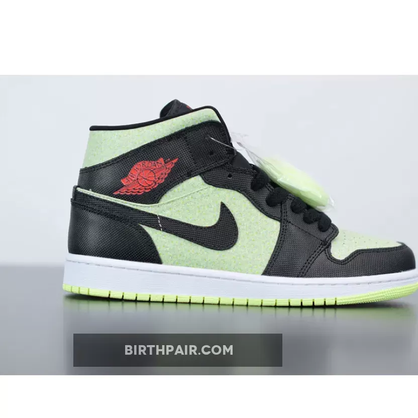 Ostensibly its inspiration, the Air Jordan 1 Zen Green seems to closely resemble the offering’s overall aesthetic, though shades are just marginally lighter as a result of the differing construction. Instead of suede, the vibrant accent is given a backdrop confetti-like in its visuals as speckles of different colors create a look not too dissimilar to Nike’s currently popular Grind materials. Panels atop — the toe cap, eye stay, heel wrap, swoosh, etc — then contrast in stark black, each made interesting by way of a glossy, textured ballistic mesh.