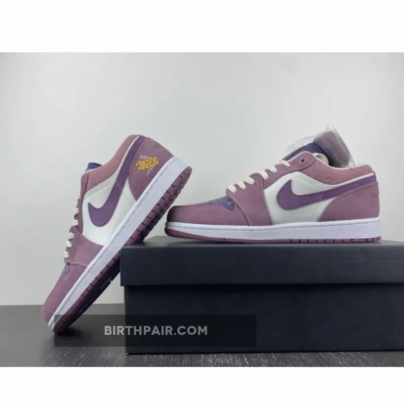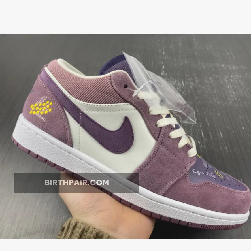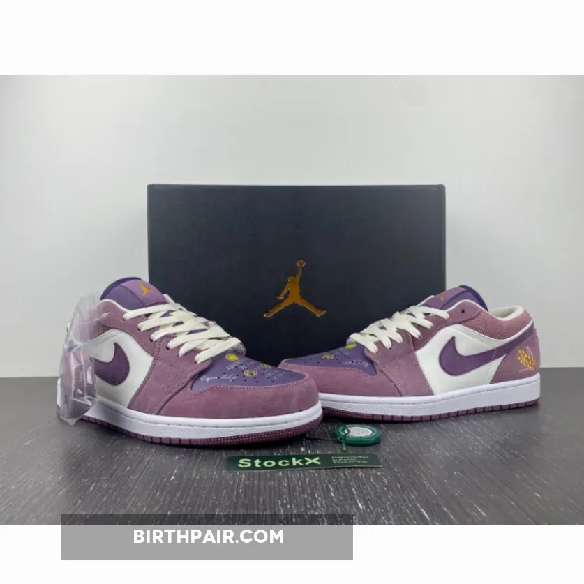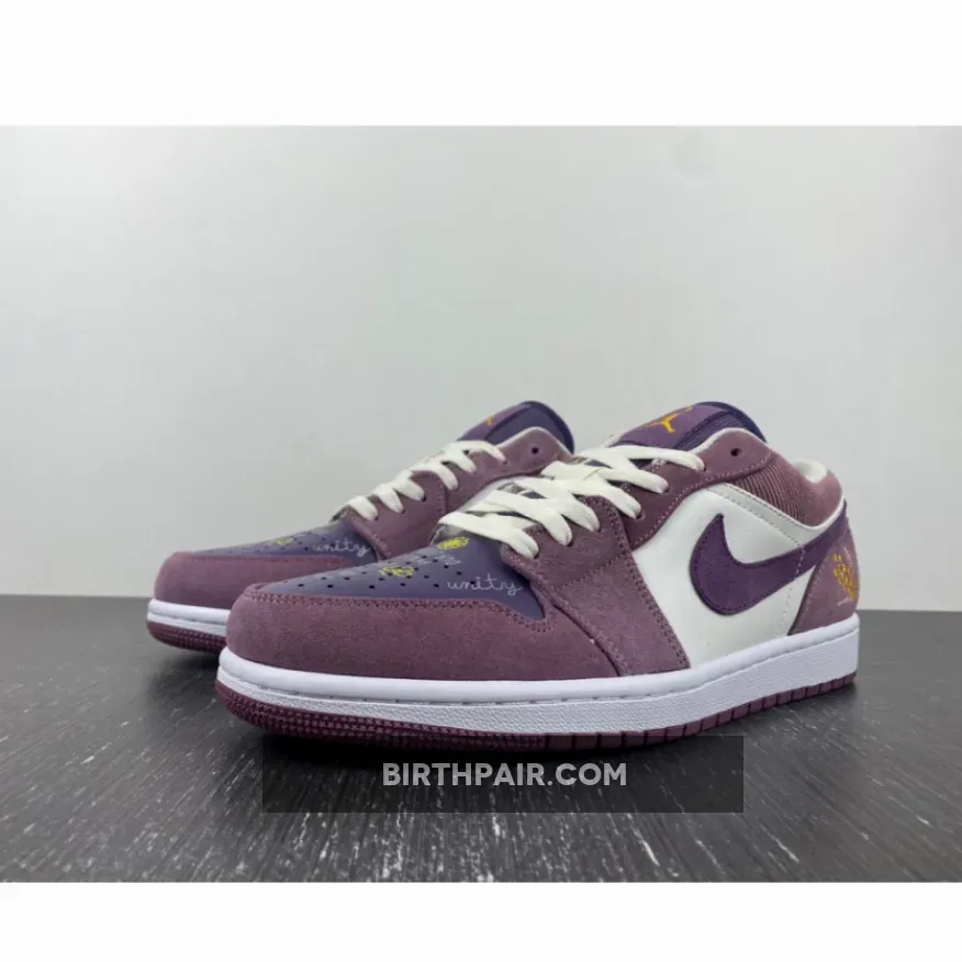 The Air Jordan 1 Low Unity Purple celebrates harmony and solidarity with its “Unity” theme. This vibrant sneaker design showcases dainty cursive text scribbles at the violet perforated toe, which includes the phrase “Because One Day This Day Will Be Our Everyday”, the words “Equality”, and of course, “Unity”. It is also decorated with bright yellow flowers and sun doodles. The rest of the silhouette features a balanced look. The colourless leather quarters are nicely complemented with purple suede overlays while the Swoosh, ribbed corduroy-like tongue is dressed in violet.