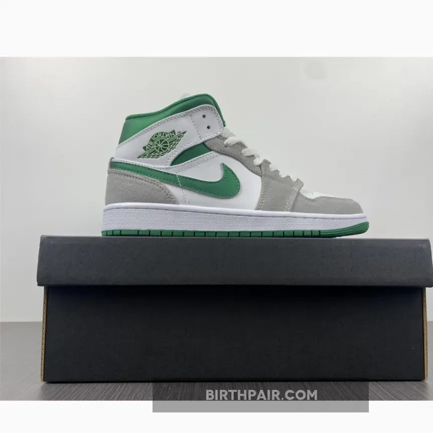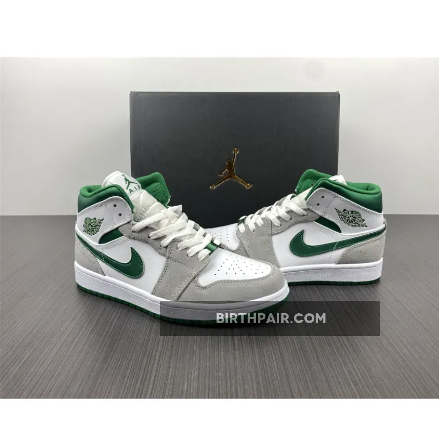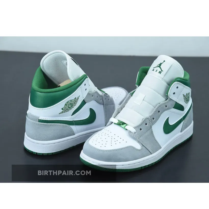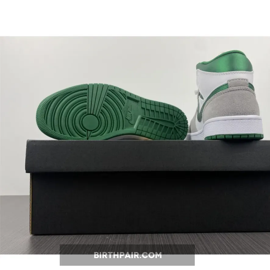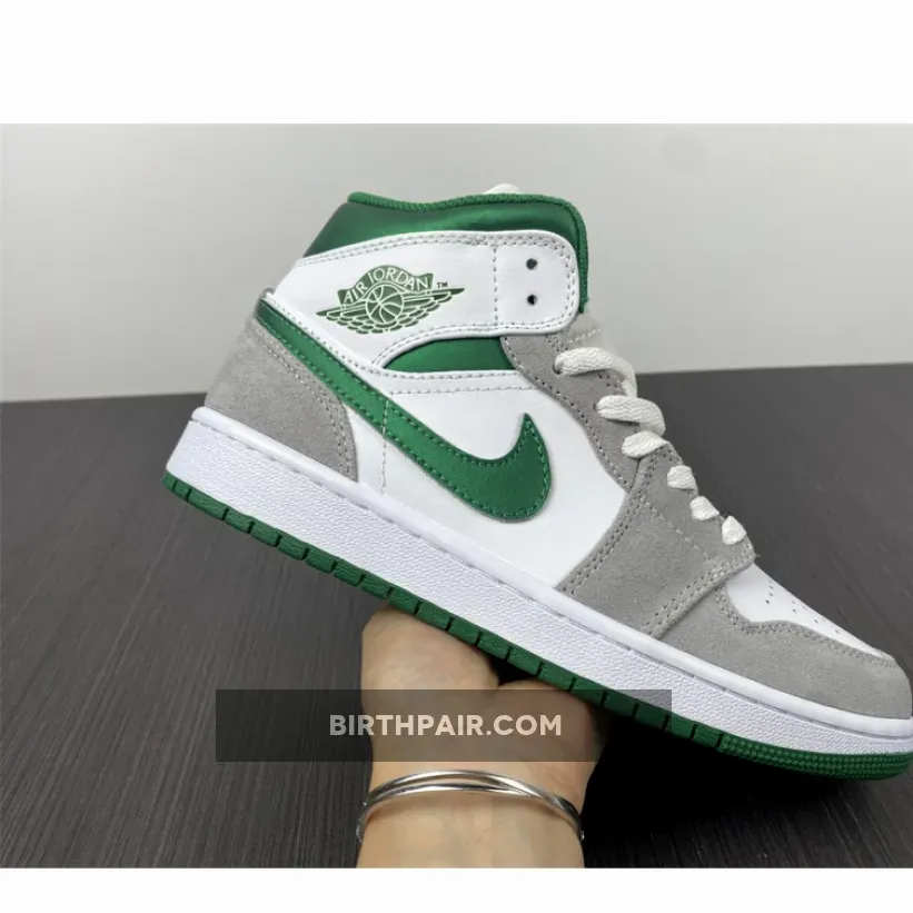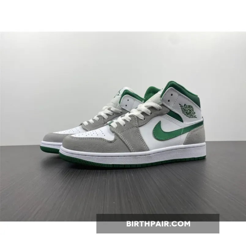 Add instant freshness to your ensemble with the Air Jordan 1 Mid White Grey Pine Green. This stylish pair’s crisp design begins with a classic white smooth leather that remains exposed in the side panels and perforated toe box. Suede overlays in the toe cap, mudguard, eye stay and heel adds a nice contrast to the colourless base. All in all, this versatile Air Jordan 1 Mid is a great companion for your fashionable fits.