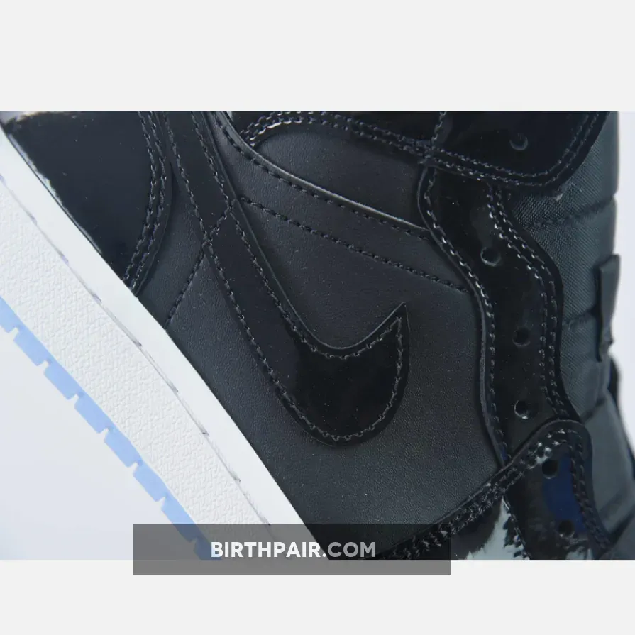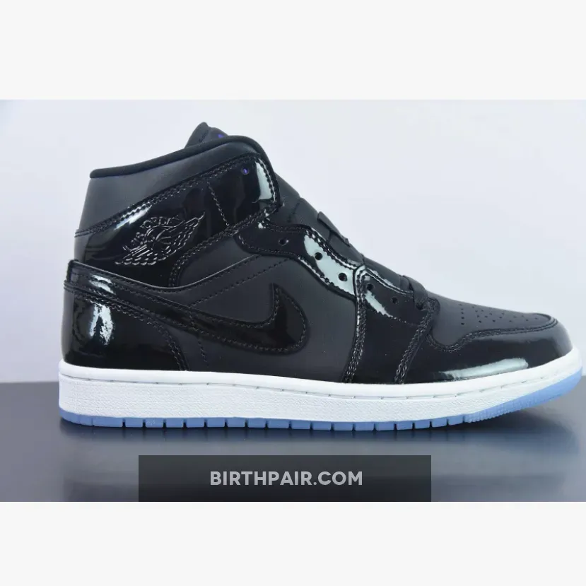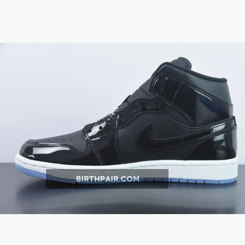 This sneaker looks as though it’s from the depths of a black hole as the upper is covered entirely is stark black. The toebox and mid-panels use flat black leather, while the overlays opt for high-shine patent. Patent leather has always split opinions due to its glossy finish, but you can’t deny it looks like a natural fit on the Air Jordan 1 Mid,even complementing the embossed Air Jordan Wings and heel counter.