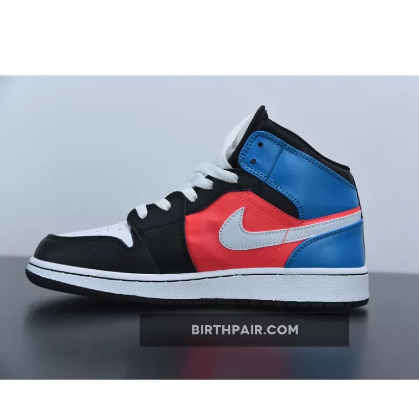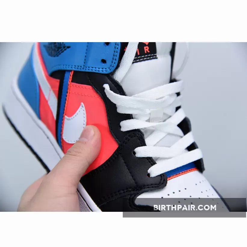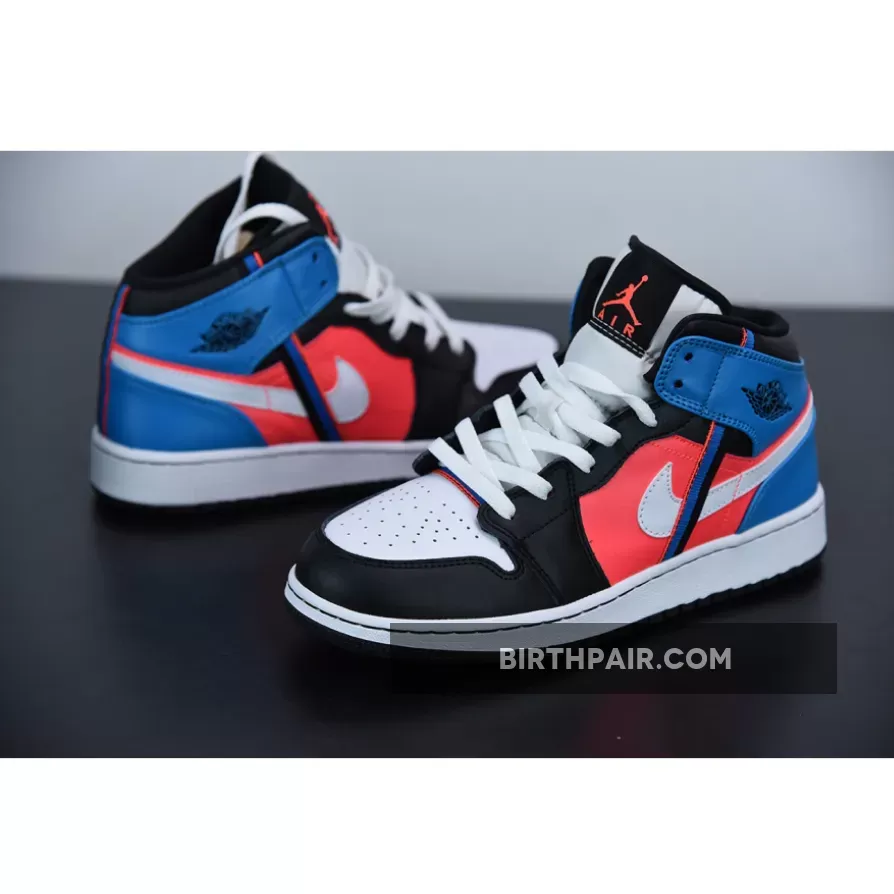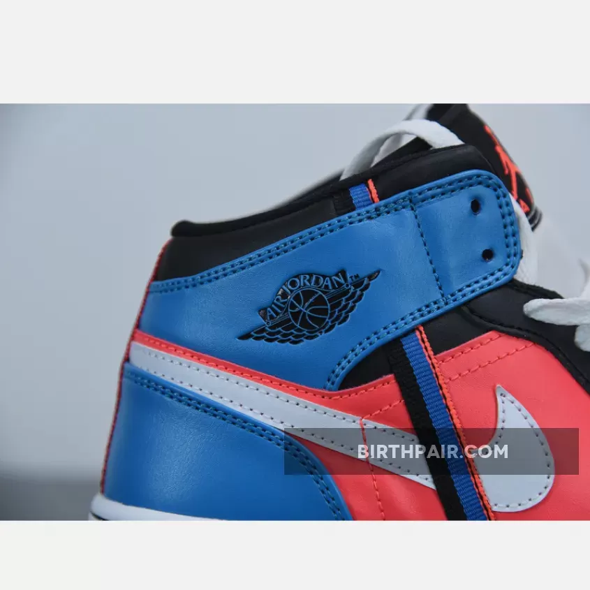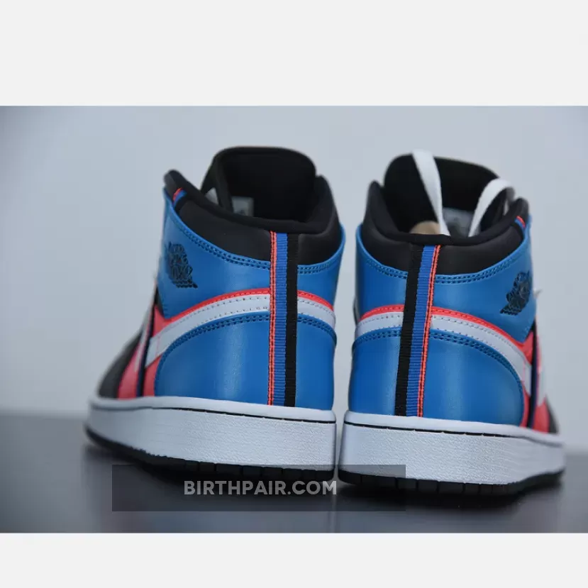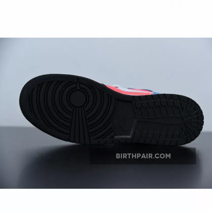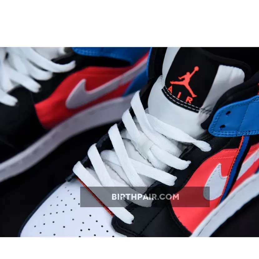 The Air Jordan 1 Mid as well as the Low have attached some additional webbing to their side profile, a strip that blends into its multicolor background with a condensed swatch of the surrounding colorway. Hit with a small bit of red and two louder hits of aqua and navy, the stitched on detail plays well as it extends from the heel to the tooling, looping underneath the ankle flaps and warping above the neutral-colored swoosh. Mid-panels are dressed with a much fuller display of red, while the toe cap, eye stay, and collar are toned down with a full kit of black leather. Cool tones finish along the heel, leaving enough room for the usual Wings insignia.