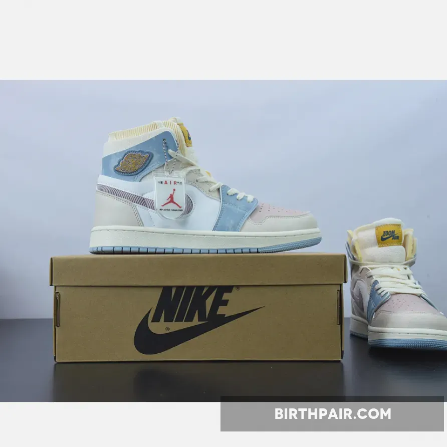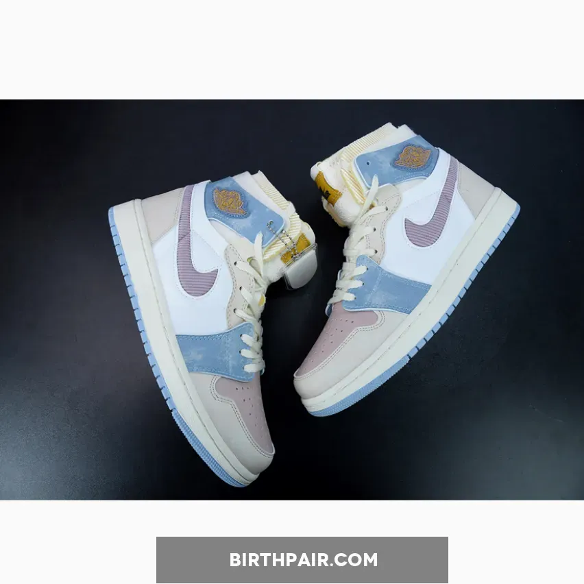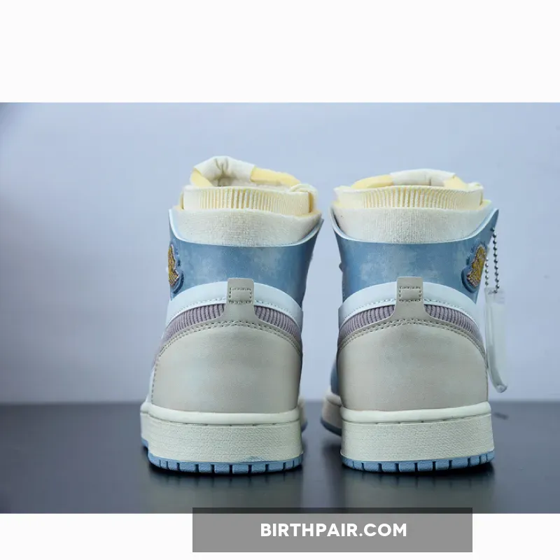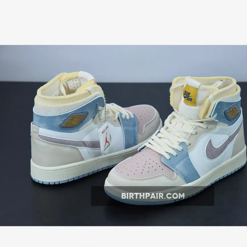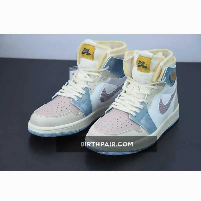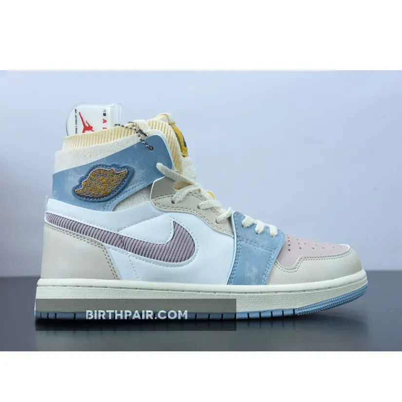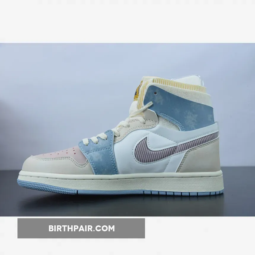 The new Air Jordan 1 Zoom CMFT comes in pastel shades. Meet the Air Jordan 1 Zoom CMFT Pink Plum Fog.The base of the upper is suede in charming Pink Oxford showing on the perforated toe box. The quarter is suede in Summit White with cutouts showing off the signature profile Swooshes in Plum Fog corduroy. The mudguard, part of the eyestay panel and the collar flap are in sky blue with the same washed finish as the beige overlays. The terry cloth that wraps around the exposed foam tongue and the ankle give the shoe a comfy look.