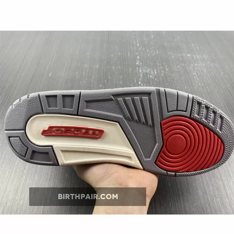 “Cement Grey” detailing is brought back to the upper and outsole while “Fire Red” accents the Jumpman on the tongue, the sockliner and some of the eyelets.
