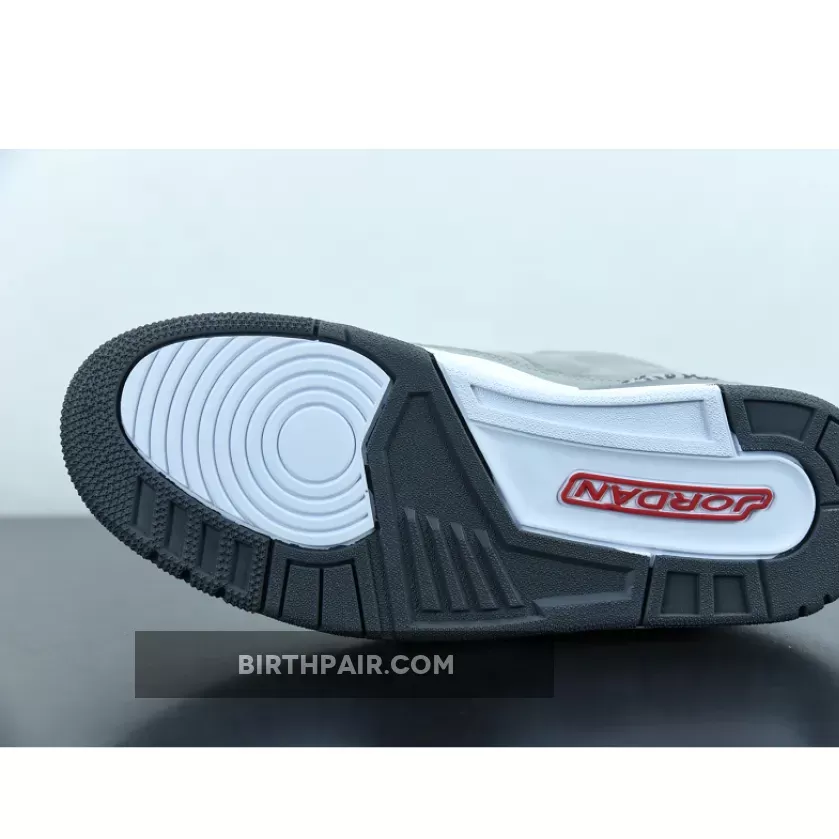 Additionally, the midsole and outsole are dressed in the same grey and white, respectively.
