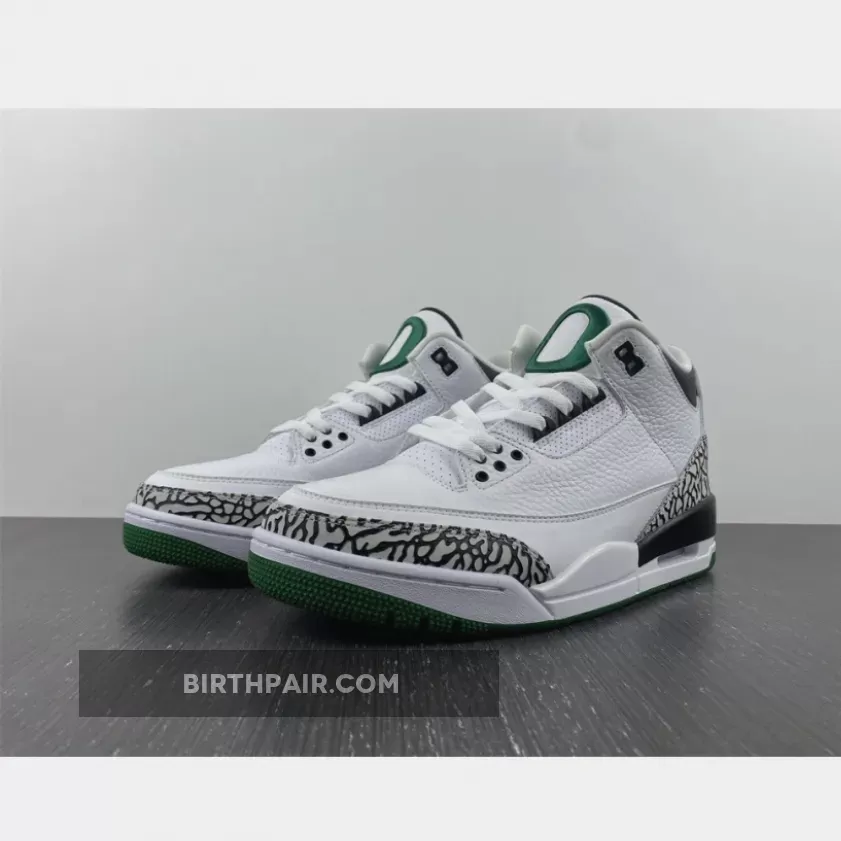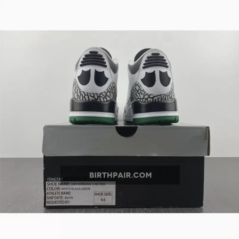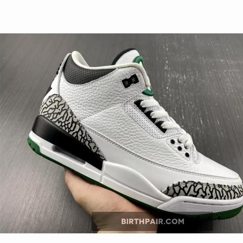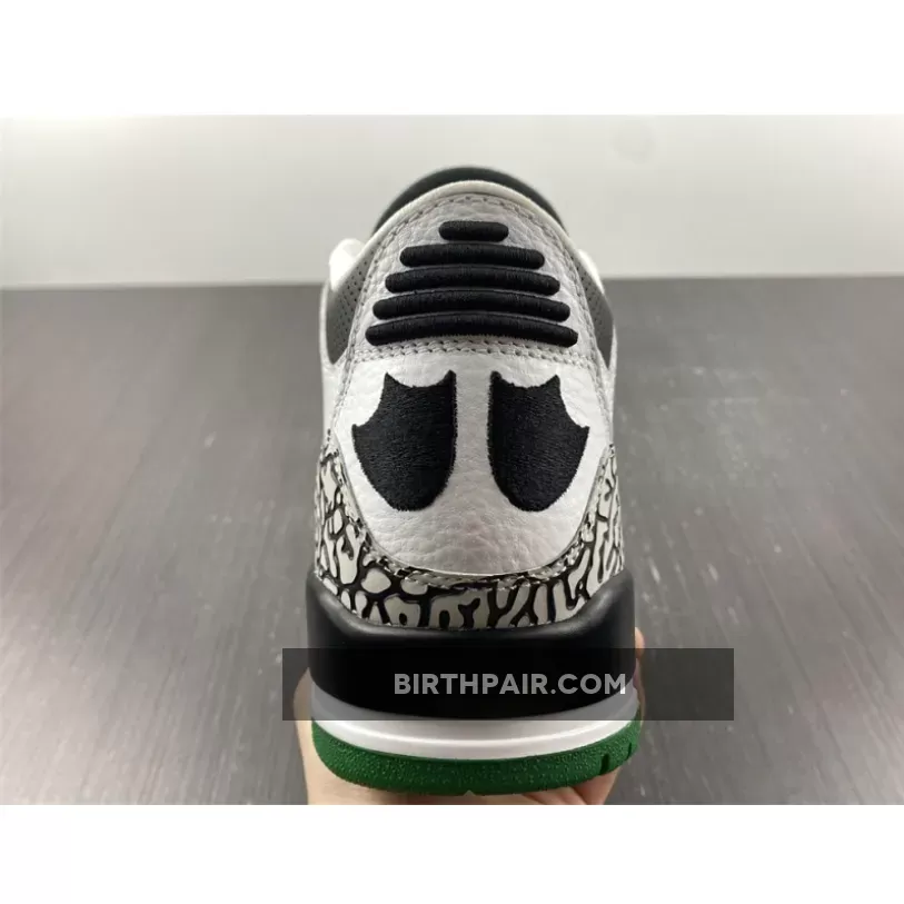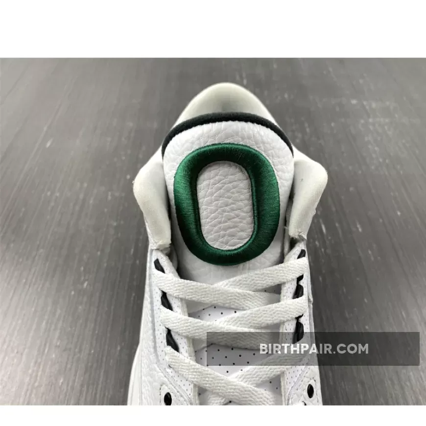 After a detailed look at the Oregon “Pit Crew” Air Jordan 3 over the weekend, here’s a closer look at the Oregon “Home” colorway. Inspired by the original “Cement” colorway, the shoe features a white tumbled leather base, accented by grey elephant print overlay rands wrapped around the toebox and heel. Contrasting black hits are used for the laces eyelets, “O” embroidery, tongue padding, collar, duck feet embroidery on the heel and rear portion of the midsole. The remainder of the midsole is done in white, while a dark green outsole finishes off the look below. These were limited to students, athletes, staff and select alumni.