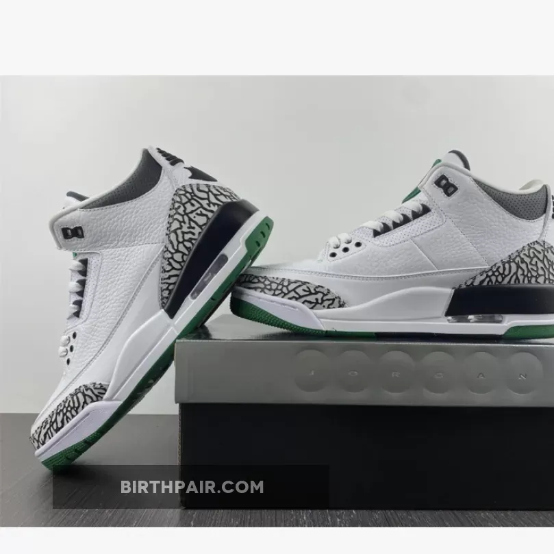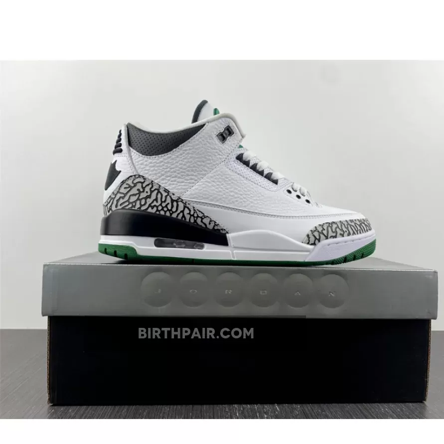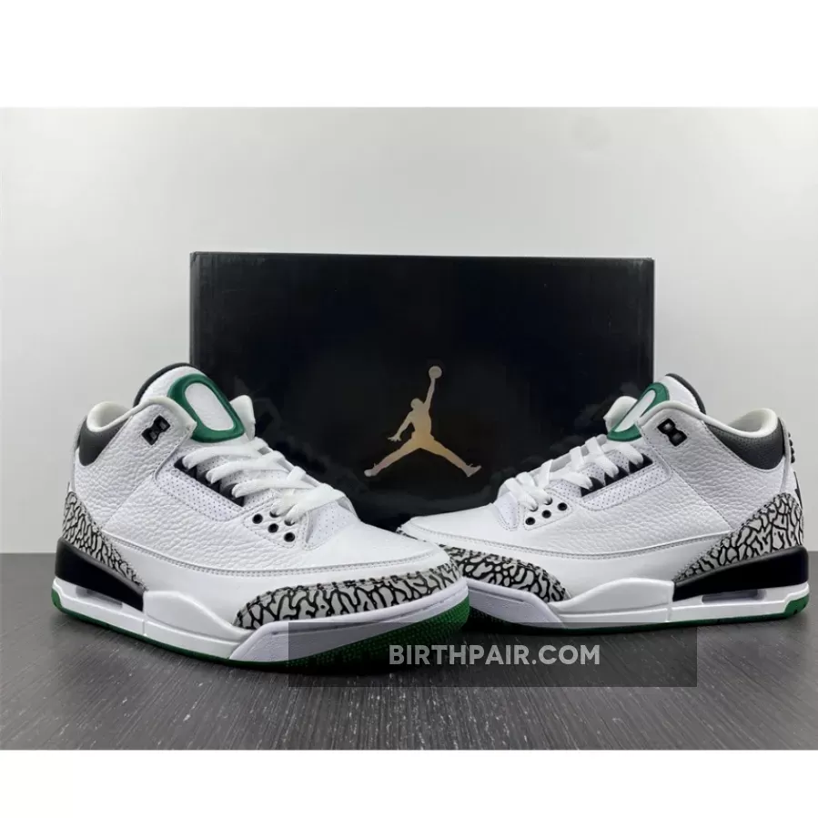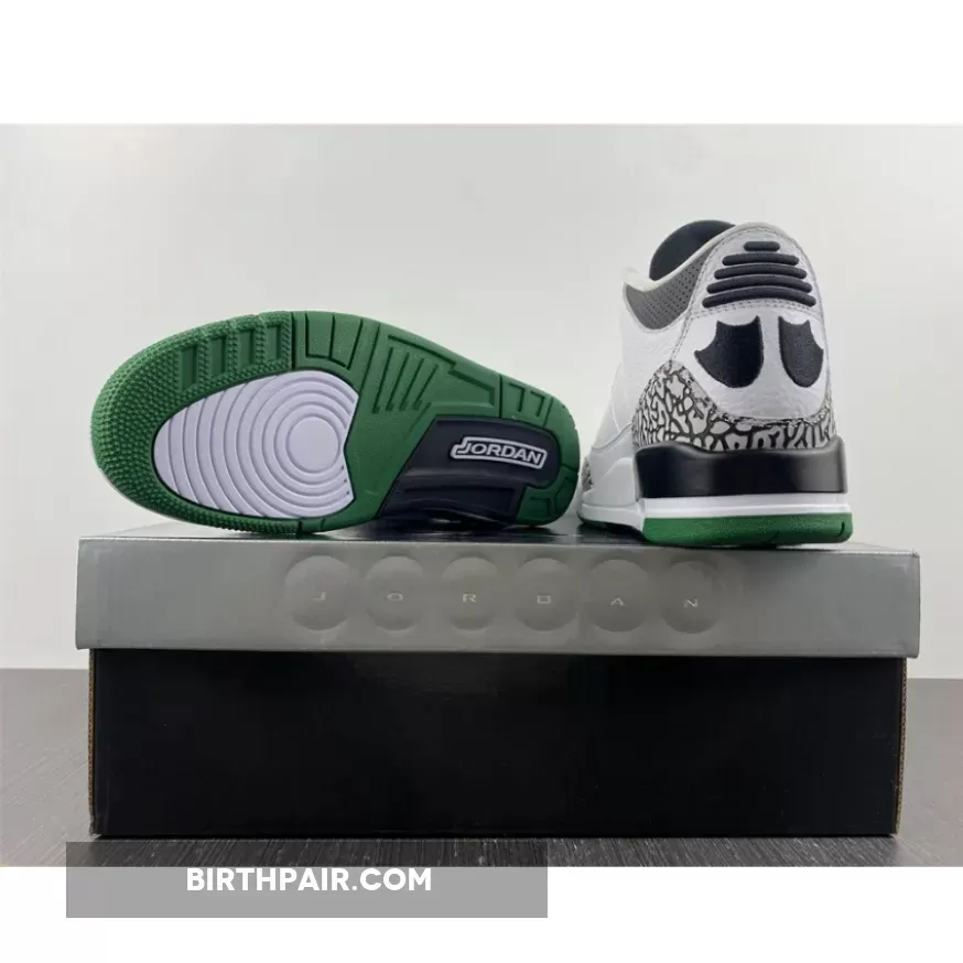 After a detailed look at the Oregon “Pit Crew” Air Jordan 3 over the weekend, here’s a closer look at the Oregon “Home” colorway. Inspired by the original “Cement” colorway, the shoe features a white tumbled leather base, accented by grey elephant print overlay rands wrapped around the toebox and heel. Contrasting black hits are used for the laces eyelets, “O” embroidery, tongue padding, collar, duck feet embroidery on the heel and rear portion of the midsole. The remainder of the midsole is done in white, while a dark green outsole finishes off the look below. These were limited to students, athletes, staff and select alumni.