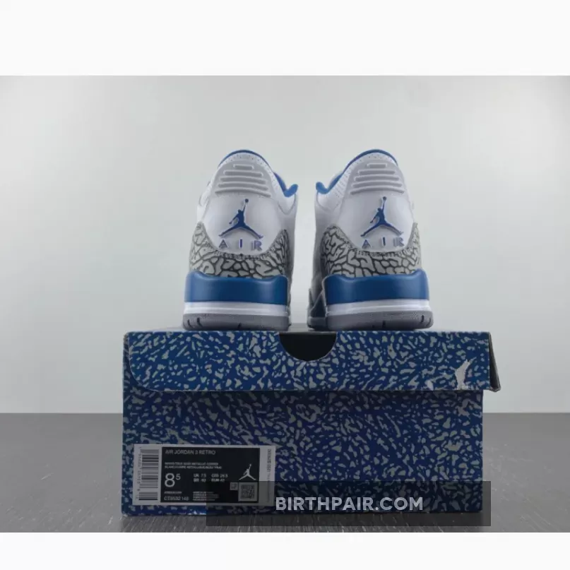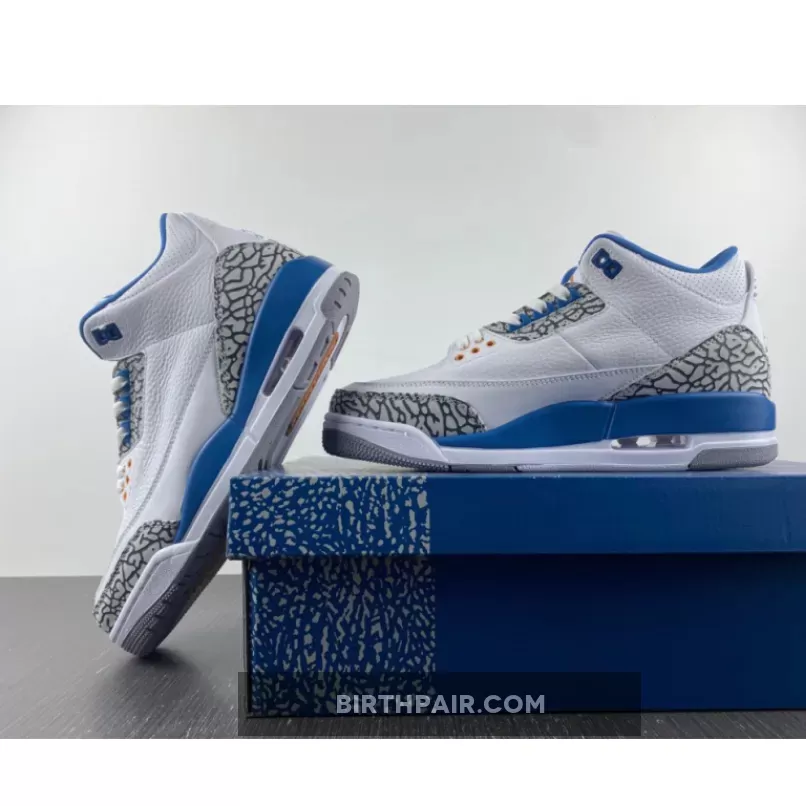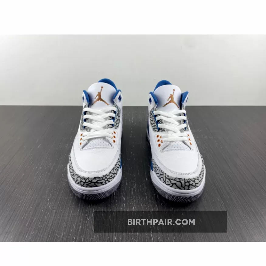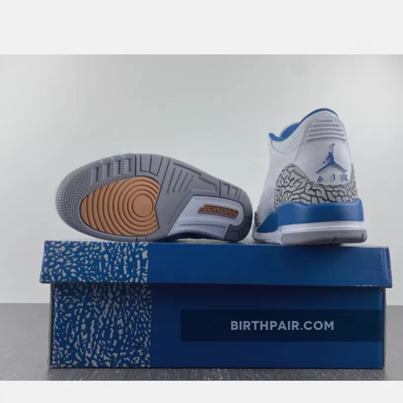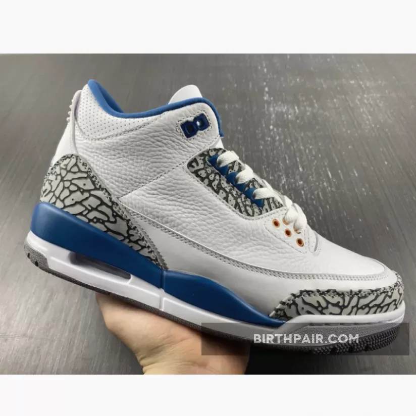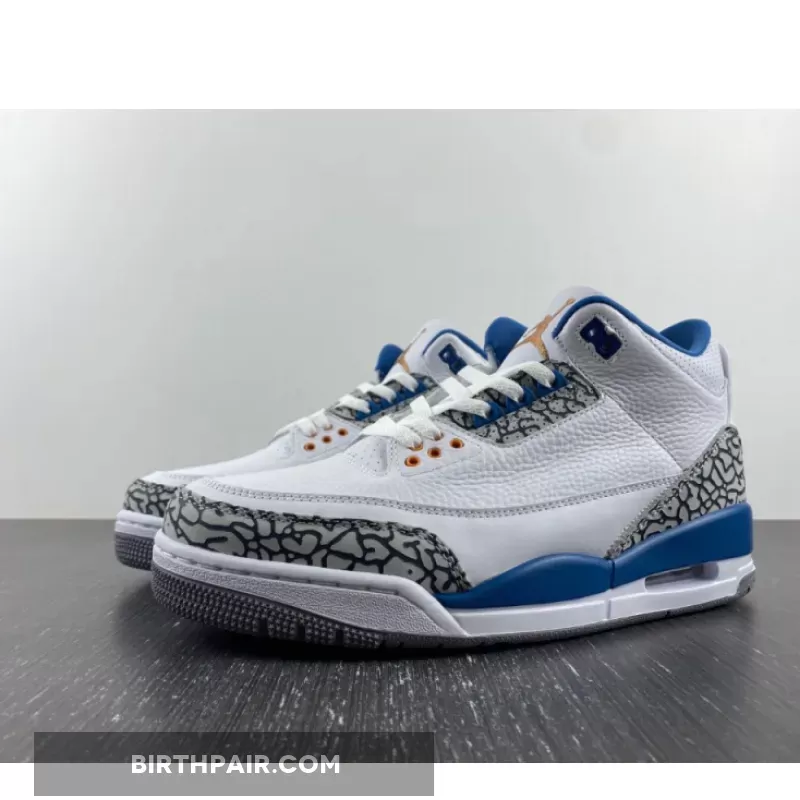 The Air Jordan 3 Retro ‘Washington Wizards’ showcases a familiar design based on a PE colorway that Michael Jordan wore during his time in D.C. Featuring color blocking reminiscent of the OG ‘True Blue’ edition from 1988, the classic silhouette makes use of a white tumbled leather upper with grey elephant-print overlays at the toe and heel. Contrasting blue accents appear on the interior lining, molded eyelets, and the raised Jumpman logo that decorates the heel tab. A second Jumpman graces the tongue in copper-colored embroidery, matching the circular eyelets that dot the forefoot. The mid-top is mounted on a two-tone polyurethane midsole, equipped with a visible Air-sole heel unit and supported by a durable grey rubber outsole.