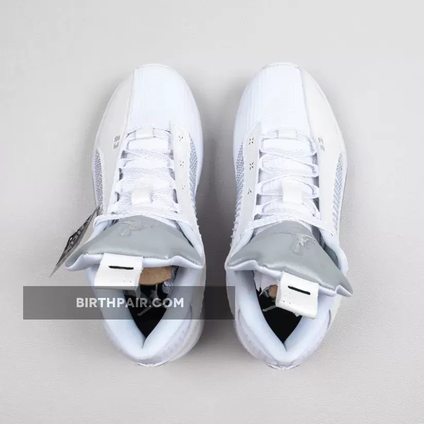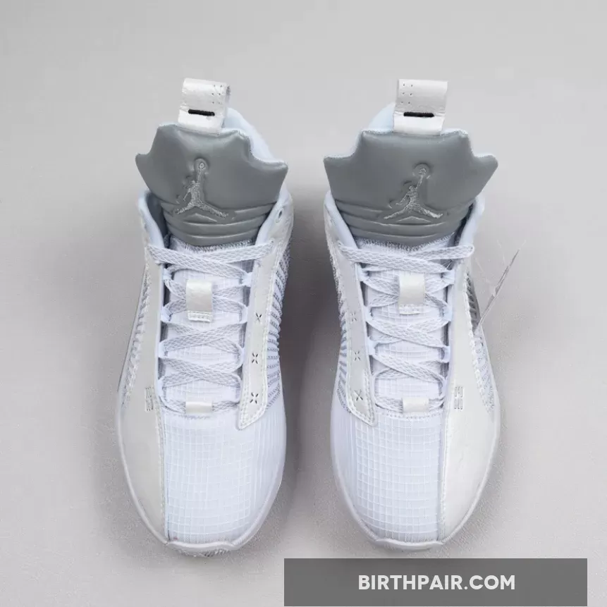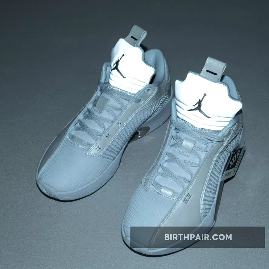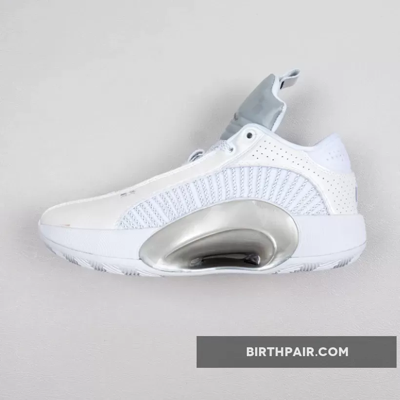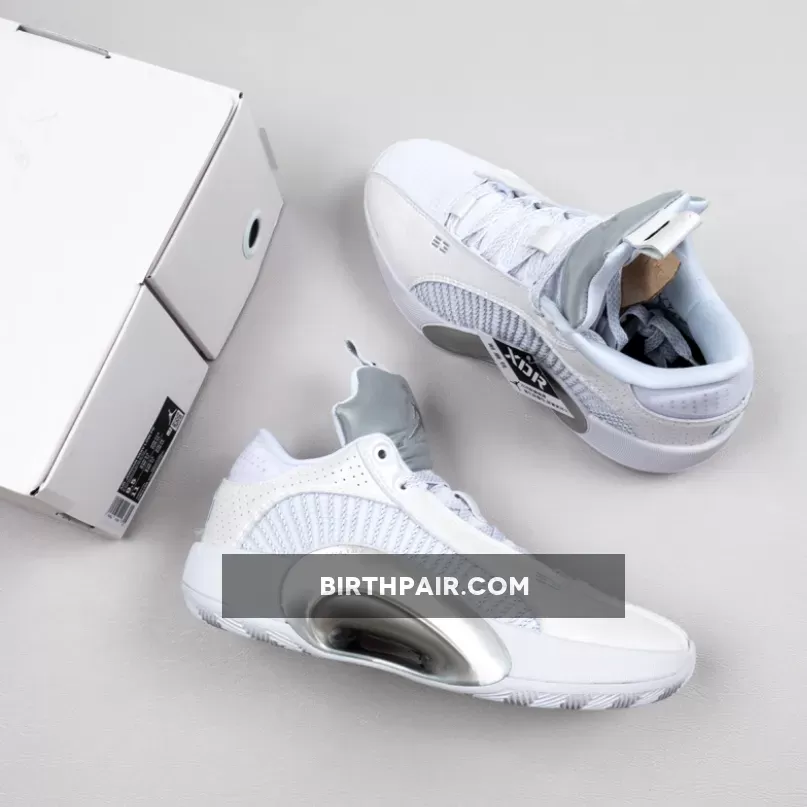 This low-top Air Jordan 35 comes dressed in a White and Metallic Silver color combination. Highlighted with White tumbled leather across the upper while mesh wraps the collar. Next, 3M reflective adorns the tongue while the traditional Eclipse plate is used in the mid-foot.