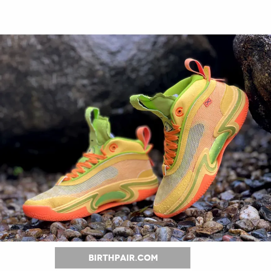 The shoe’s upper is constructed using a leno weave material with mesh overlays, while the outsole is made from rubber. It has light yellow as the predominant color with Olive Green covering the upper part, including the laces, while the outsole is in bright orange. It also has the classic TPU ribbon synonymous with most shoes on the Air Jordan 36 line.