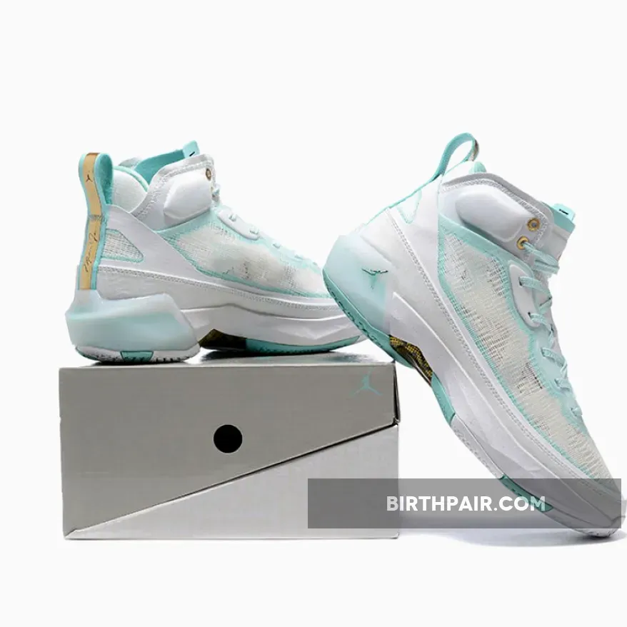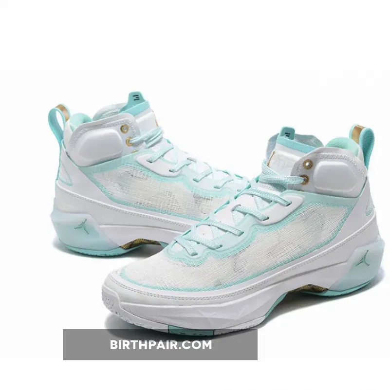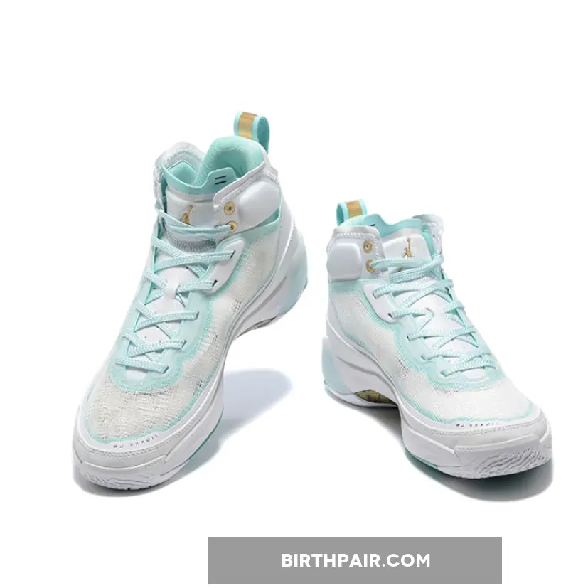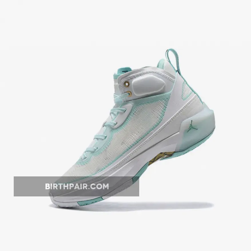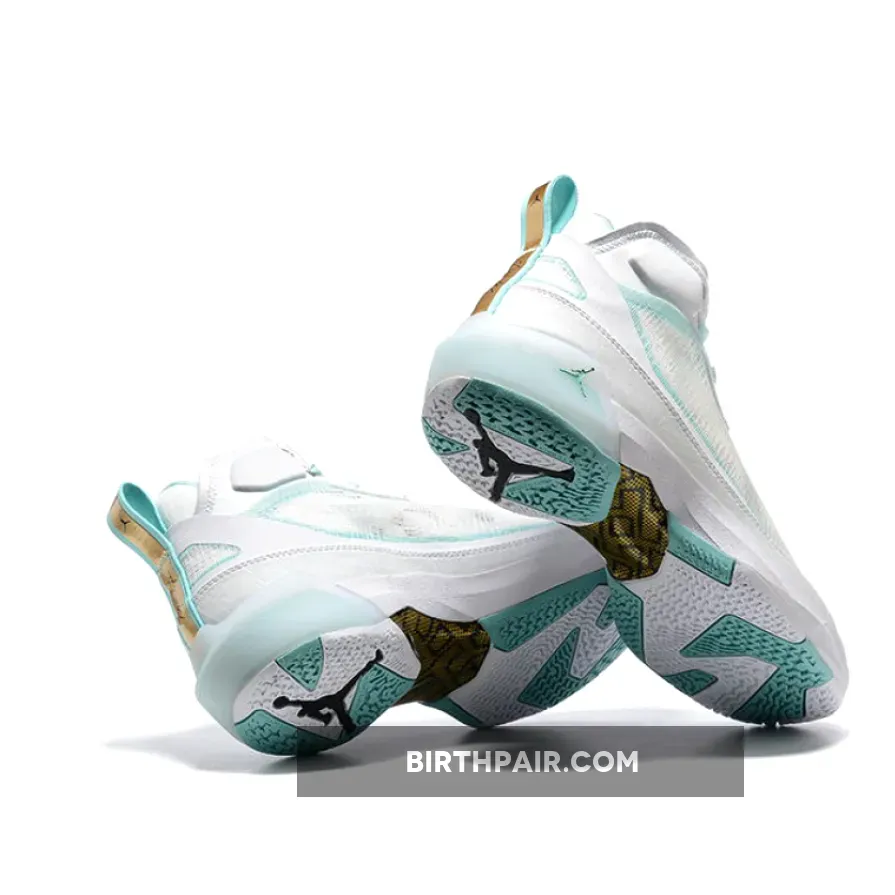 This AJ37’s breathable mesh base is white showing off an attractive turquoise underlay on the lower part of the upper. The TPU upper edges that connect to the eye stay panel are also bordered with the same turquoise hue. The puffed-out and comfy-looking collar is white, matching the mesh base. Bronze accents add a touch of luxe to the shoe via the collar eyelets and the heel pull tabs that extend down the spine of the heel.