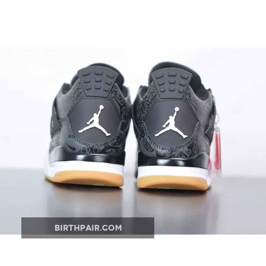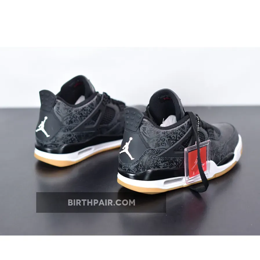 Dressed in a Black, White, and Gum Light Brown color scheme. This Air Jordan 4 features a Black leather upper with 3M laser graphics. Red hits are seen on the “Flight” of the tongue and Jumpman logo on the outsole, while having White Jumpman logos on the tongue label and heel.