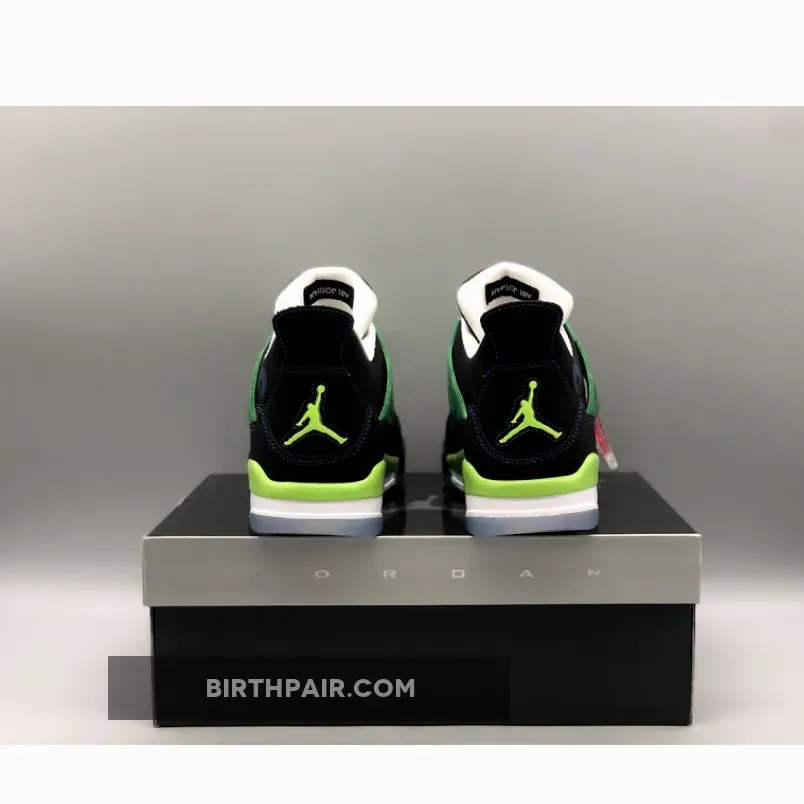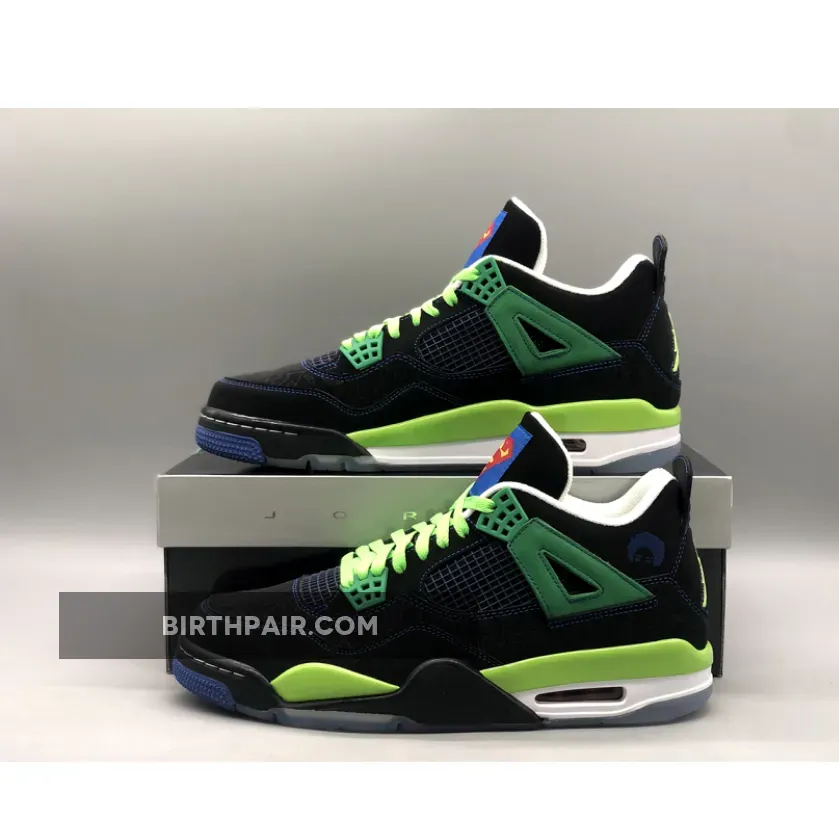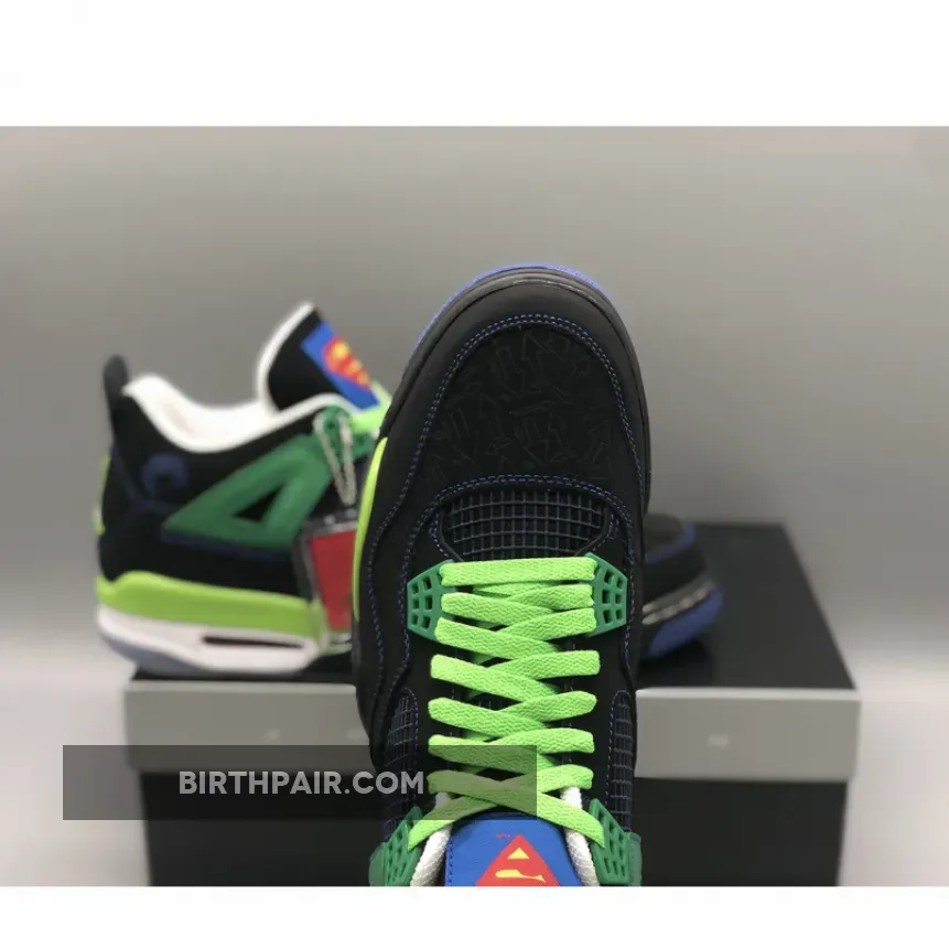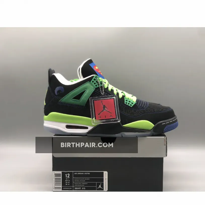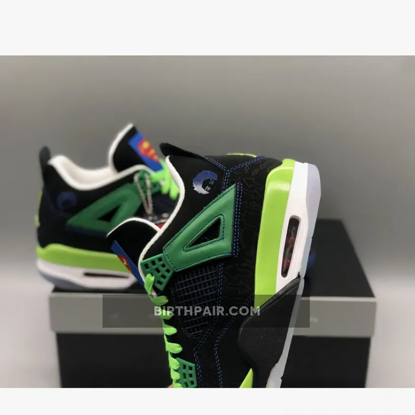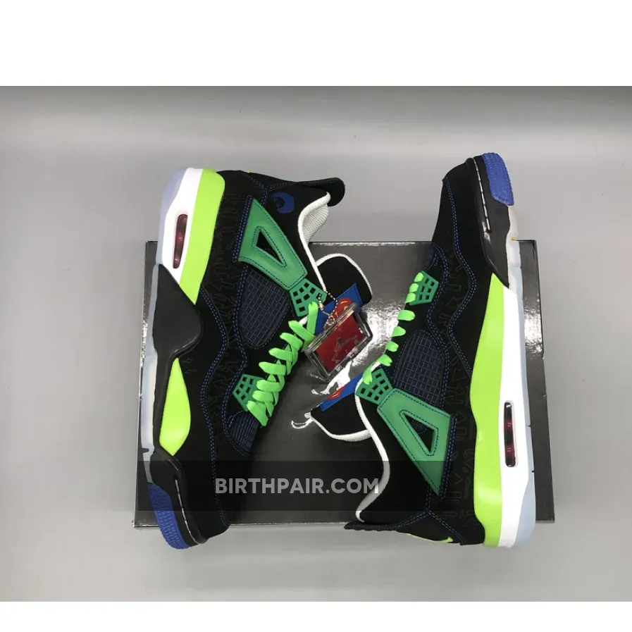 Furthermore, you can see the Black, Old Royal, Electric Green, and White on this Air Jordan 4 displays a super-hero color scheme with interesting detailing. This attractive feature will surely turn heads as you walk down the tracks in these Nike Air Jordan 4 kicks. Moreover, a playful white laser-etched arrow pattern on the upper and the sides and midfoot regions have cages integrated, making the sneakers look more eye-catching.