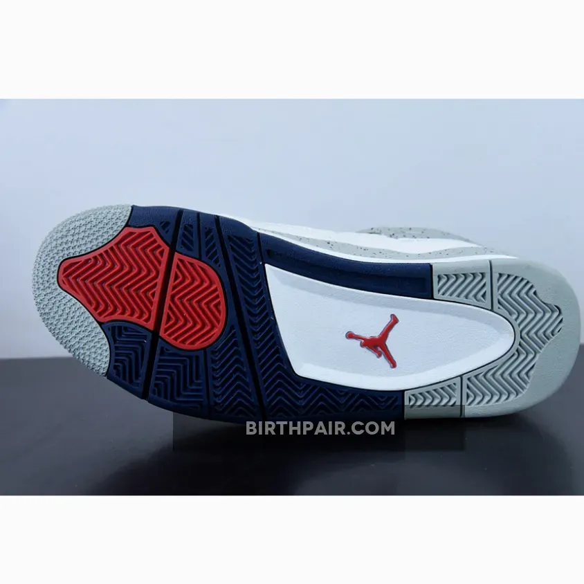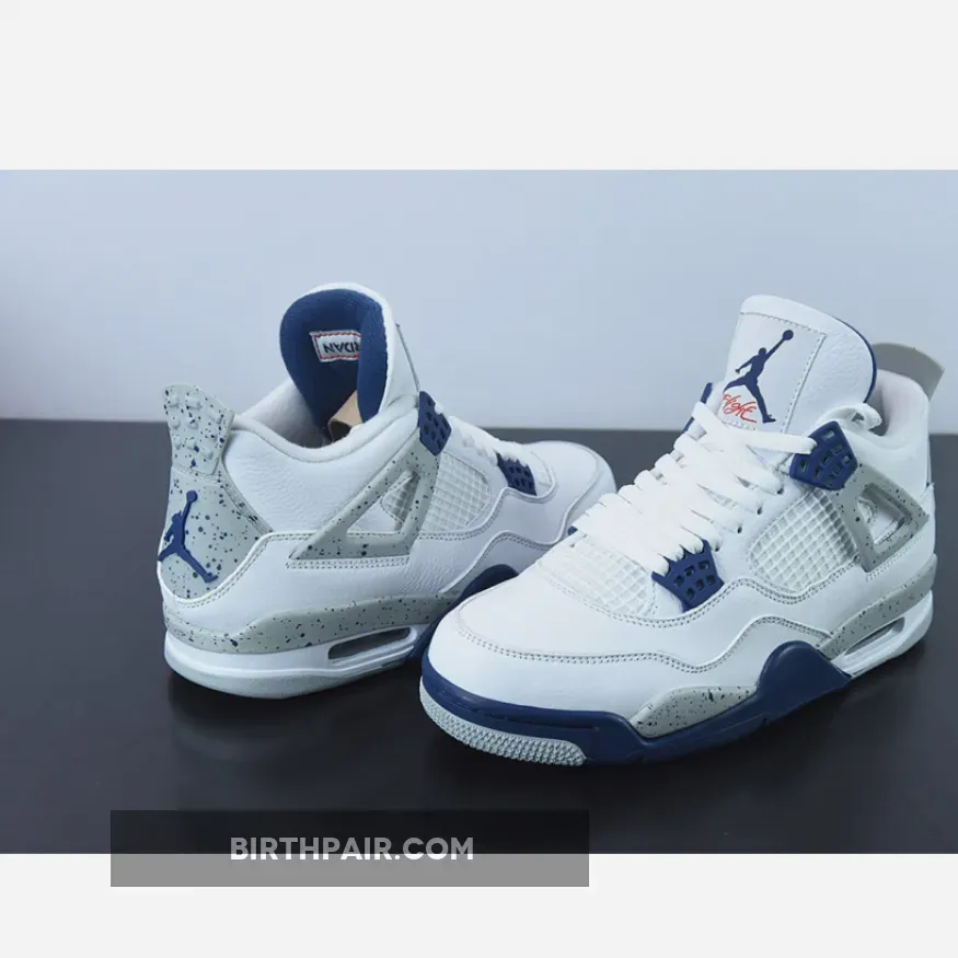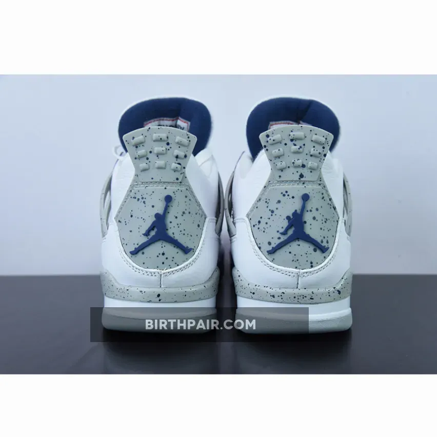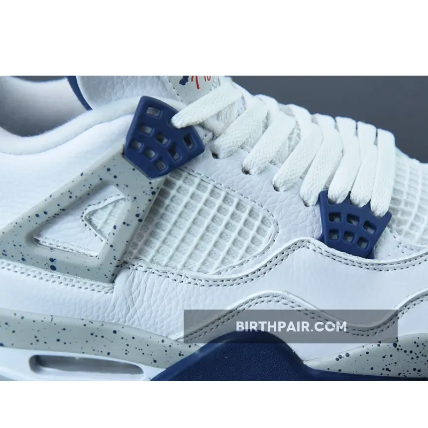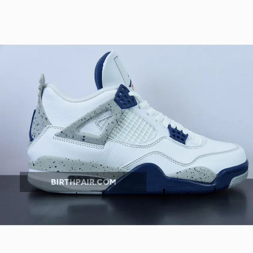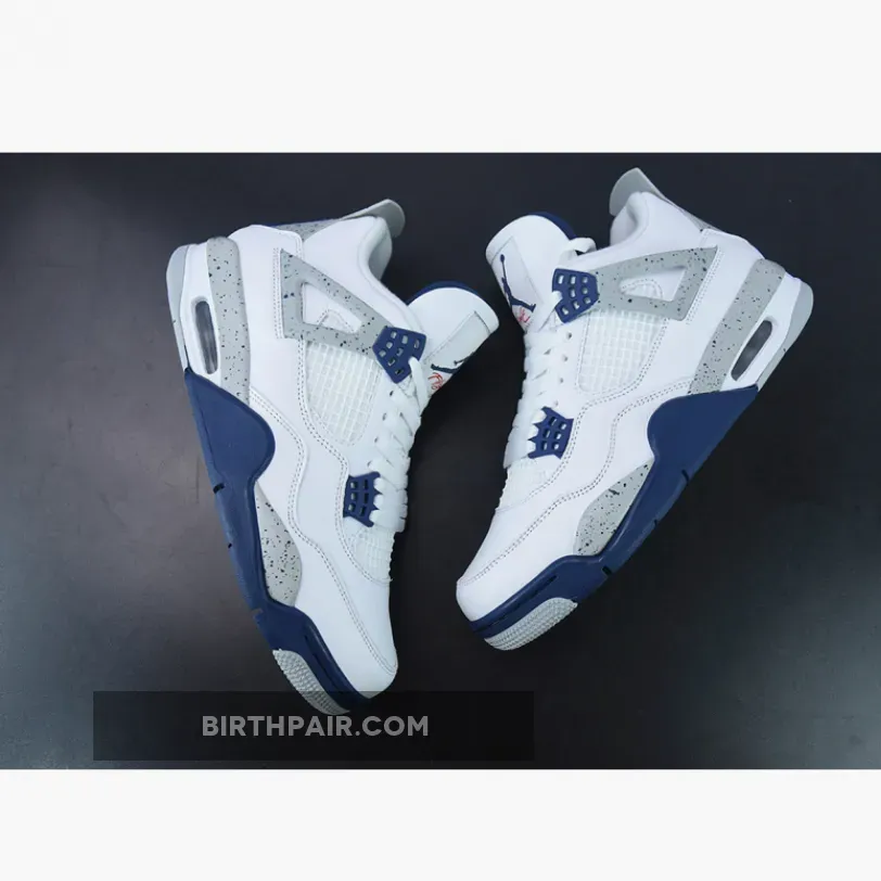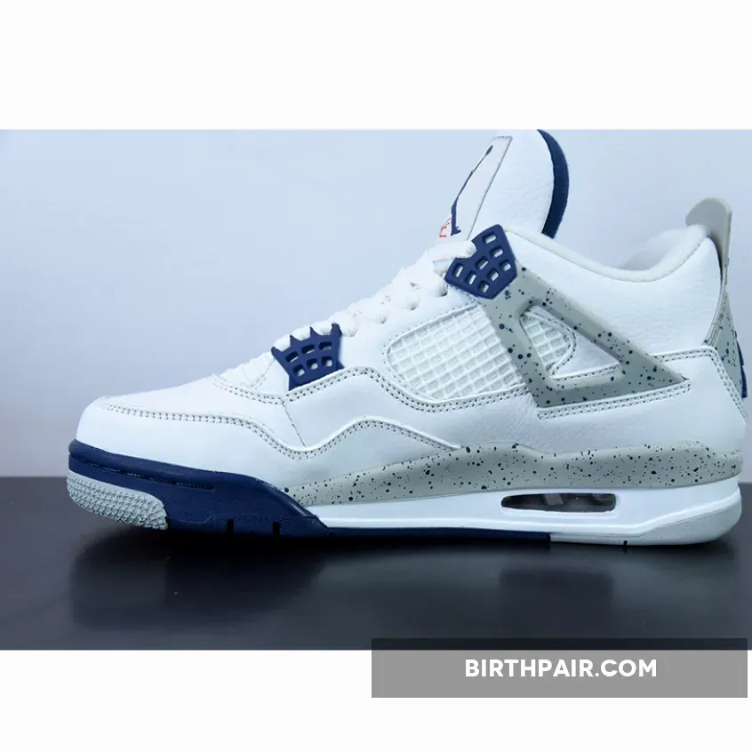 The Air Jordan 4 Retro White Midnight Navy dresses in white, midnight navy, and light smoke grey colorway.