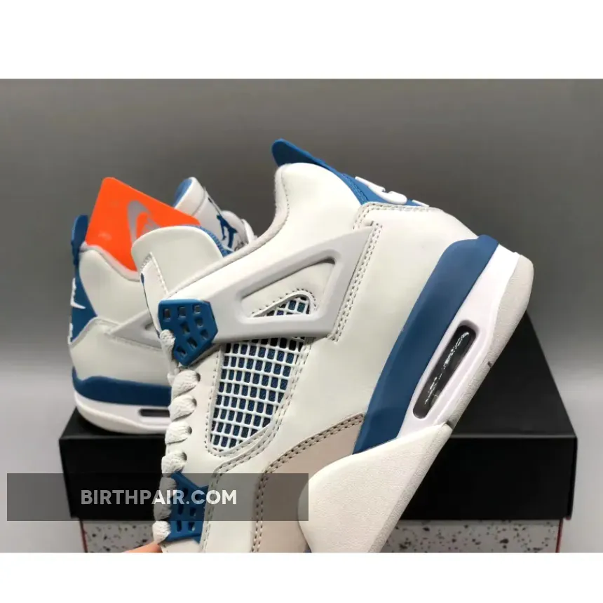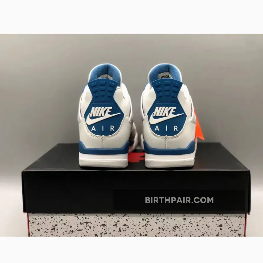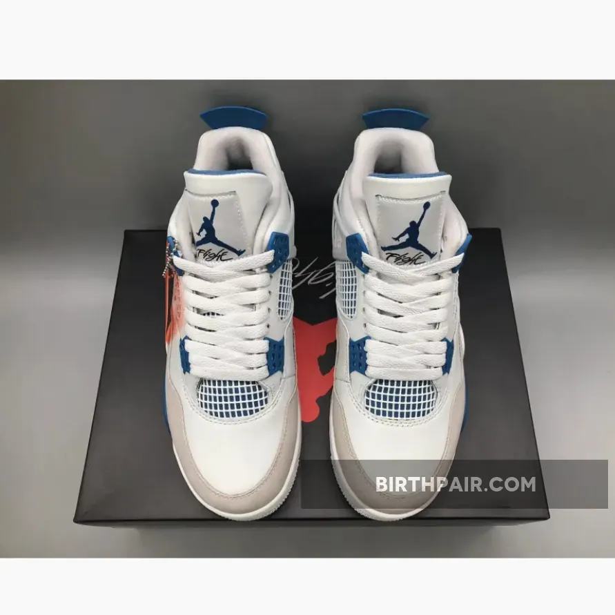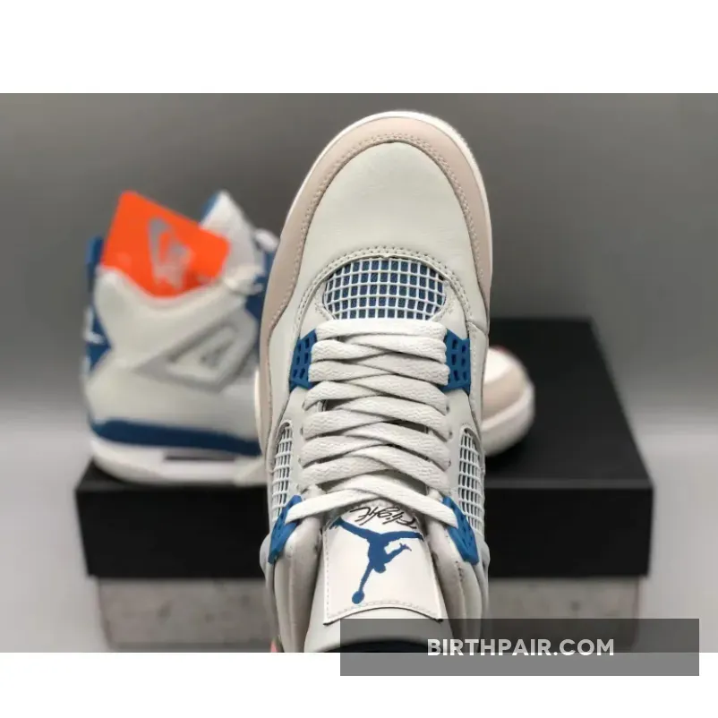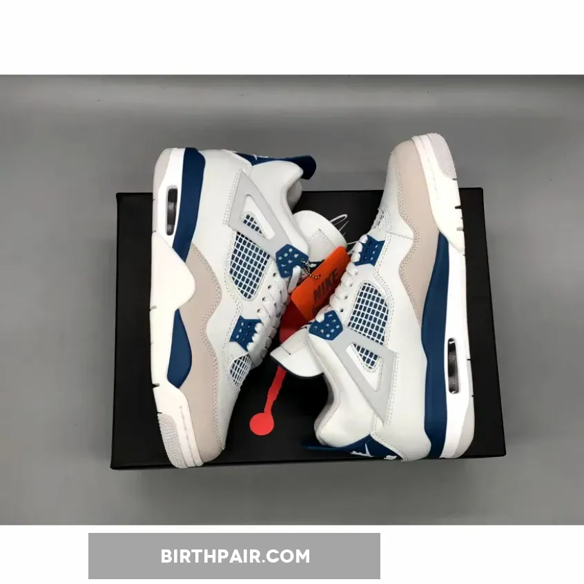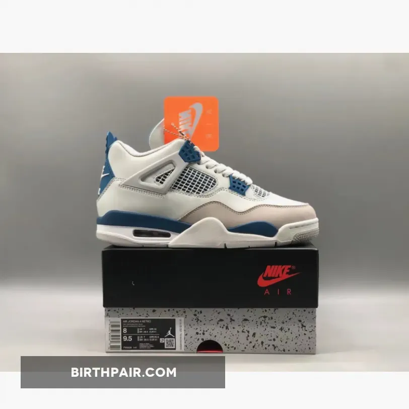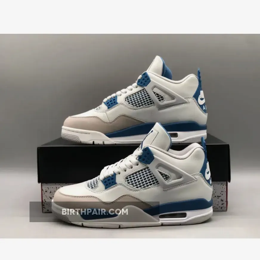 The Air Jordan 4 showcases a timeless color scheme consisting of Off-White, Military Blue, and Neutral Grey. Its upper is crafted from Off-White leather with overlays in Neutral Grey adorning the toe area. The quarter panel is equipped with a “Military Blue” underlay and topped off with the AJ4’s signature net. The design is elevated by Military Blue accents on the eyelets, midsole, heel tabs, and Jumpman logos on the tongues. Adding to the authenticity, the heels bear “Nike Air” branding in White, while a White, Blue, and Grey rubber outsole completes the overall aesthetic.