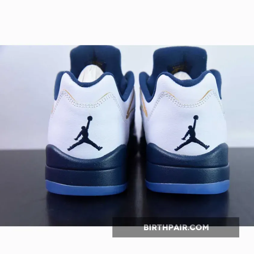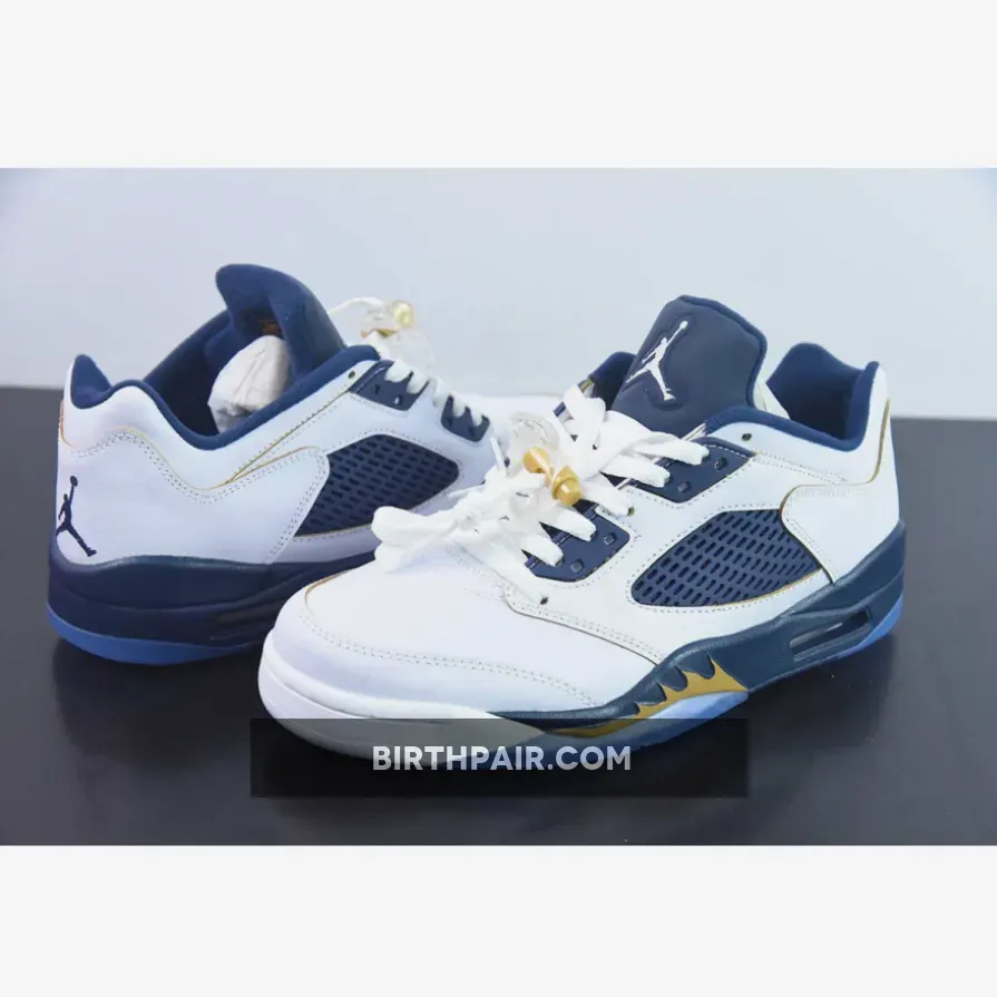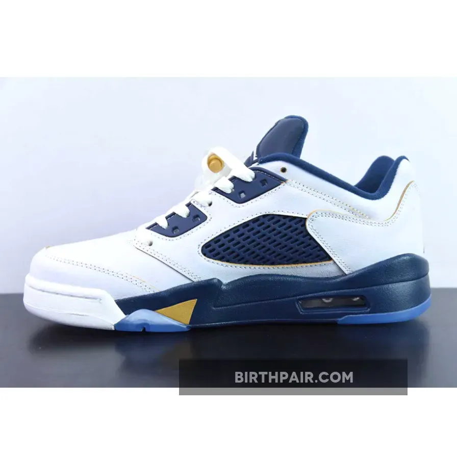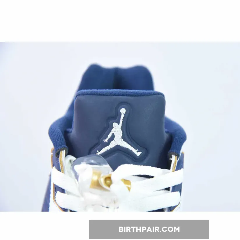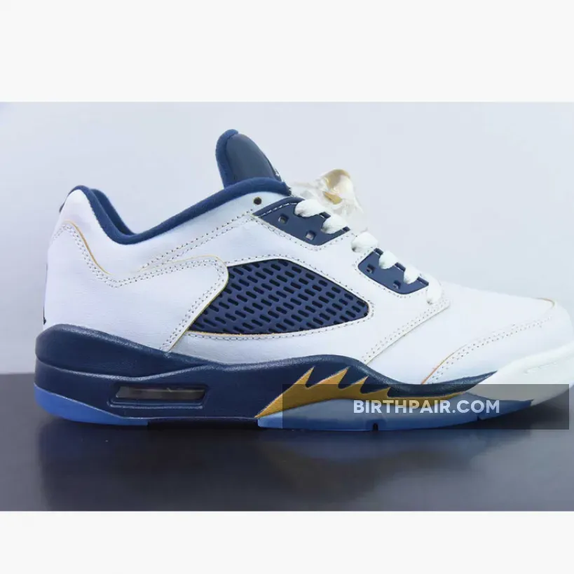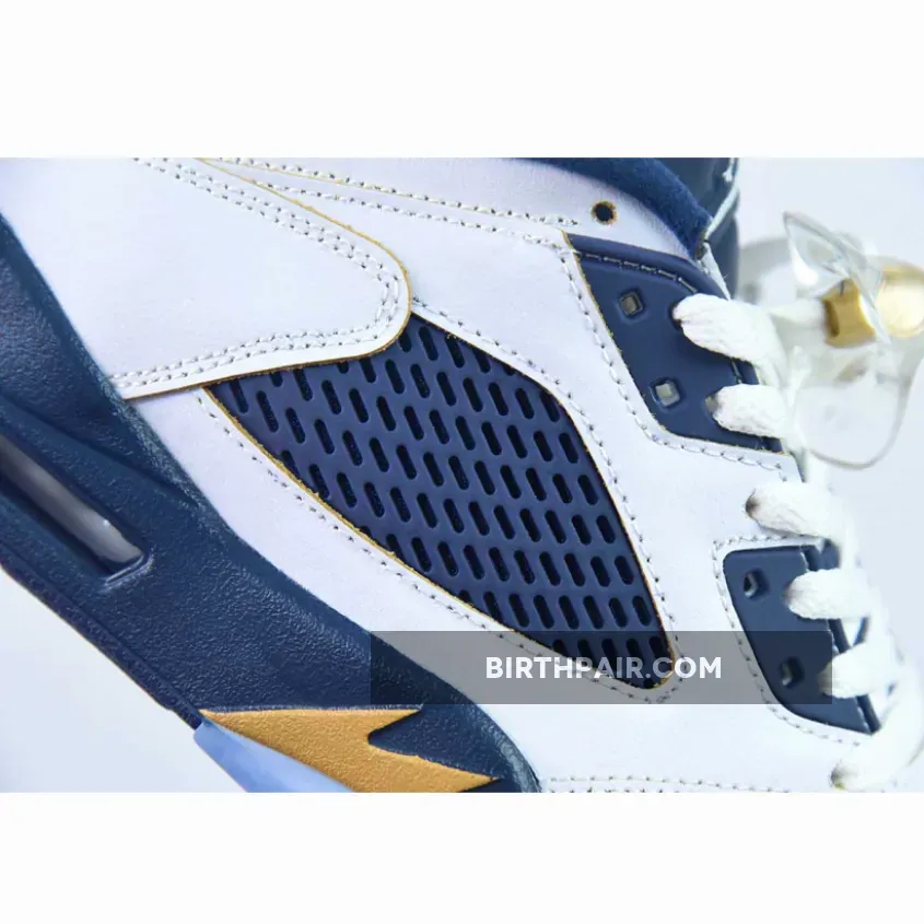The Dunk From Above colorway features a predominantly white color scheme with Metallic Gold accents and shades of Midnight Navy for added contrast. It retains the classic Jordan 5 design elements like a lace lock system, a shark-tooth design on the outer midsole, and mesh panels on the sides. As for branding, the shoe has a Jumpman logo on the tongue and another on the heel.