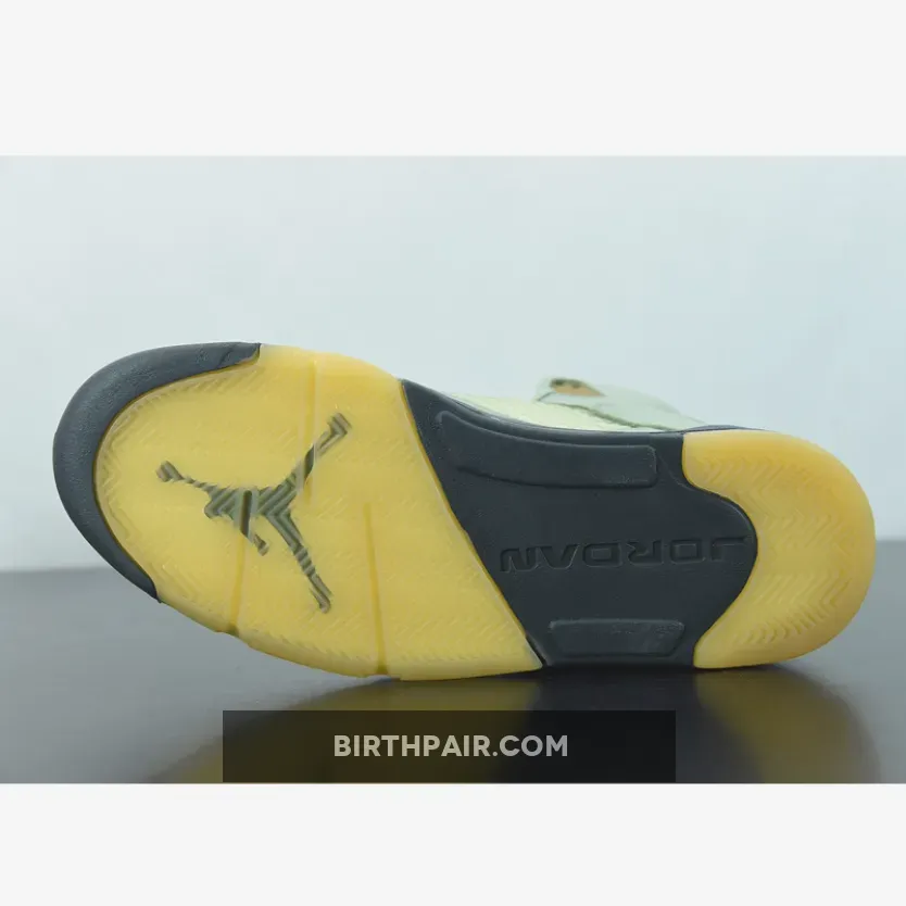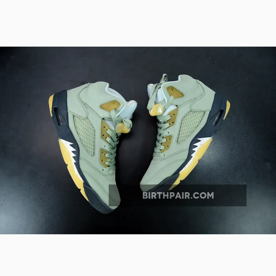 The Air Jordan 5 Jade Horizon features a Jade Horizon leather upper with seemingly oxidized TPU netted inserts, eyestays, and lace-locks for a broken-in look. A black midsole with Cement shark-teeth detailing pays homage to the original Air Jordan 5 Metallic. Although this Jordan 5 is brand new, it ditches the icy, semi-translucent outsole most new Jordan 5s come equipped with for a yellowed one, emphasizing the aged aesthetic.