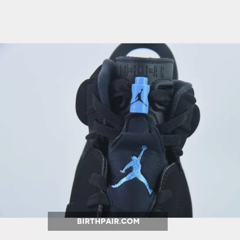 Released in December 2017, the Air Jordan 6 Retro ‘UNC’ paid tribute to North Carolina’s 2017 NCAA win. The colorway comes with a black nubuck upper with University Blue on the tongue, Jumpman, lacelock, and back pull tab.