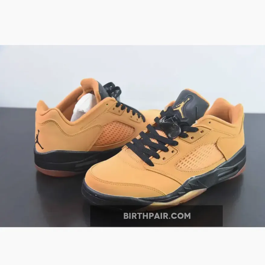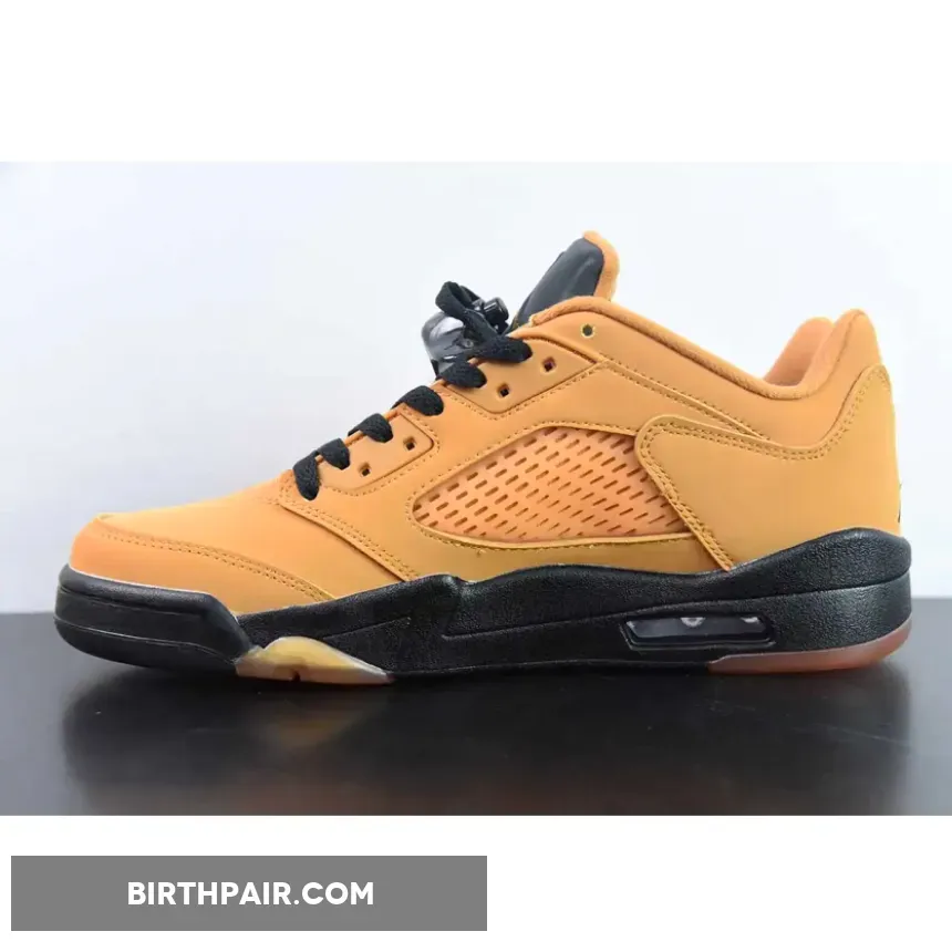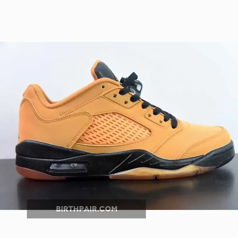 This low-cut AJ5 has a smooth leather upper in the titular dark yellow Chutney from heel to toe. Even the mid-panel translucent TPU mesh netting also follows the same hue. Bright red joins the mix of colours on the lace-lock accent and the embroidered Jumpman on the tongue. The leather tongues are in contrasting black. Utilizing Chutney on the base and liner while Black adorns the tongue, laces, and midsole. Finishing the look is a translucent outsole.