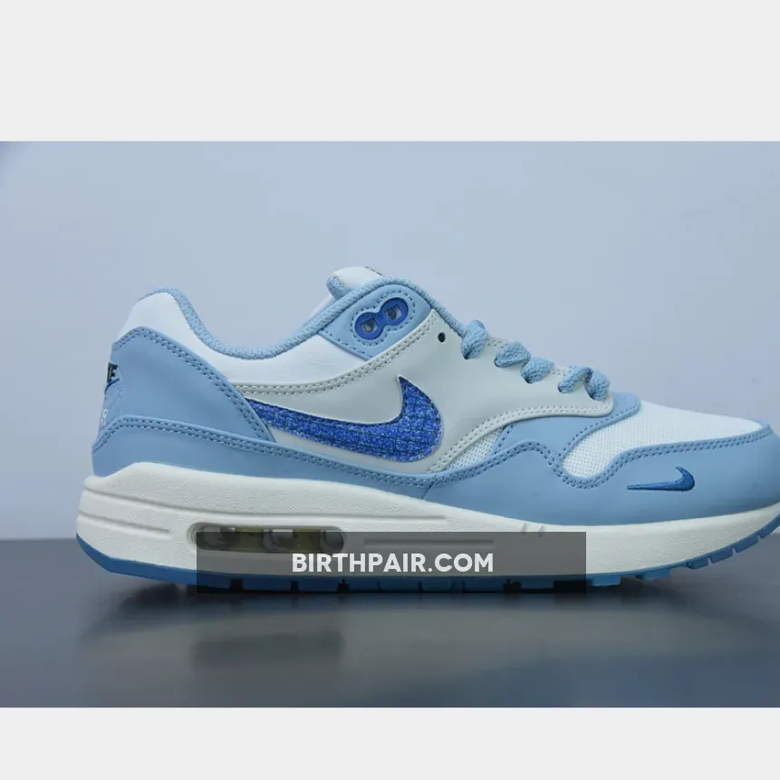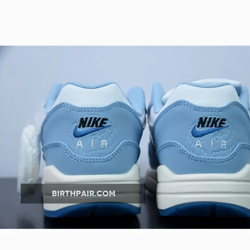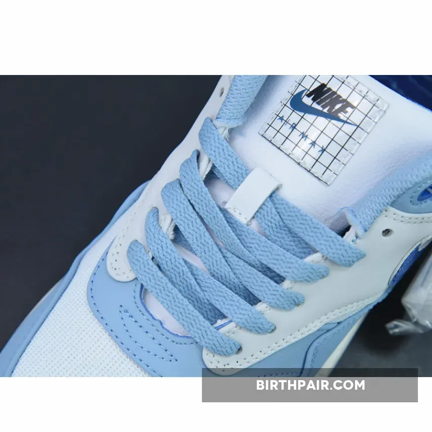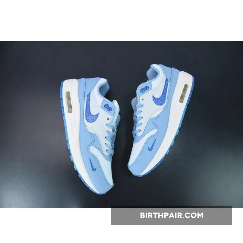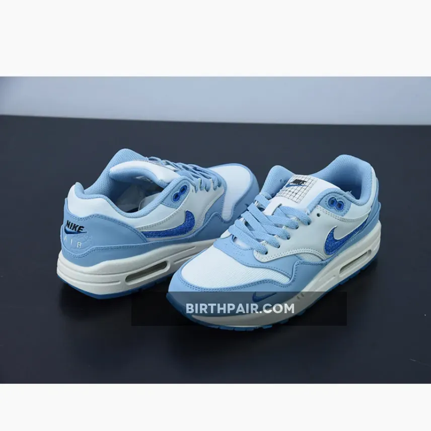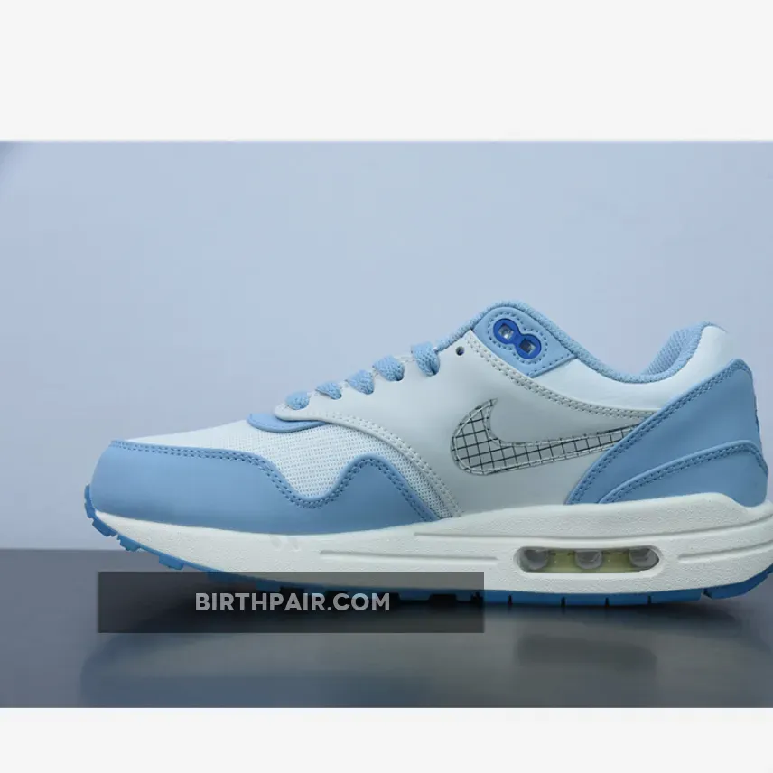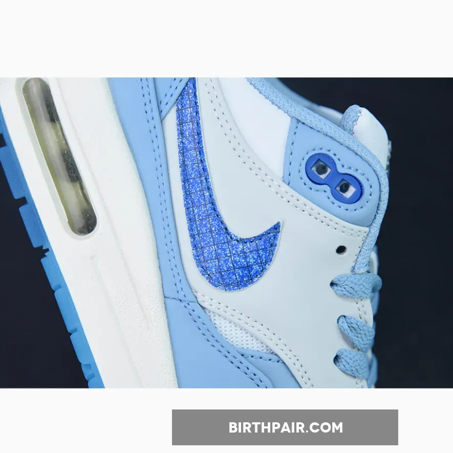 Azure blue Swooshes with geometric patterns adorn the side panels, while baby blue animates the mudguard and heel tab of this Nike Air Max 1.