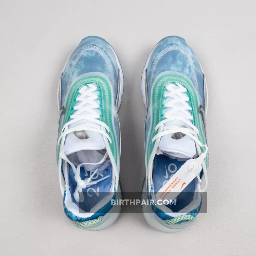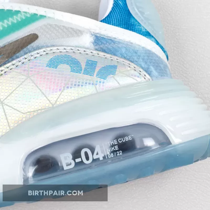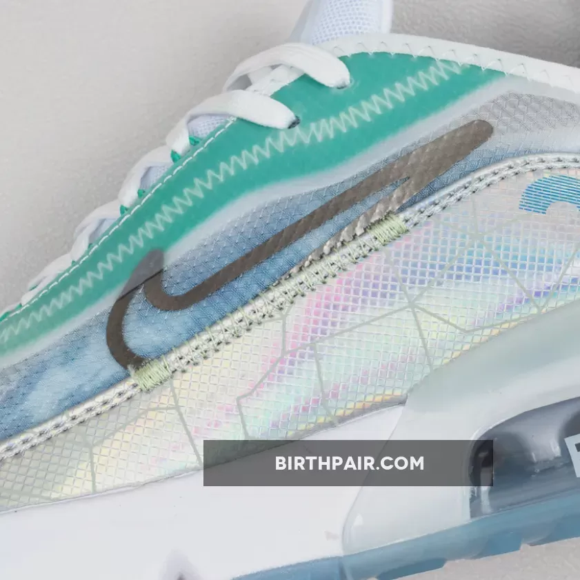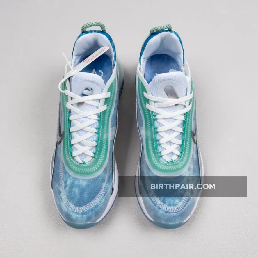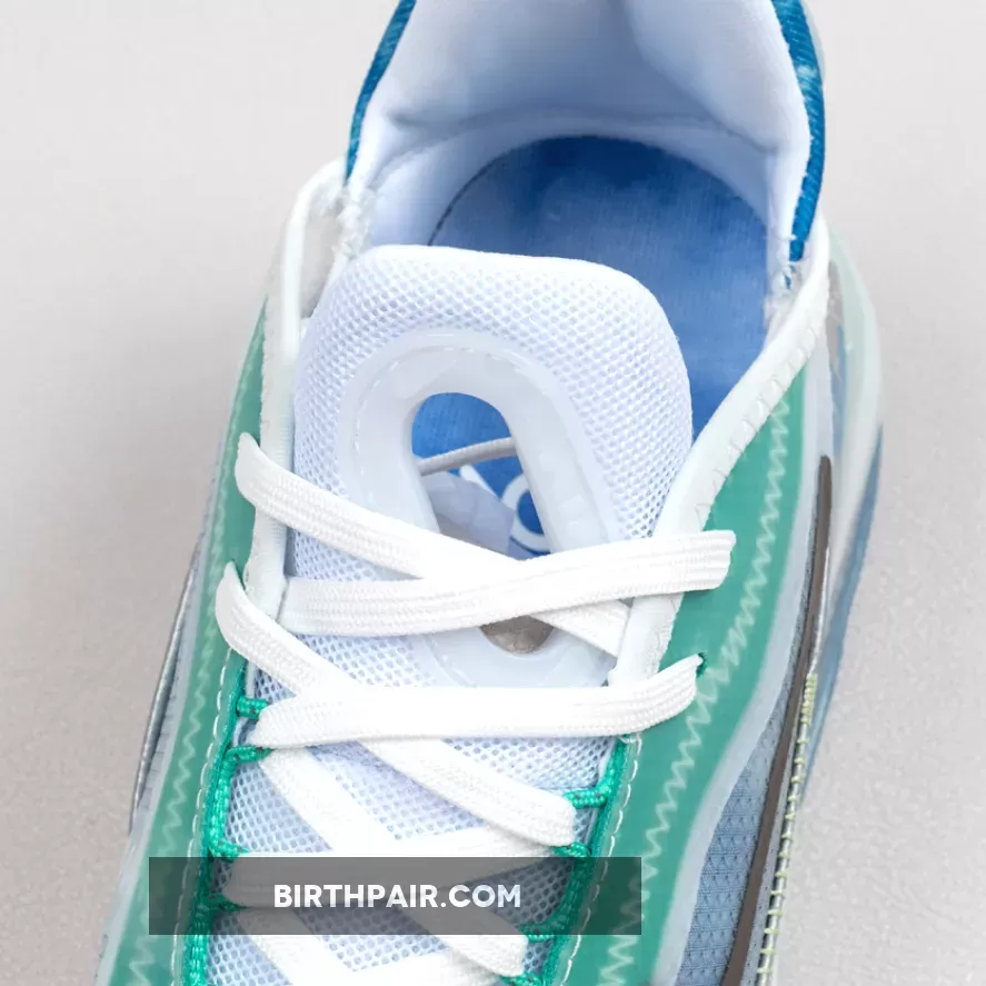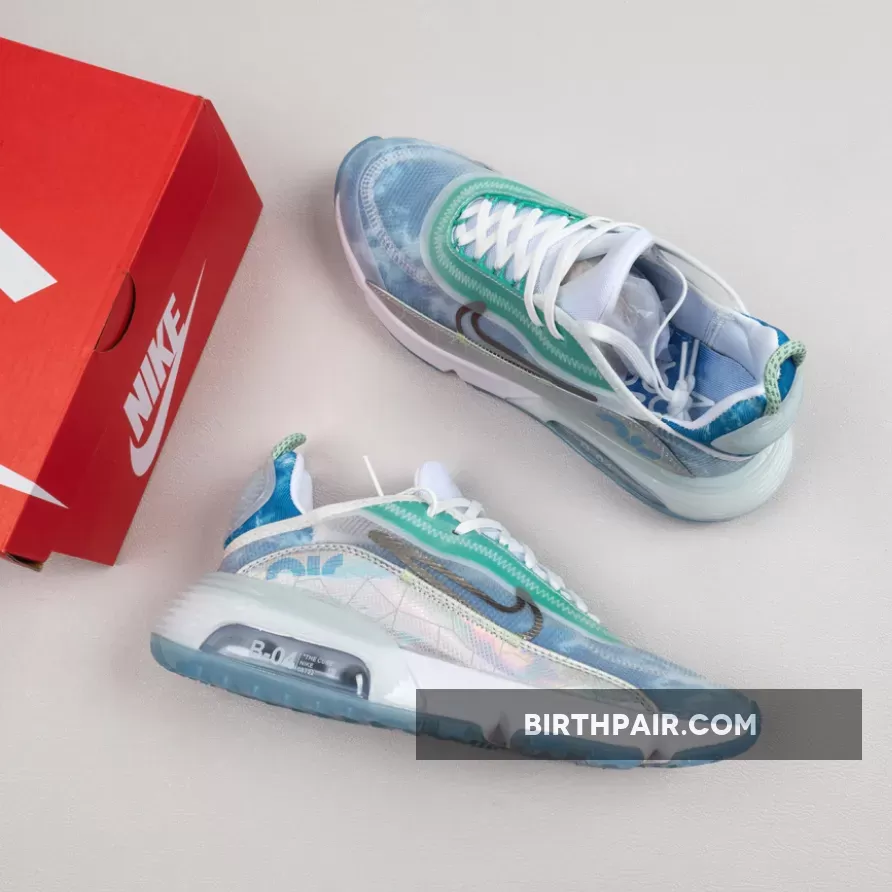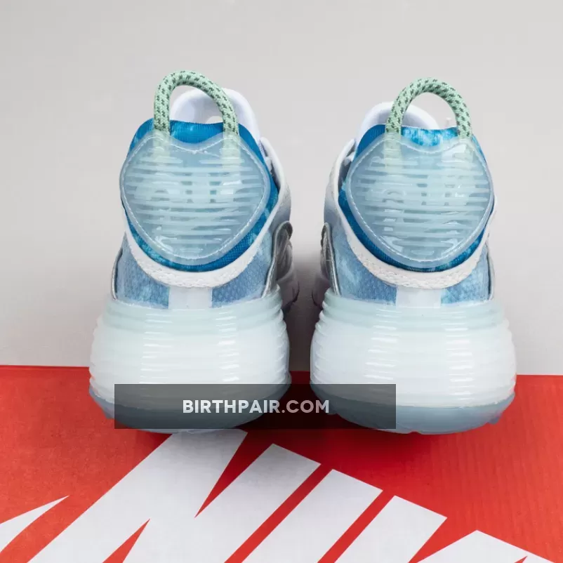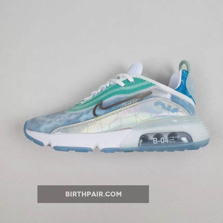 This women’s Nike Air Max 2090 features a White, Glacial Blue, and Metallic Silver color combination. Firstly, the pair comes with geometric patterns in shades of Blue with a coating covering the upper. The two elements make what resembles the shape of the Beijing Water Cube. Also, Max Air cushioning allows for this pair to be laced-up for hours. Lastly, an icy Blue translucent outsole finishes the look.
