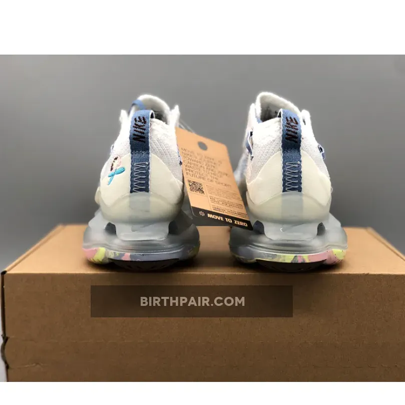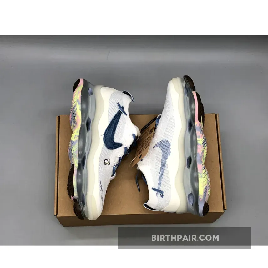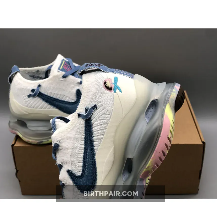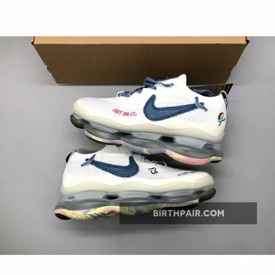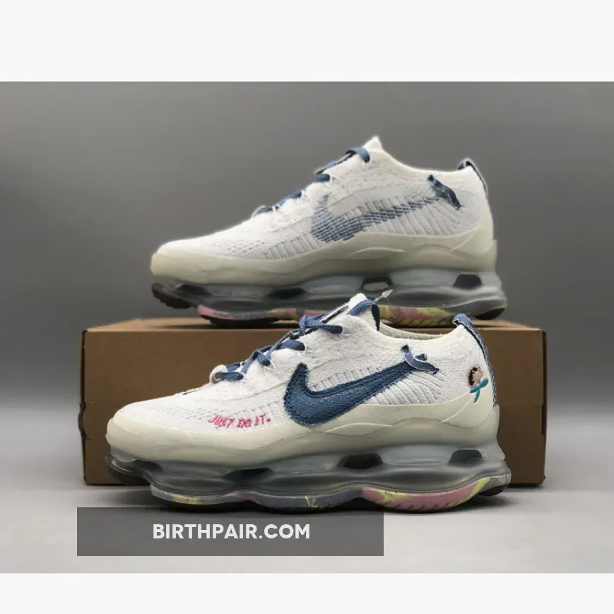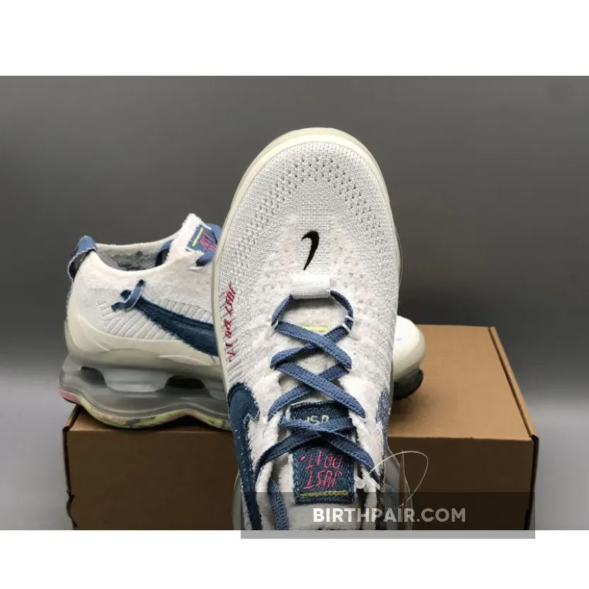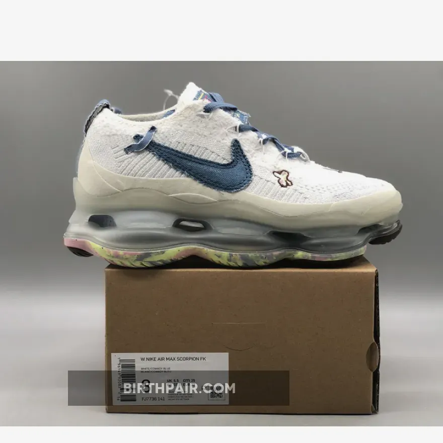 The “Just Do It” iteration of the Nike Air Max Scorpion comes dressed in a White and Blue Whisper color scheme. It features a Flyknit upper with Swooshes utilize blue with the lateral Swoosh taking on a new shape with layers of visible stitching.