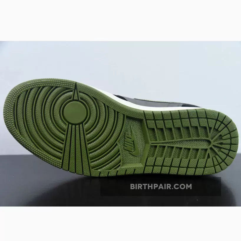 Exploring a pitch-dark composition illuminated by jack-o-lantern hues, the suede and nubuck dominant upper extends jet-black and dark grey panels throughout. Light Olive takes center stage on the leather Swooshes, heels, and rubber outsole, providing a striking contrast. Bright Orange laces and a Wings logo in the rear add an extra pop of color.