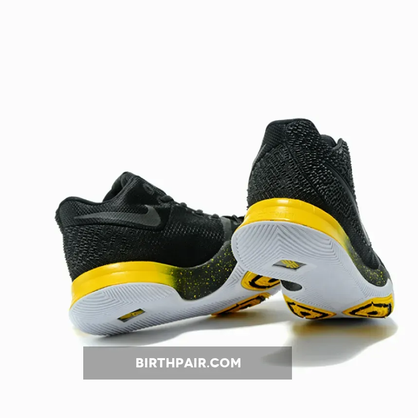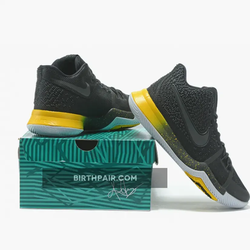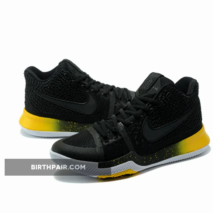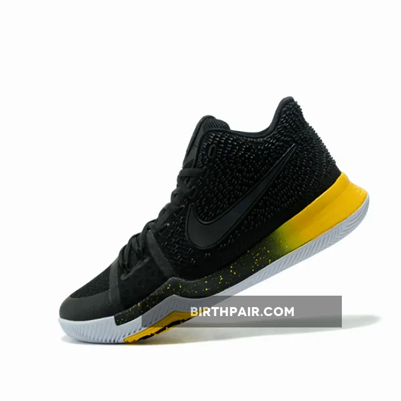 Covered in Black throughout the entire upper, this Nike Kyrie 3 is contrasted with hits of yellow on the back of the midsole, as well as via the speckling that also appears on the midsole.