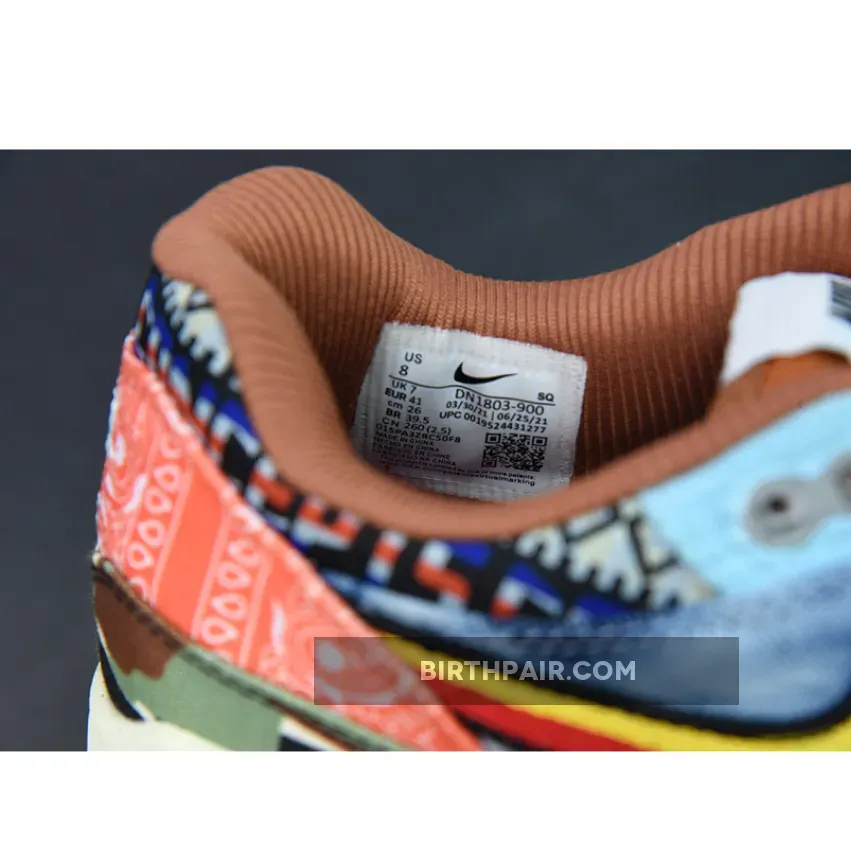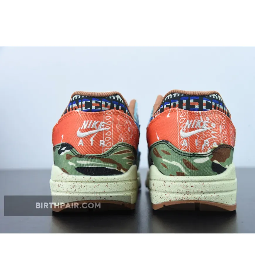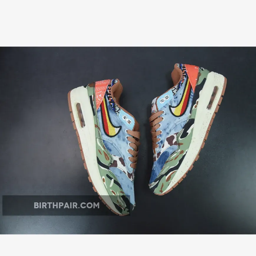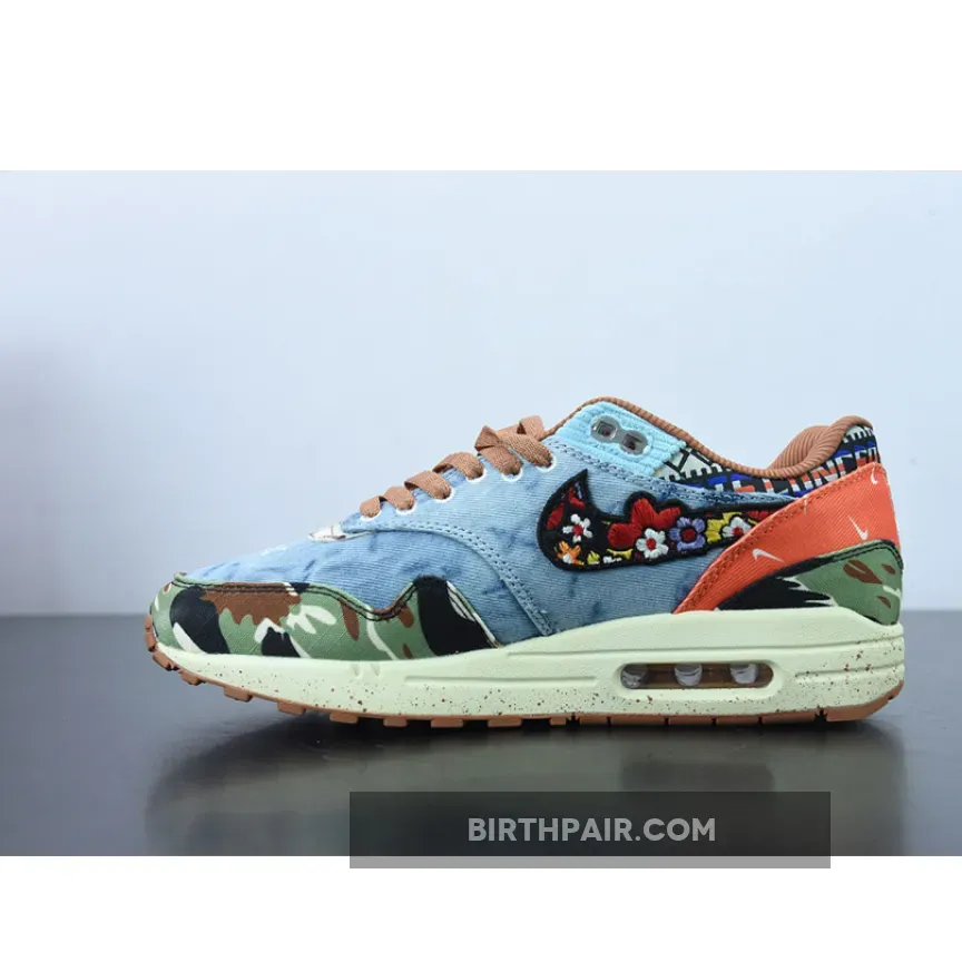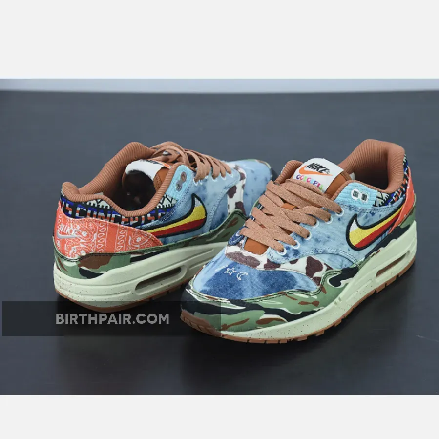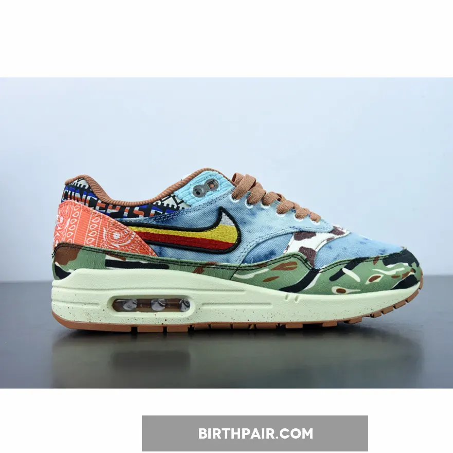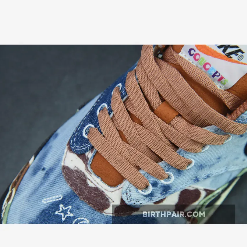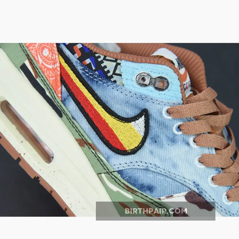 The Concepts x Nike Air Max 1 “Heavy” celebrates the iconic AM1 silhouette’s 35th anniversary by paying homage to 60s and 70s inspired design cues. Also referred to as the Air Max 1 “Denim Tiger Camo” due to the shoes mismatched and psychedelic upper, there is a lot to unpack with this sneaker.Panels of denim, tiger print, tie-dye, camo, bandana print, and a floral swoosh are all present on this collaboration. There are also incredible details throughout this shoe such as embroidery and nods to both Concepts and the Swoosh brand. Paying homage to the music of the period, the “Far Out” sneaker even comes with a hang tag in the shape of a guitar pick.