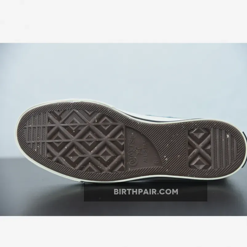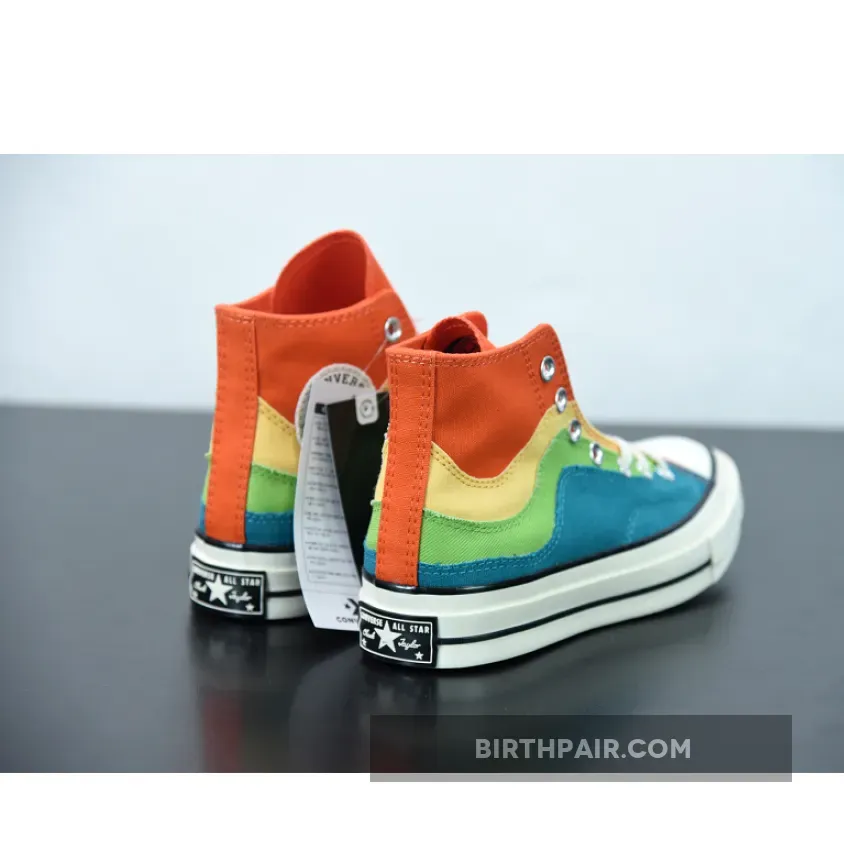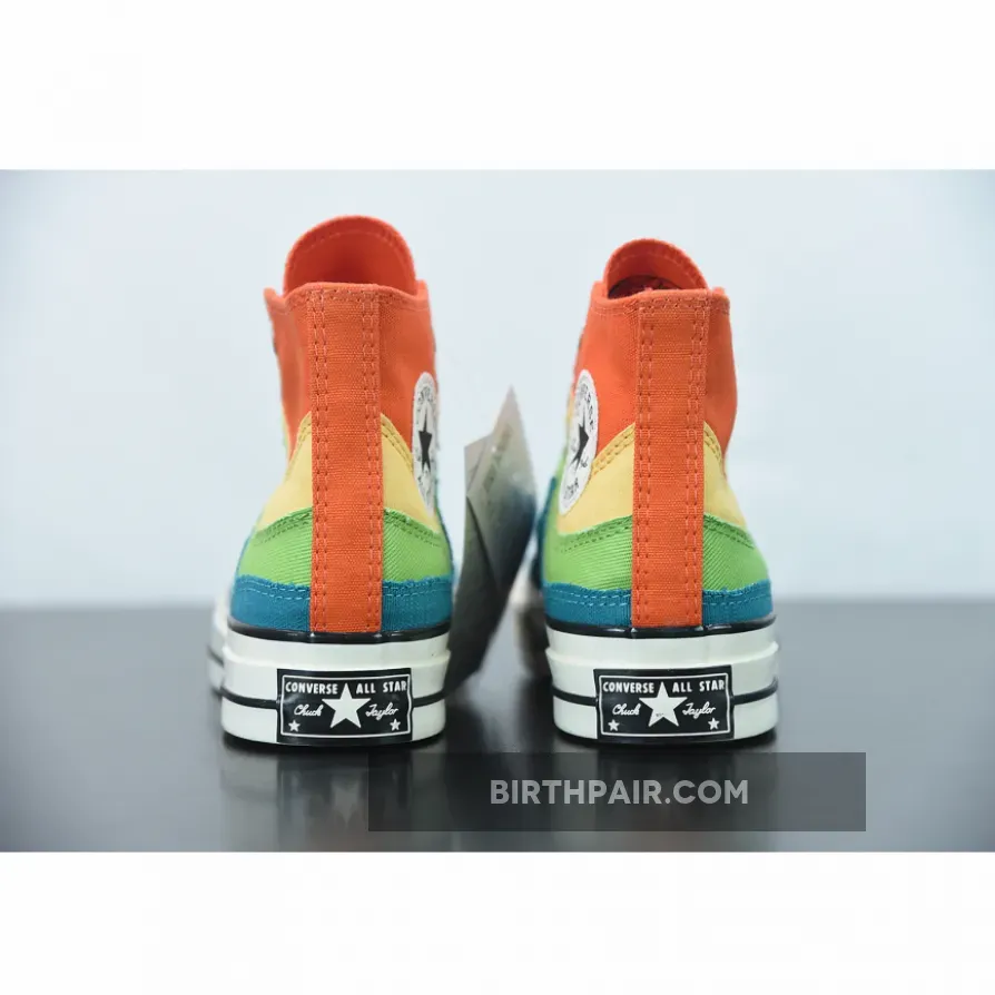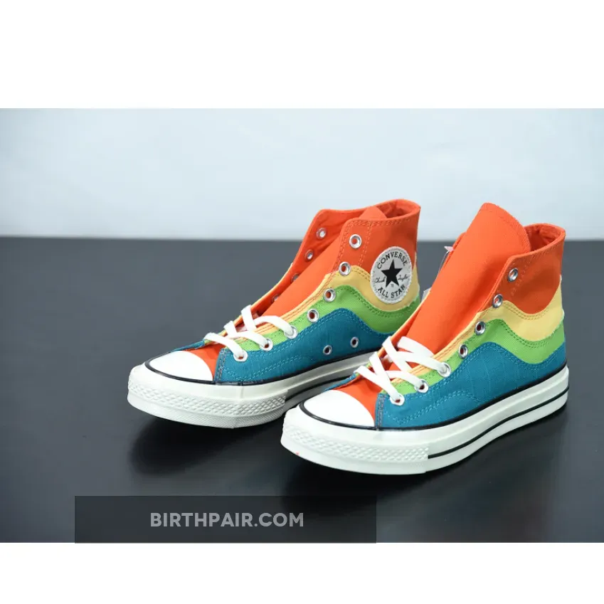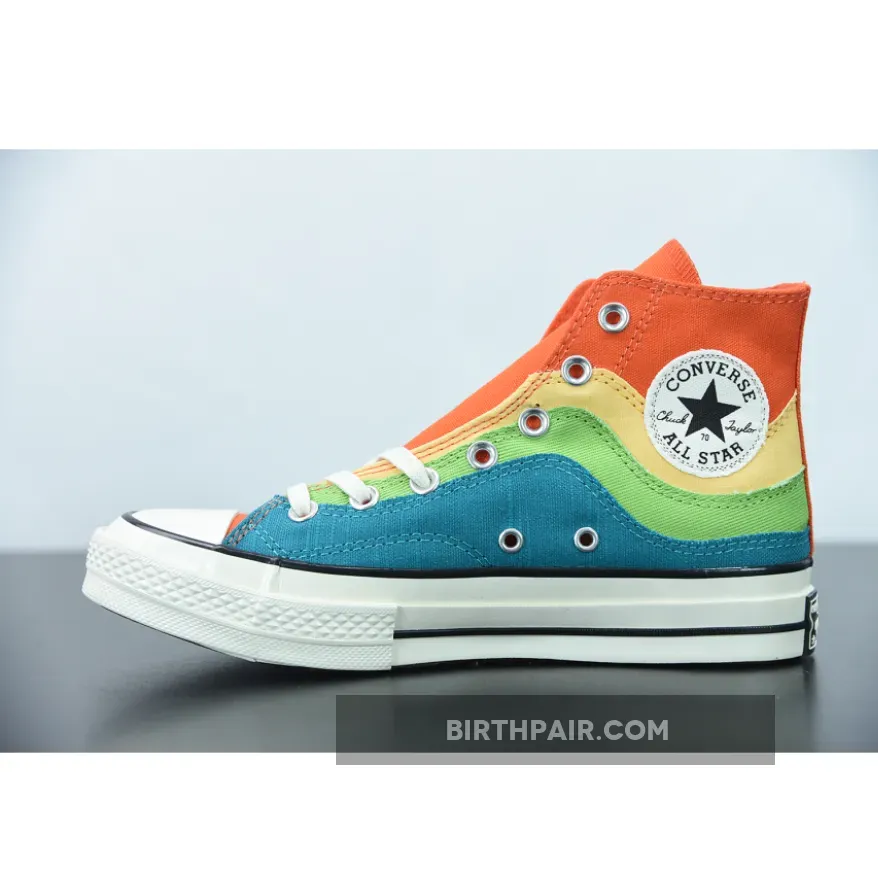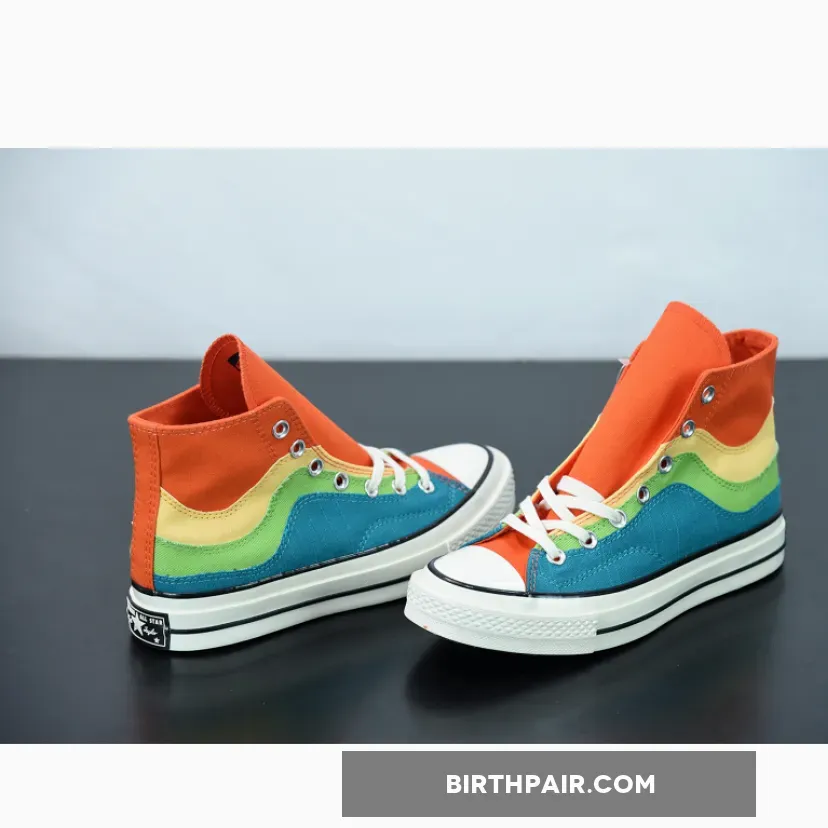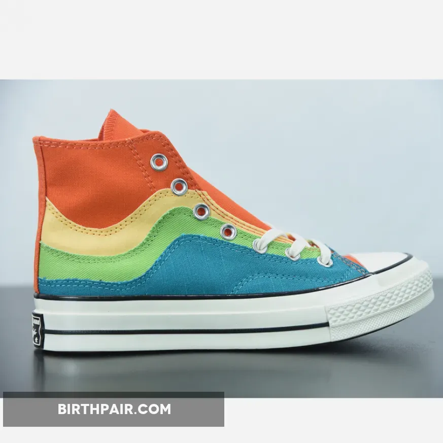 Inspired by natural landscapes, the Converse Chuck 70 High ‘The Great Outdoors’ features a multicolored, layered design that reflects the interaction between water and land at different temperatures. Recycled laces sure a canvas upper in Bright Poppy, overlaid with peach-colored ripstop, lime green twill canvas and teal slub canvas. The multi-hued assemblage rides on a contrasting white rubber midsole, supported underfoot by a regrind outsole.