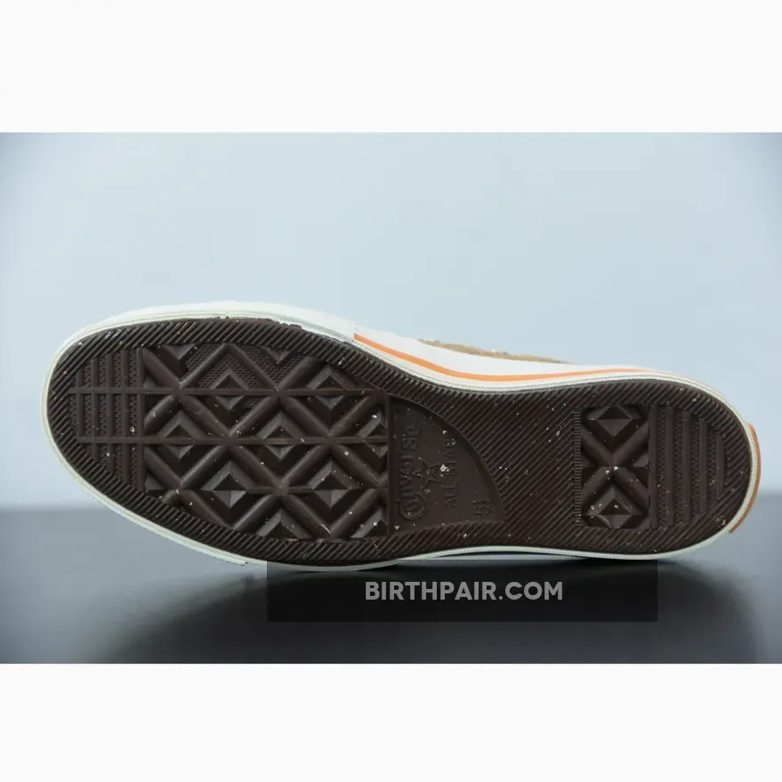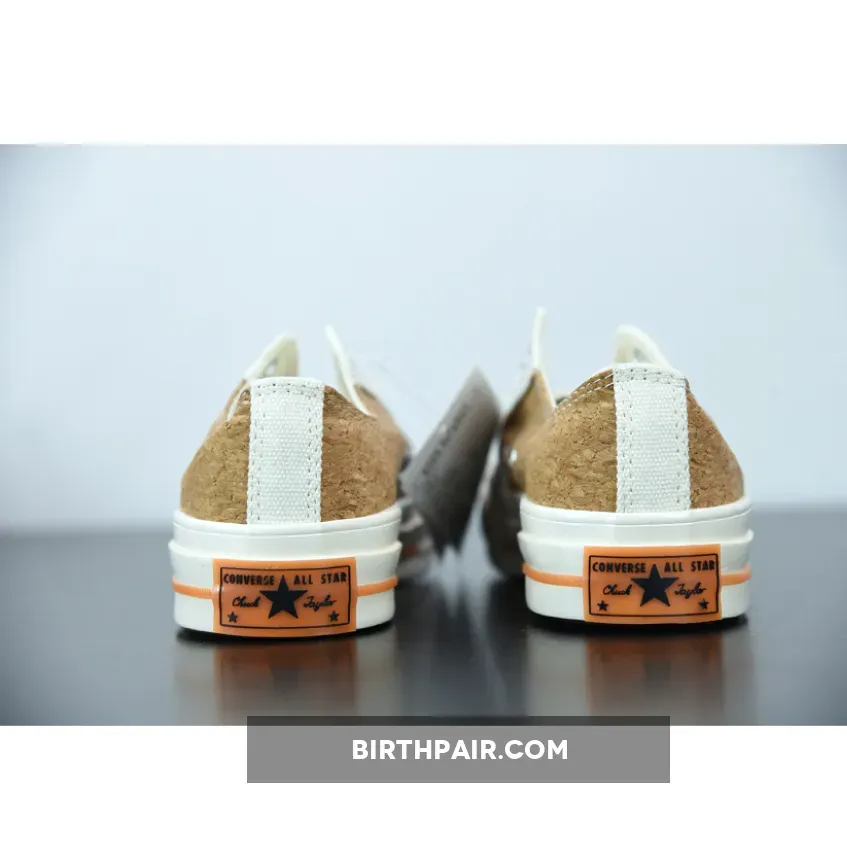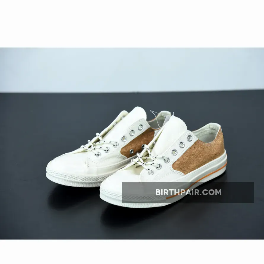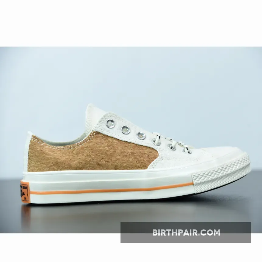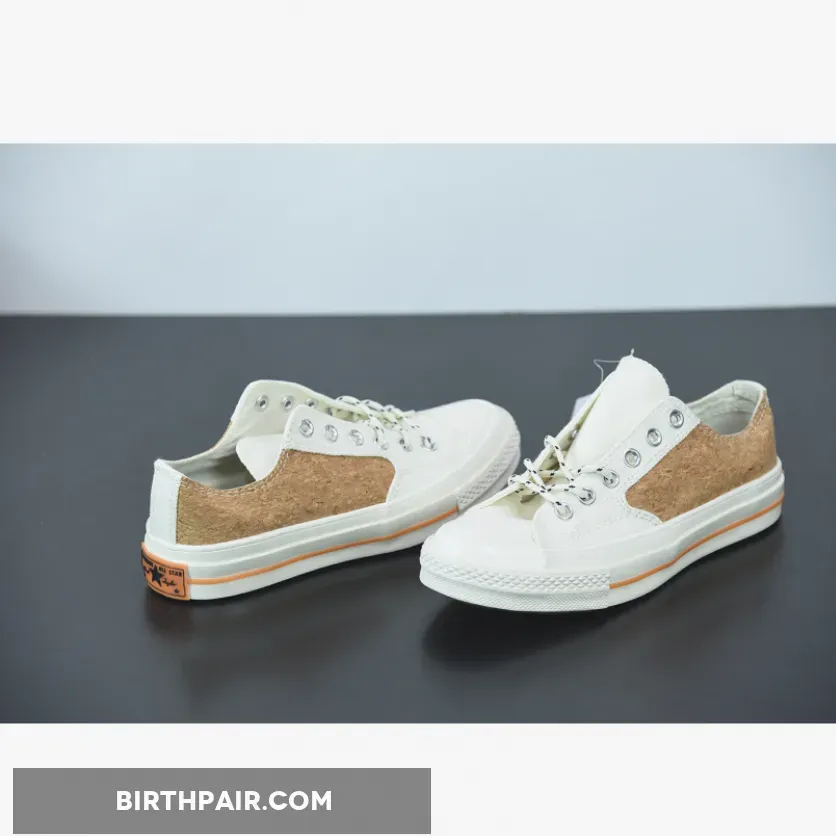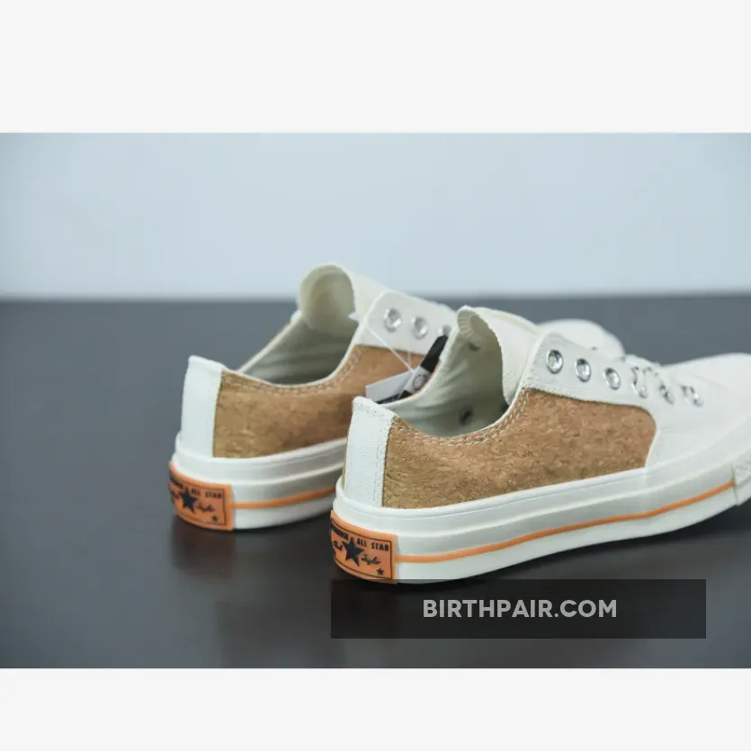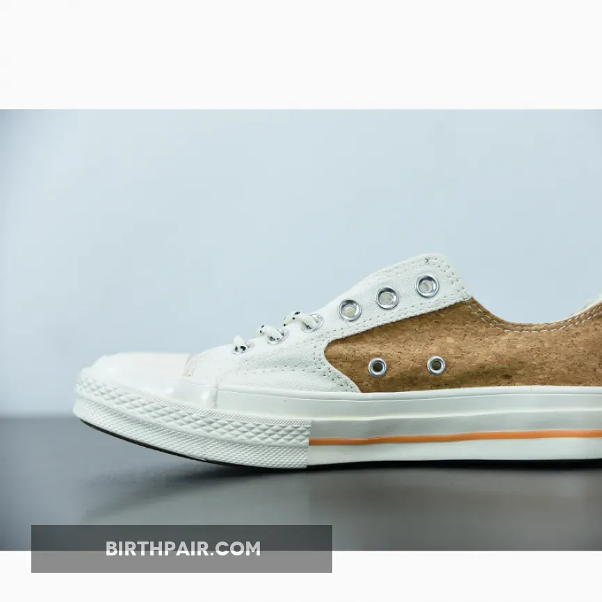 Panels of cork and neutral-colored canvas come together for an Earthy, all-natural look. Paired with egret rubber and balanced by hits of gum rubber at the pinstripe and license plate, these Chuck 70 sneakers keep it neutral in color, but not in style. Rounded, ticked laces tie it all together for an elevated look and feel.